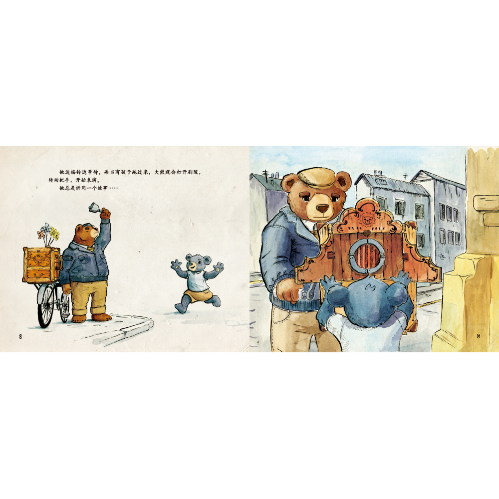 《大熊的故事剧院》熊先生有一个制造精巧的机械剧场匣子,每天带着它走街串巷为路人表演,剧场里讲述的是他自己坎坷波折的经历:熊先生、熊太太和熊宝宝本来过着简单快乐活,但突然出现的马戏团逮捕队袭击了他们的公寓,带走了熊爸爸和许多其他的动物邻居,强迫他们进行残酷的马戏团表演。在被迫与家人分离的漫长岁月里,熊爸爸在苦难中不断隐忍,终于找到了机会逃离马戏团,奋不顾身地与家人团聚……
