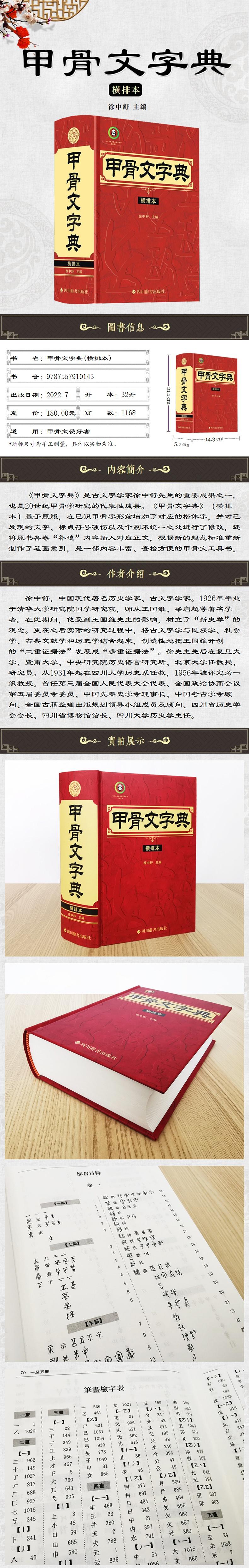 《甲骨文字典》是古文字学家徐中舒先生的重要成果之一,也是20世纪甲骨学研究的代表性成果。《甲骨文字典》(横排本基于原版,在已识甲骨字形前增加了对应的楷体字,并对已发现的文字、标点符号硬伤以及个别不统一之处进行了修改,还将原书各卷“补遗”内容插入对应正文,根据新的规范标准重新制作了笔画索引,是一部内容丰富、查检方便的甲骨文工具书。