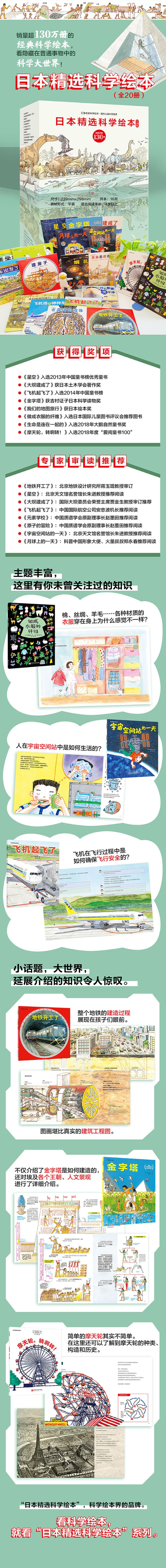本套书共20本,分别为:《地铁开工了》:让孩子了解地铁的施工方法,通过图画看到工程的每个细节。《生命是连在一起的》:从细胞、遗传因子的角度讲述了人类的起源。《火车出发了》:以全景图的形式描绘了特快列车从始发站开往终点站的全过程,一次性解答关于火车的疑问。《星空》:以星座为线索,介绍了天文学的基础知识。《大坝建成了》:以印度尼西亚希拉塔大坝为原型,讲述了大坝和发电站的修建过程。《飞机起飞了》:告诉孩子在没有任何交通标志的天空,飞机是如何安全飞行的。《元素学校》:把元素比喻成学生,介绍了每个化学元素的特点以及元素周期表的形成,是化学启蒙书。《原子的冒险》:通过对比化学实验和烹饪,让孩子初步了解原子的概念,是化学启蒙书。《烟花》:告诉孩子美丽的烟花是怎么制成的。《宇宙空间站的一天》:向孩子讲解失重等物理知识,解答了孩子对宇航员在太空生活的疑问。《金字塔》:讲解与金字塔有关的建筑、雕刻、美术、宗教......
