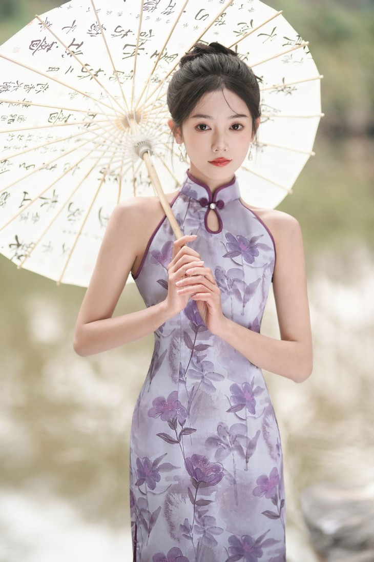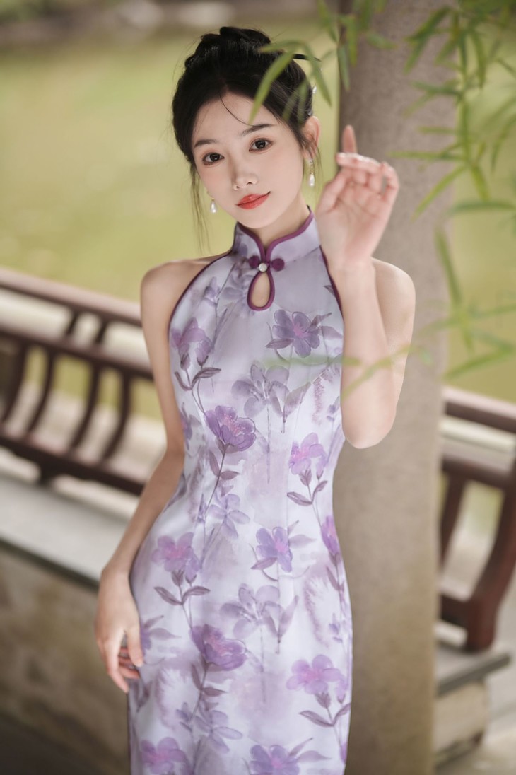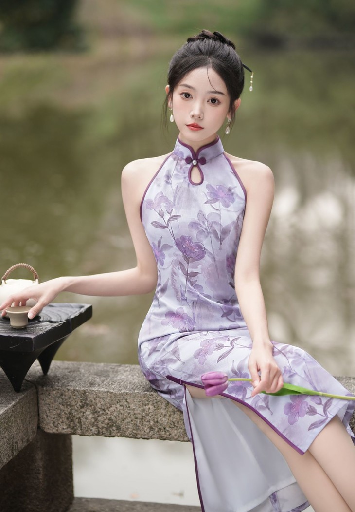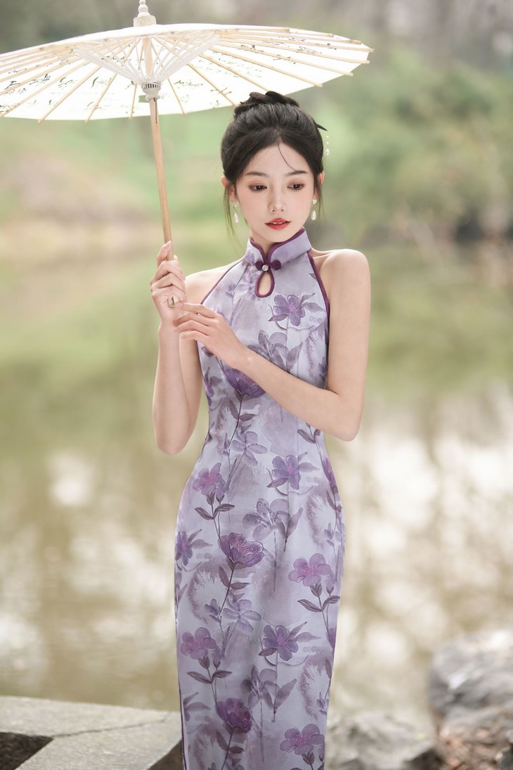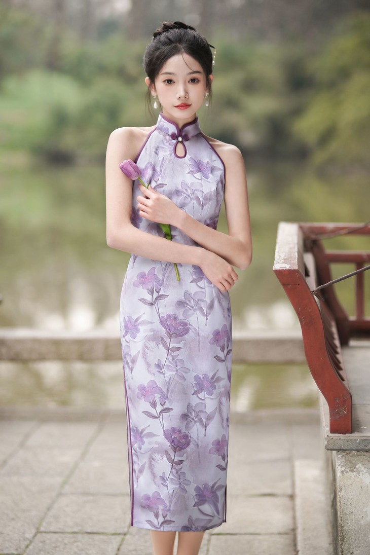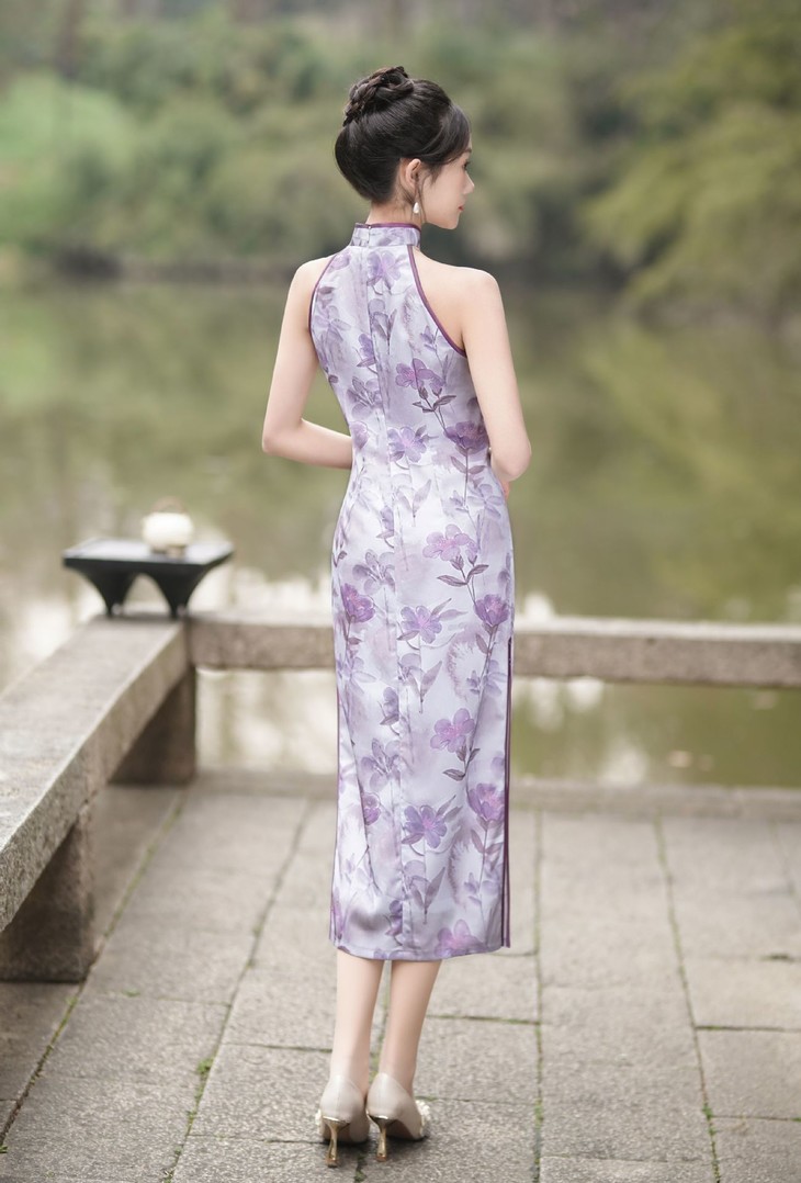 新中式改良旗袍,无袖紫色连衣裙YM3207