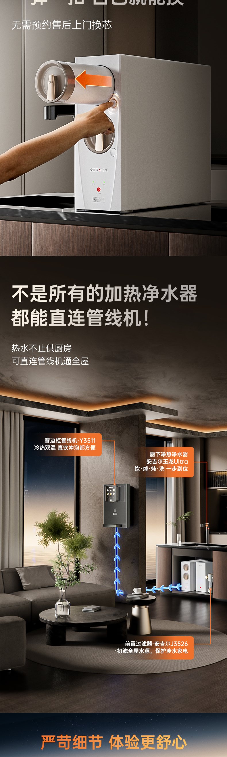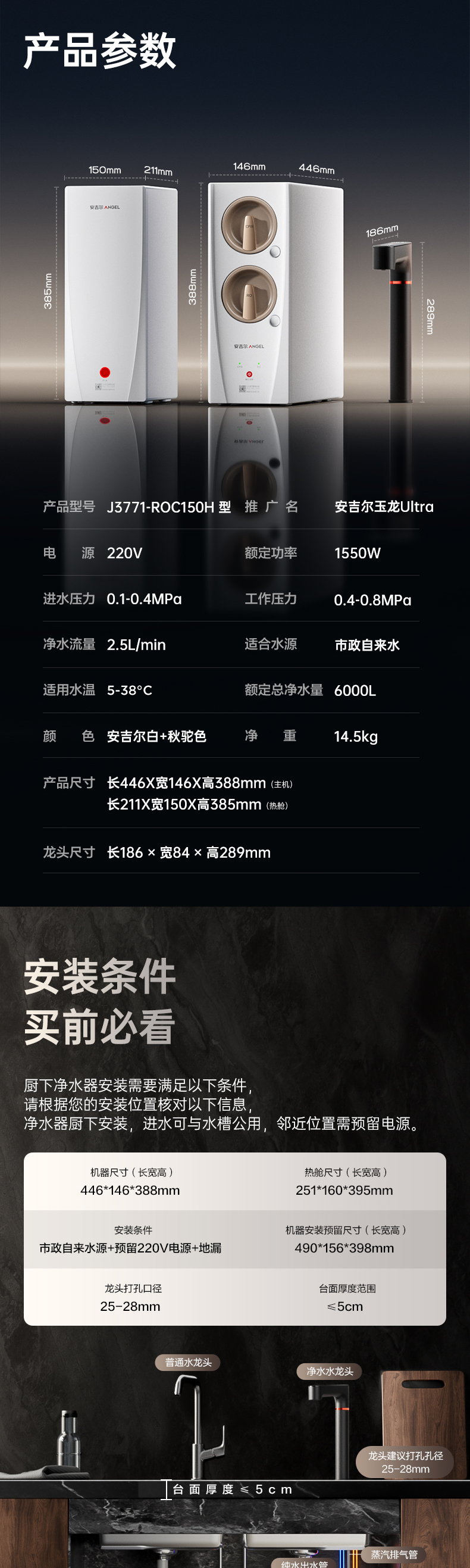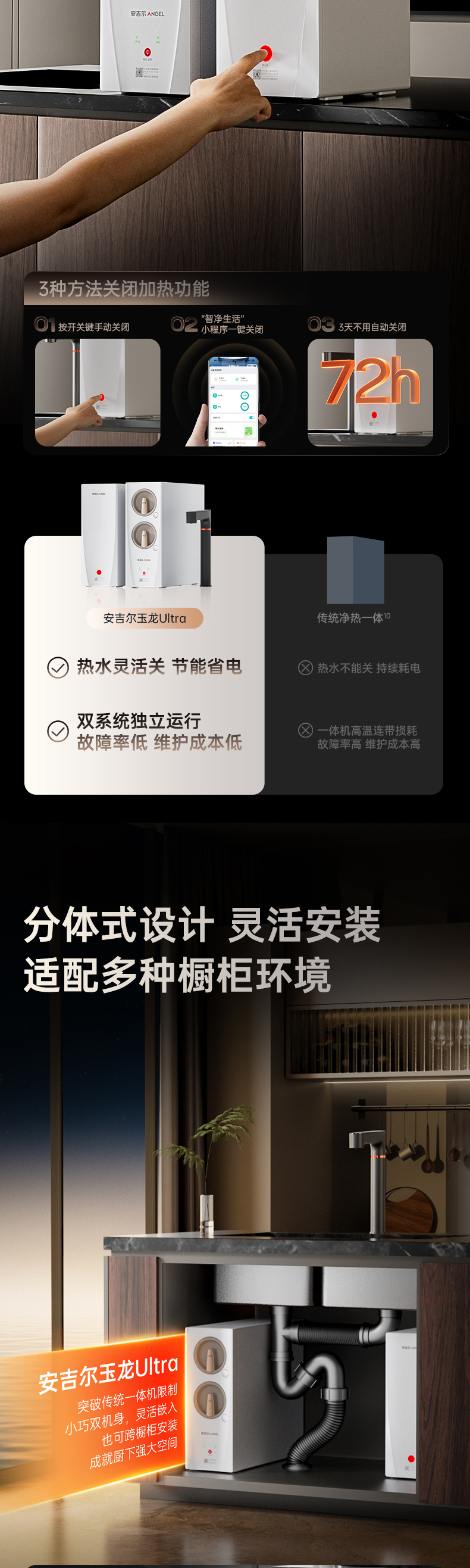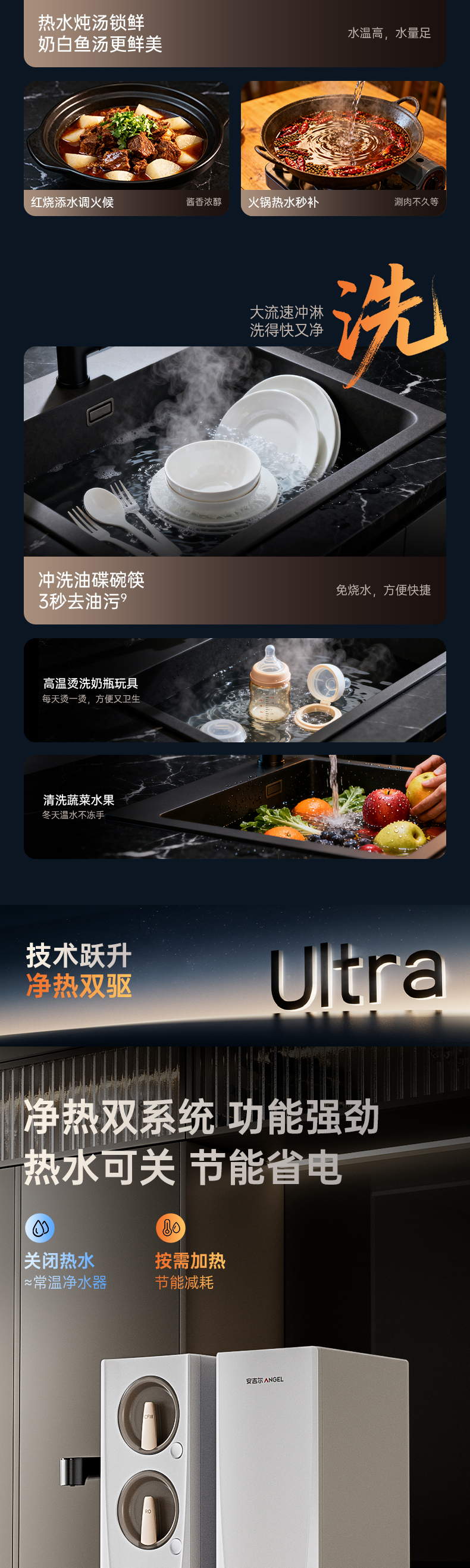 安吉尔加热净水器玉龙Ultra1200G厨下直饮机2200G温热水流速