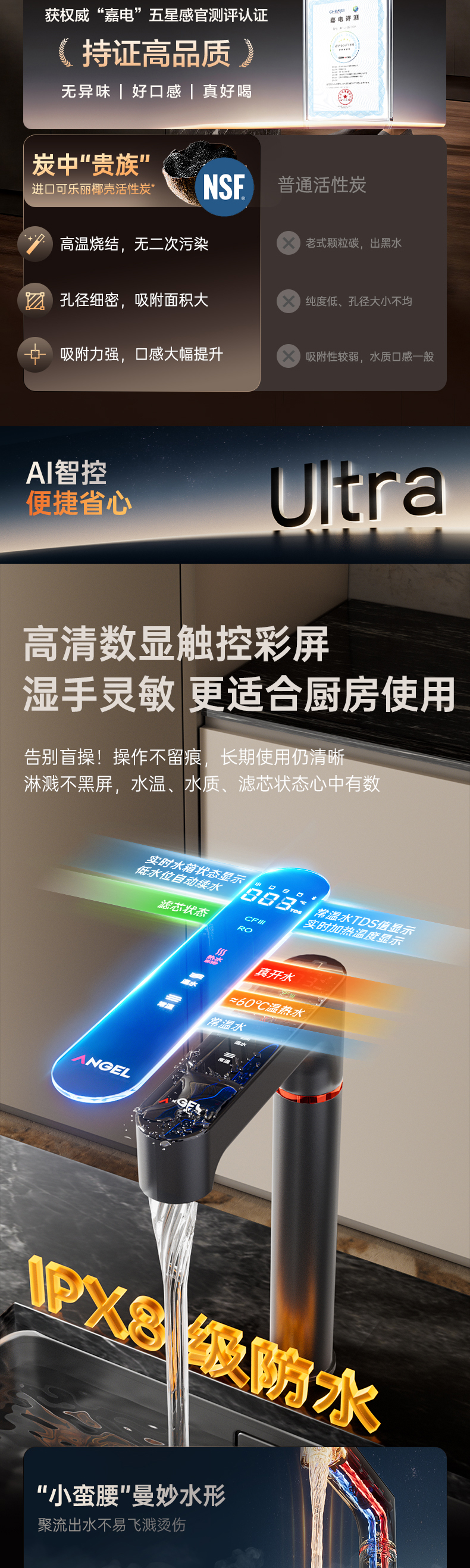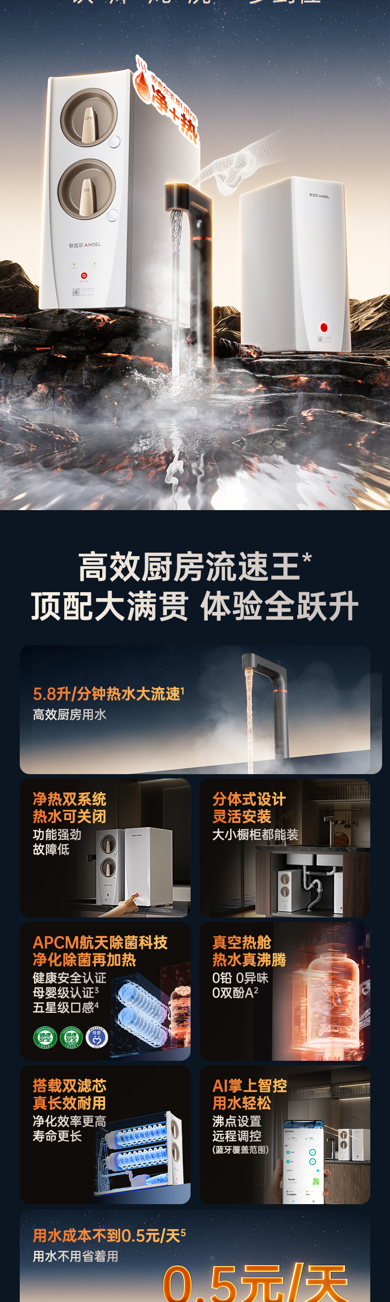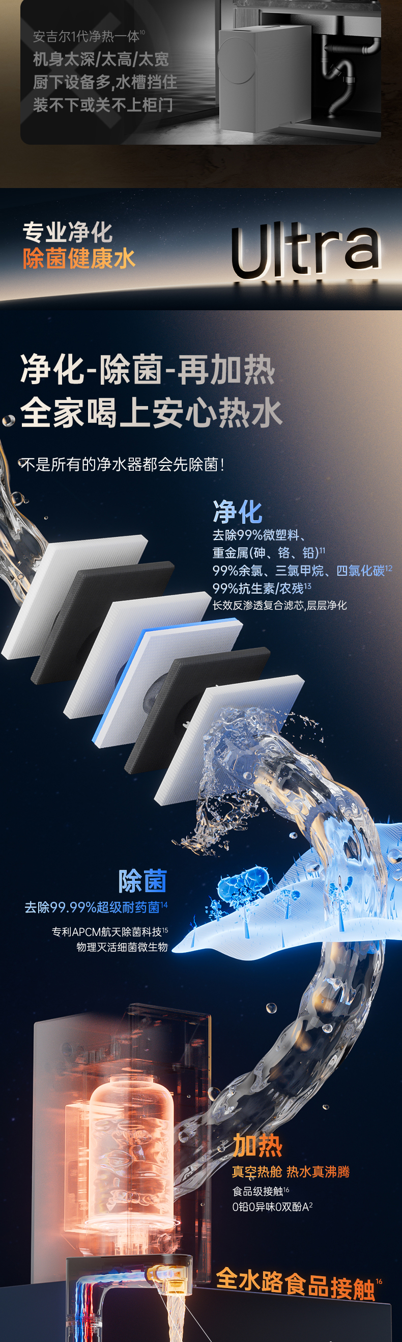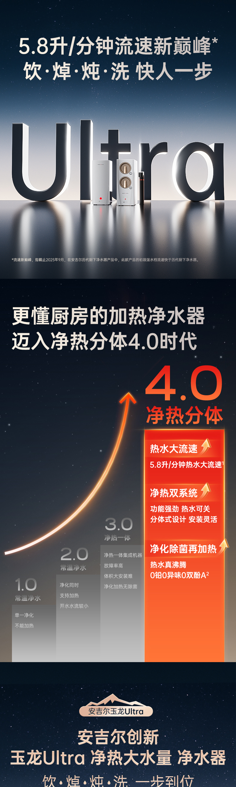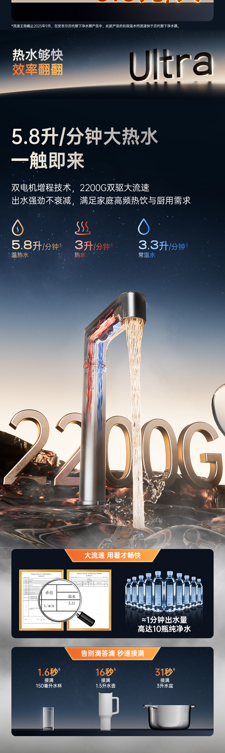 安吉尔加热净水器玉龙Ultra1200G厨下直饮机2200G温热水流速