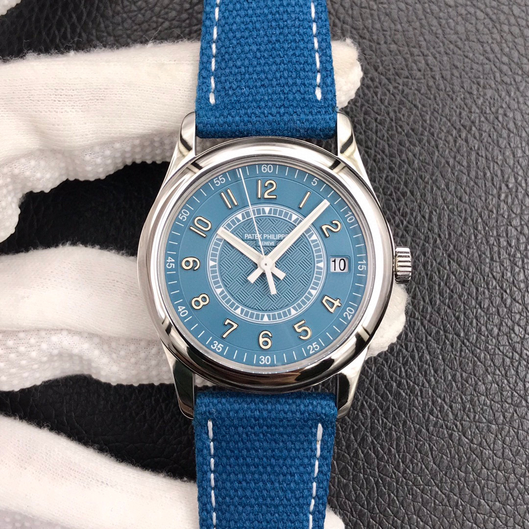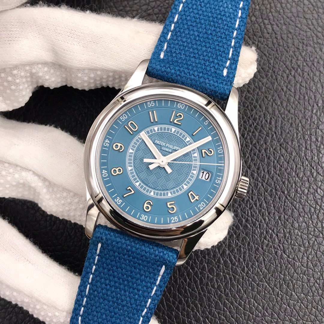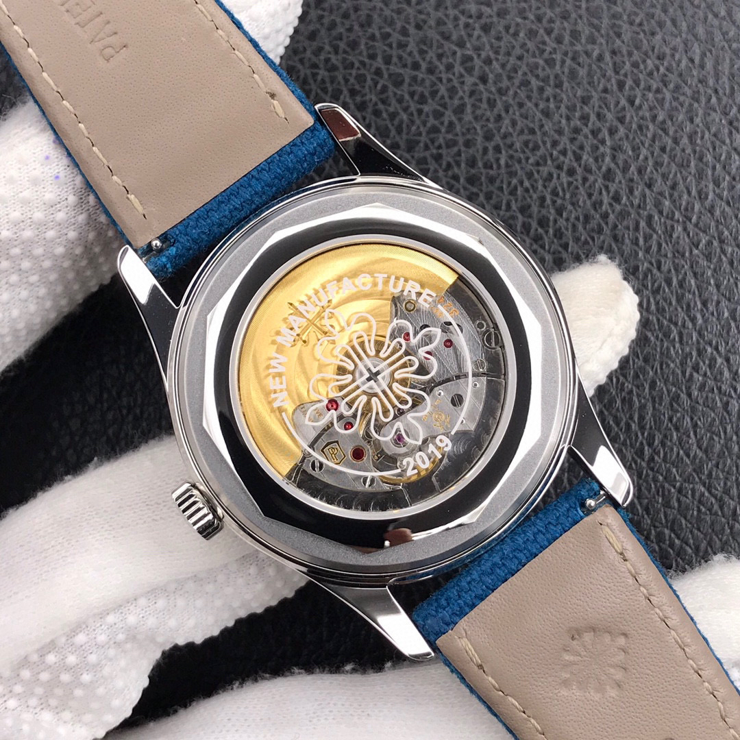 1.蓝宝石水晶透盖上刻有calatrava十字星图案,以及"New manufacture 2019 字样2.316L精钢表壳,搭配宽阔的弧形表圈设计