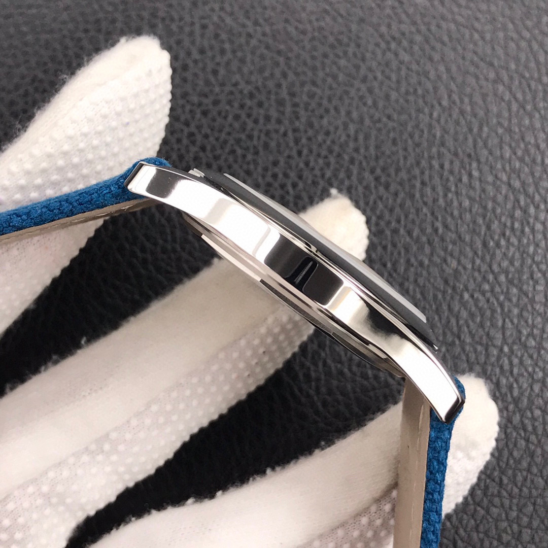 灰蓝色小牛皮表带,白色缝线装饰,搭配PP经典针扣,设计与盘面色彩交相辉映!