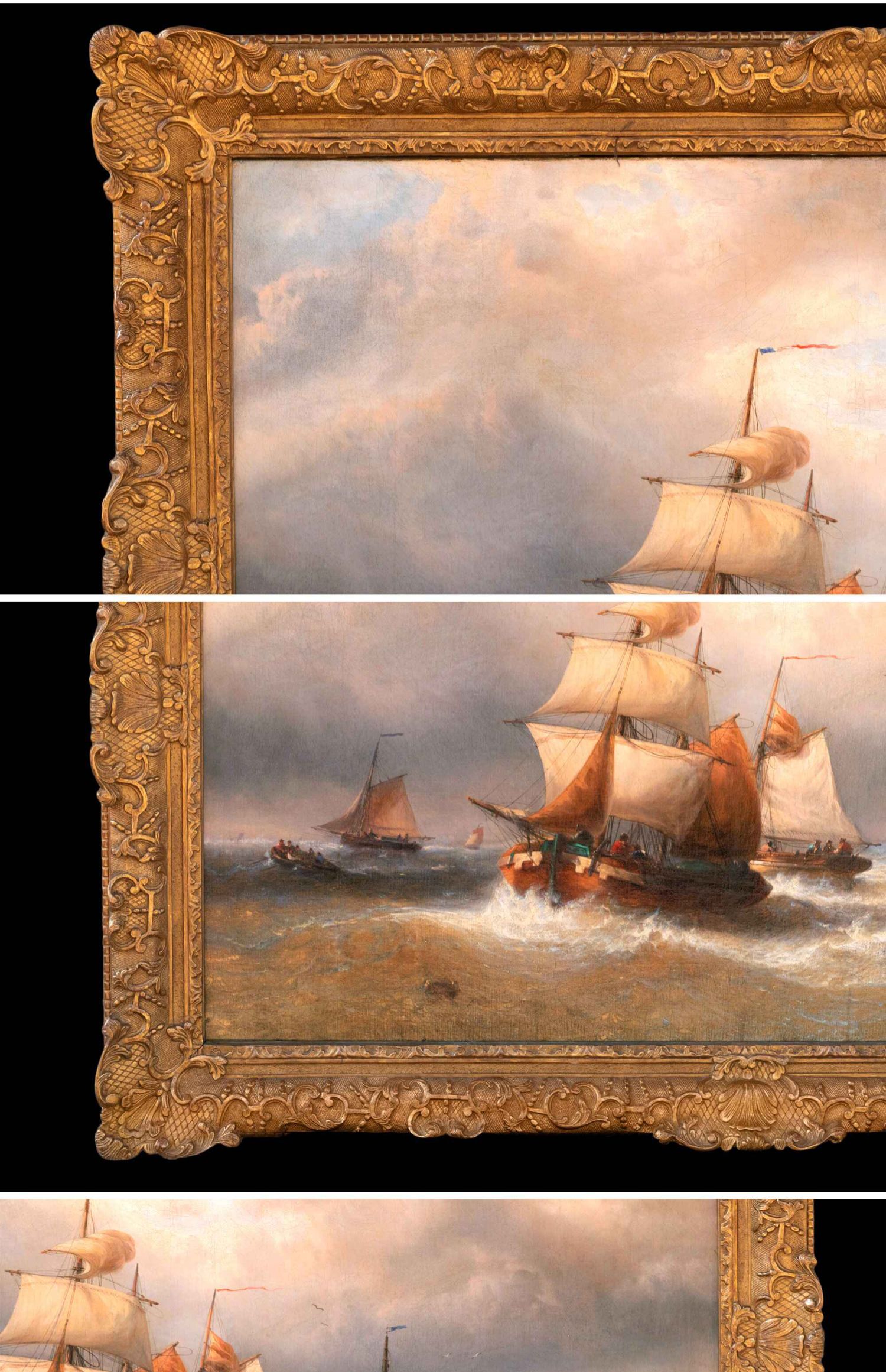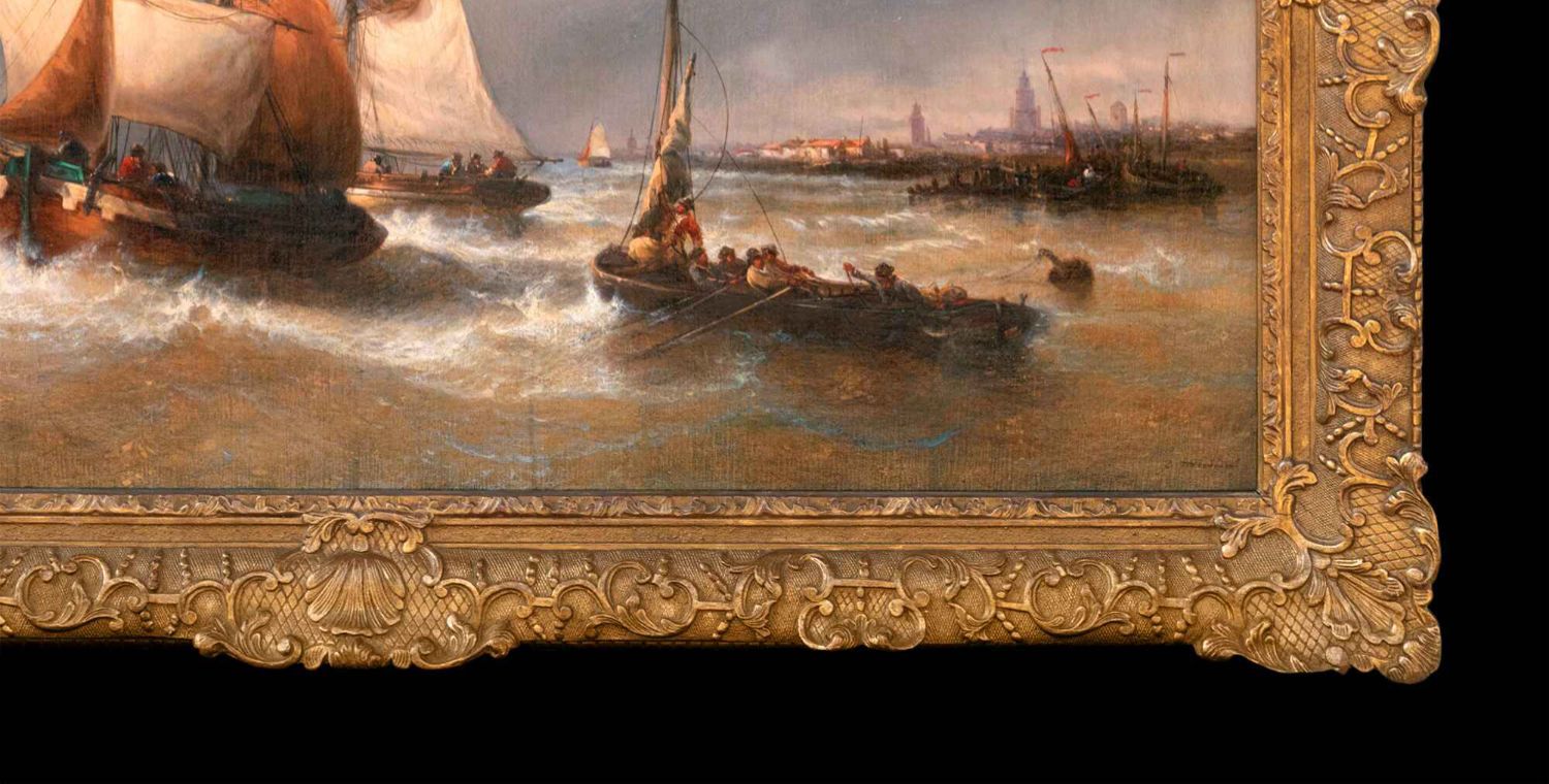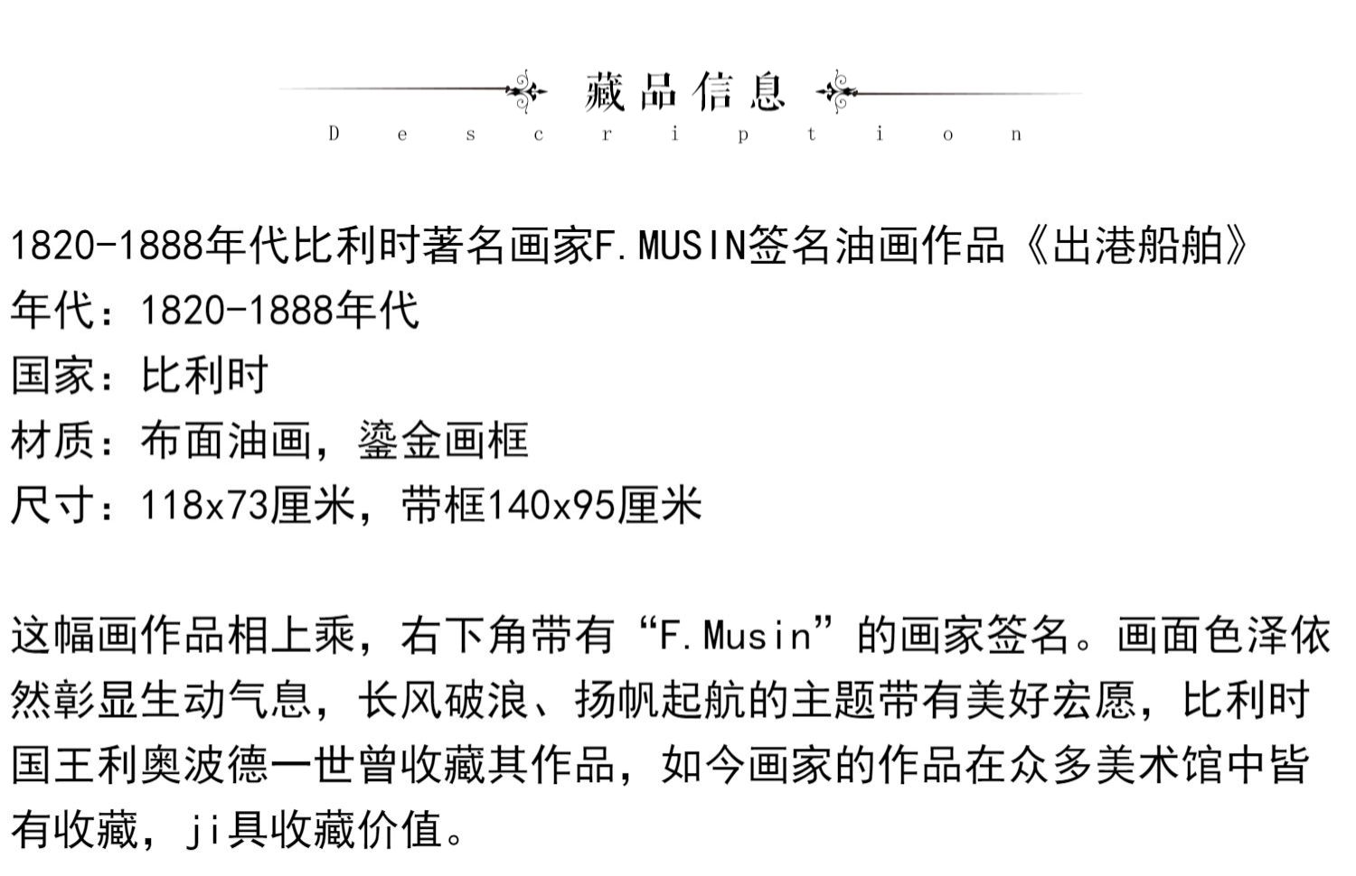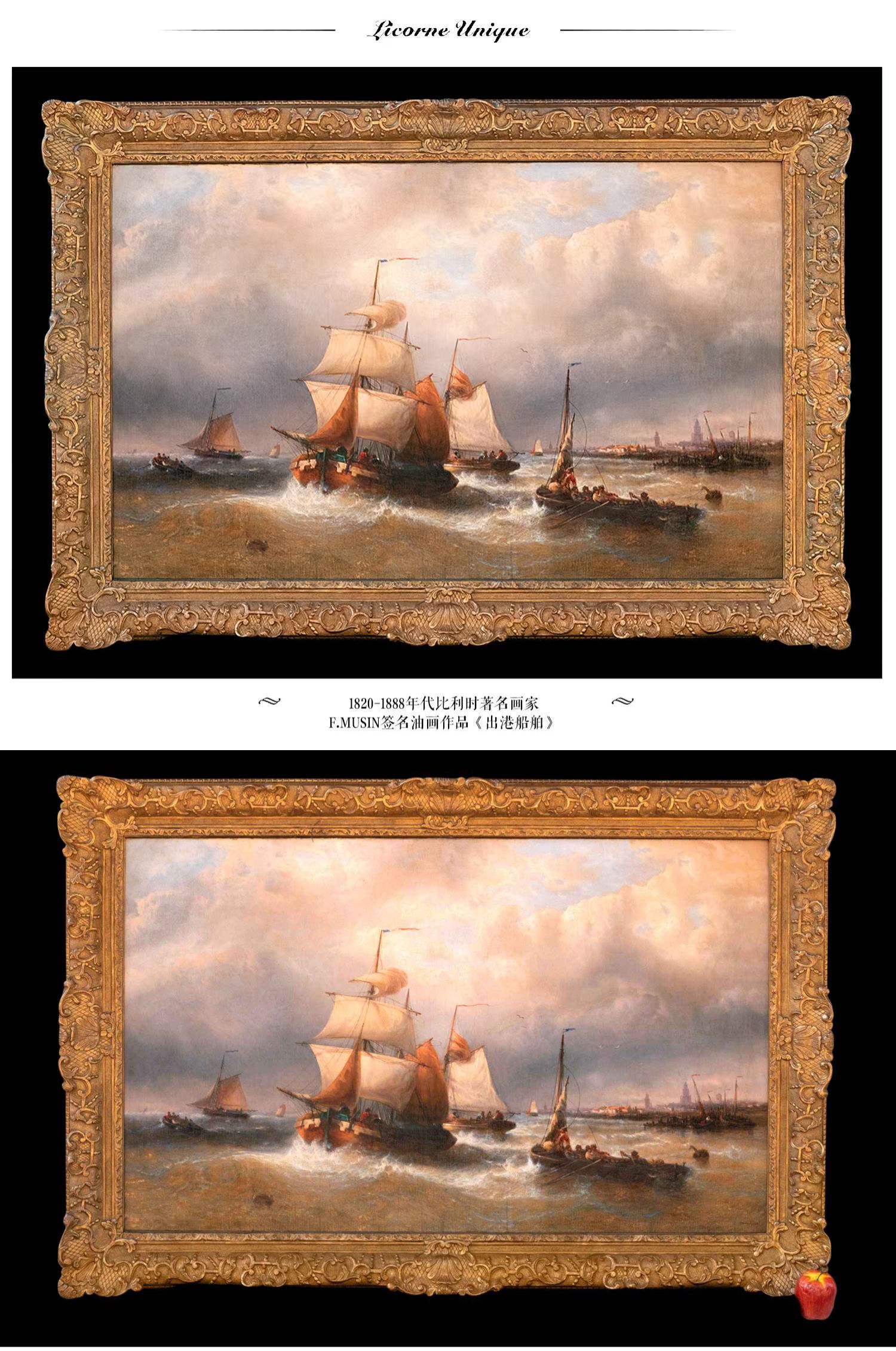 独角鹿西洋古董比利时著名画家F.MUSIN签名油画《出港船舶》