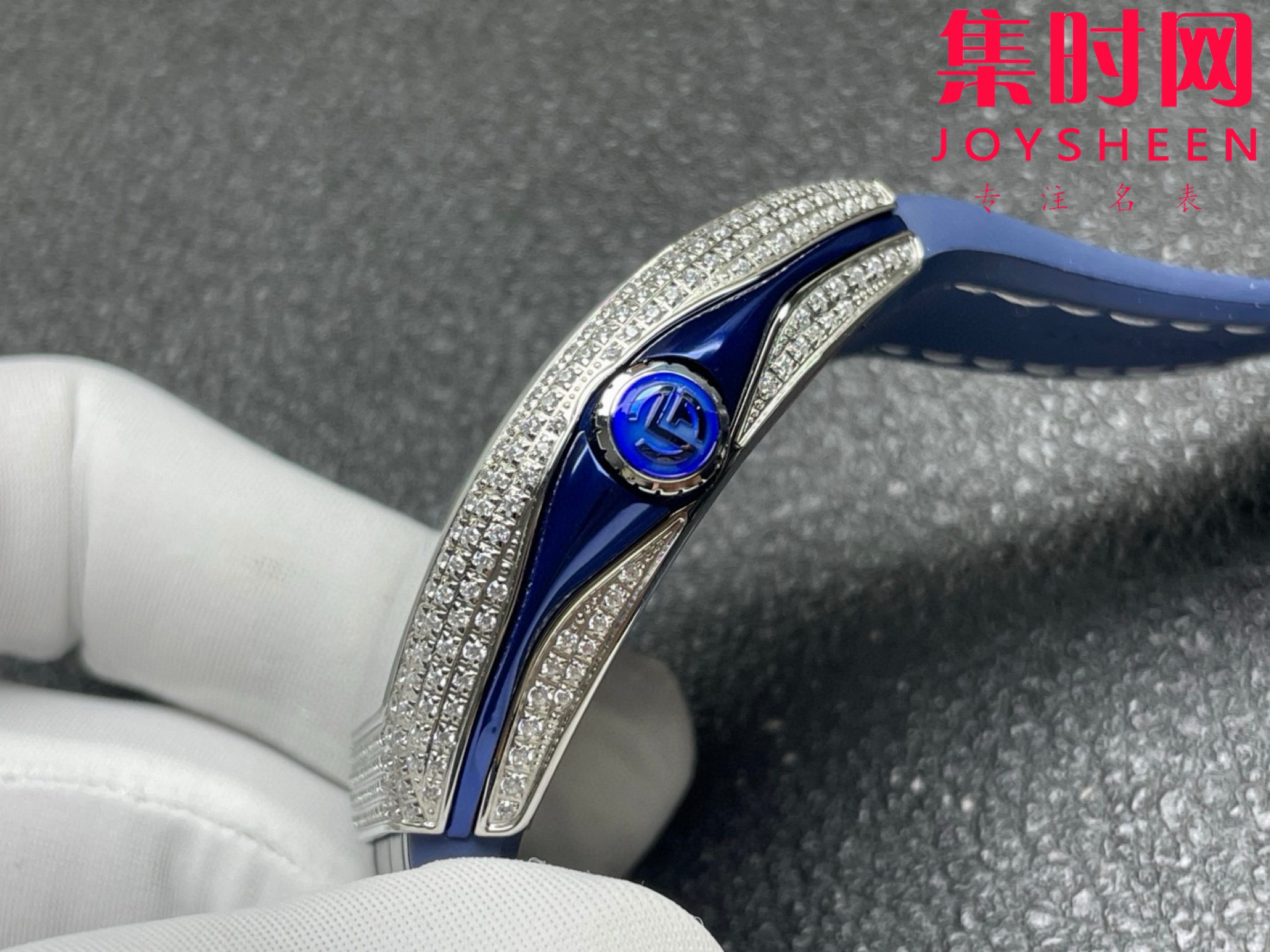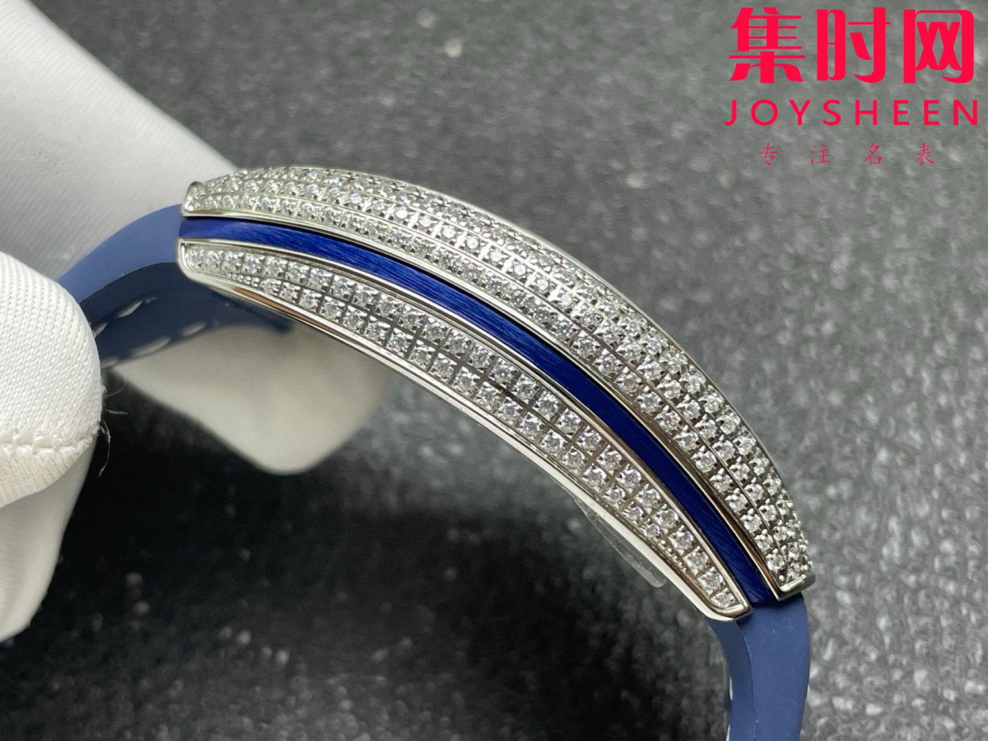 3.采用超大弧度 超高清透光的蓝宝石水晶玻璃 由一整块40*50mm 厚度超过15mm的蓝宝石原料 根据表壳弧度精心细磨 报废率高 成品率极低