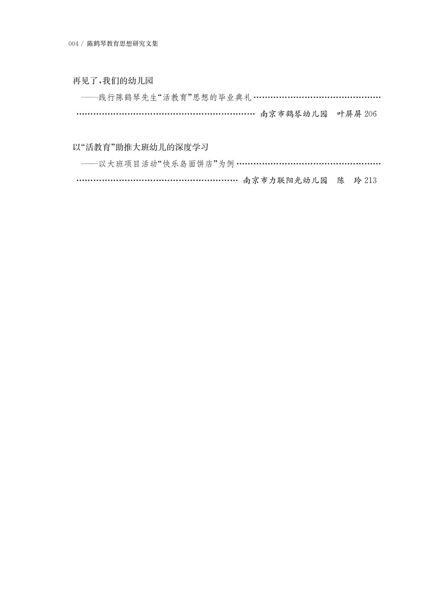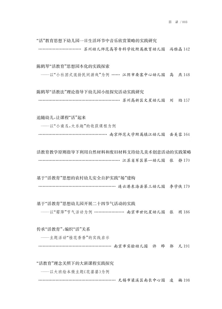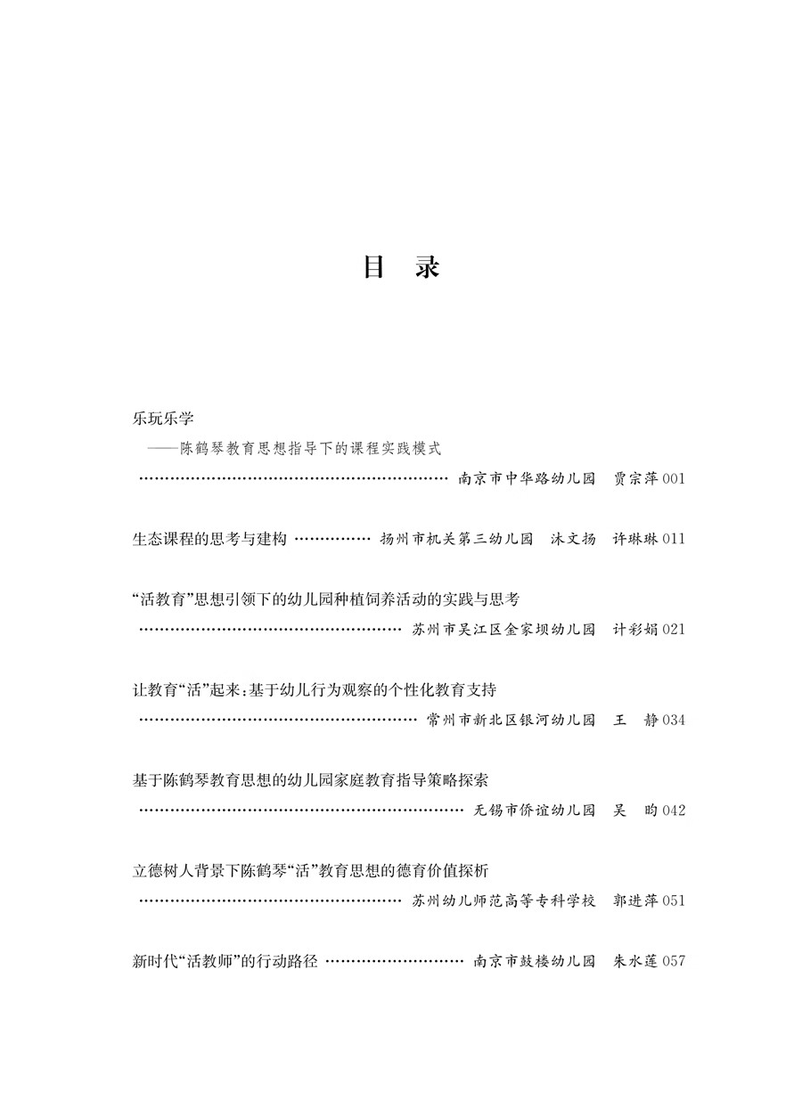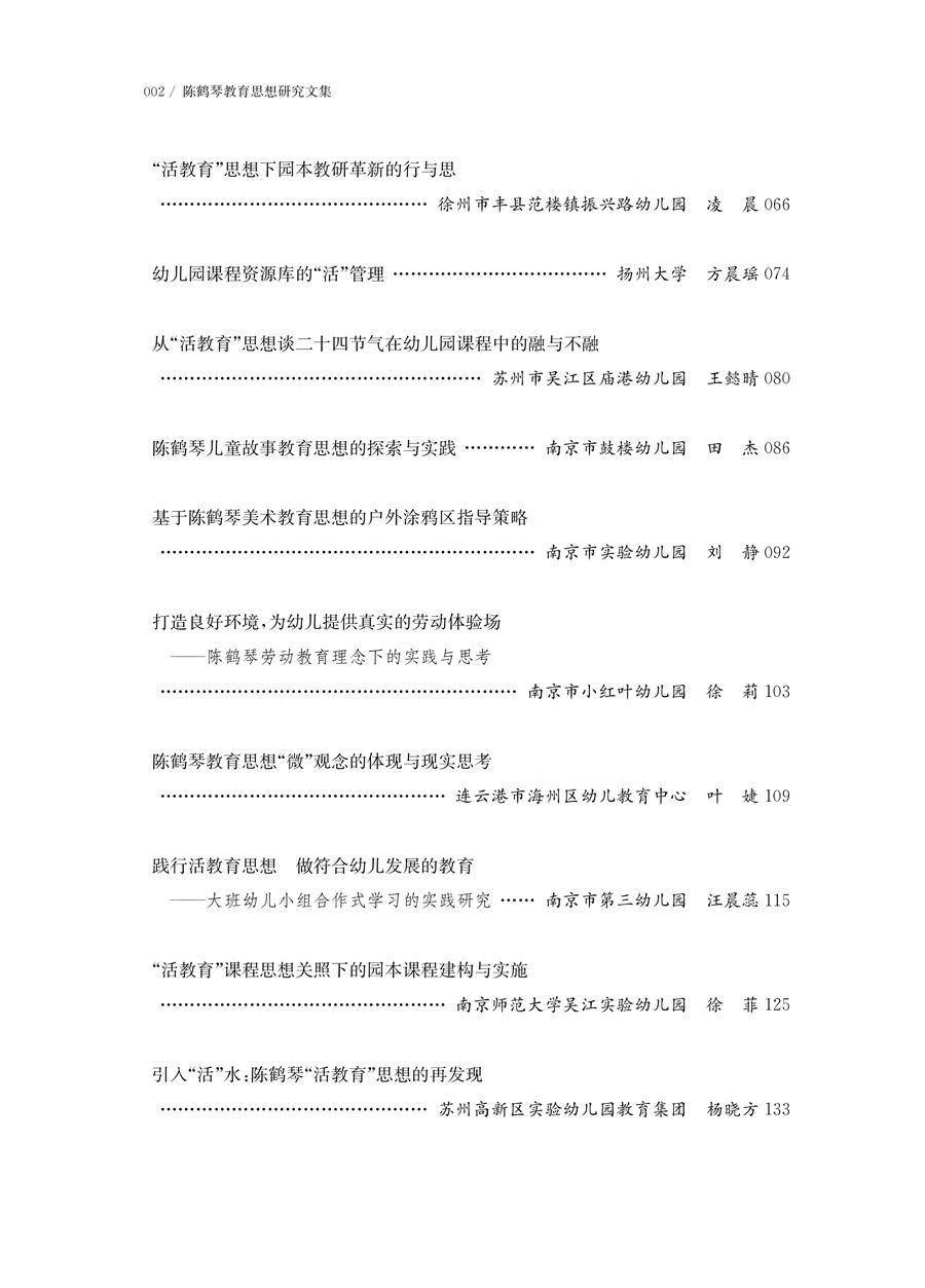 文集选编小组成员:孔起英(南京师范大学教授、学术委员会主任)、叶小红(江苏省教育科学研究院研究员、学术委员会副主任)、何锋(江苏省教育科学研究院副研究员、陈研会秘书长)、田燕(江苏省第二师范学院学前学院教授、陈研会常务理事)、张晗(苏州幼儿师范学校教授、学术委员会课程专业委员会副主任)、张世义(扬州大学学前系副教授、学术委员会民办教育专业委员会副主任)