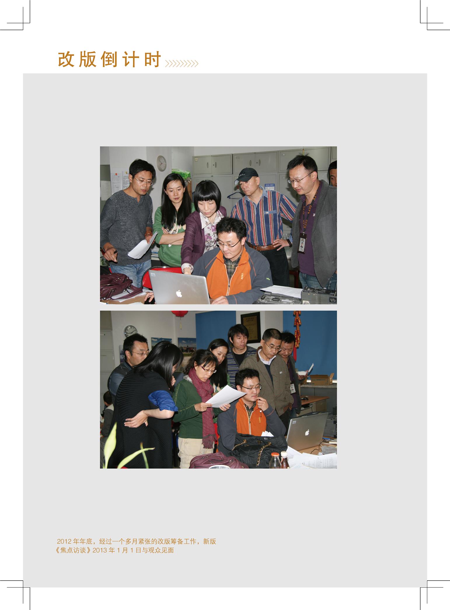 作为从业者,《焦点访谈》最大的吸引力到底是什么?大家爱用的一个词是“感觉”。“感觉”这词的定义很难一言以蔽之。当拿到一个令人兴奋的独家选题线索;当采访几入绝境时柳暗花明有了突破;当夜以继日写稿编片熬成内伤终于在最后时限前完成;当内有猛料的节目通过了层层审看;当自己做的节目成了街谈巷议的话题;当素不相识的人仅仅因为你的工作就对你表示由衷的赞赏和尊重……就是这样的感觉吧。感谢《焦点访谈》,让我们把职业干成了事业,并且从中收获了快乐和尊严。