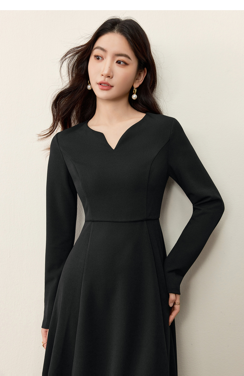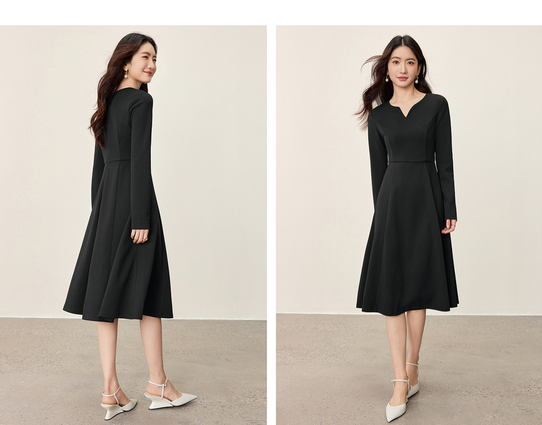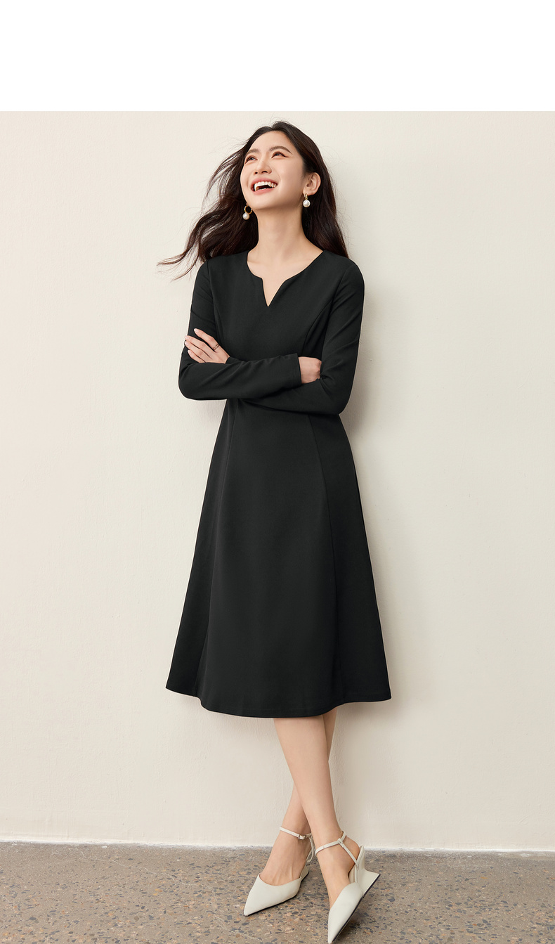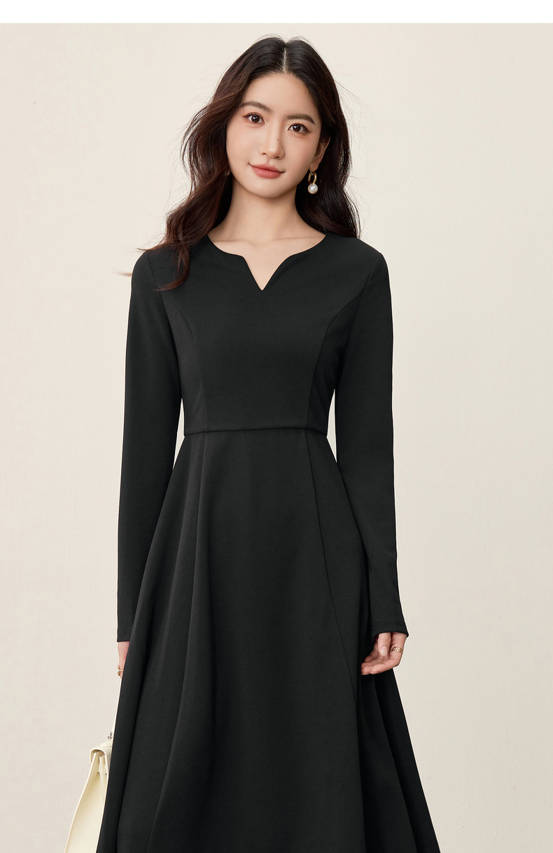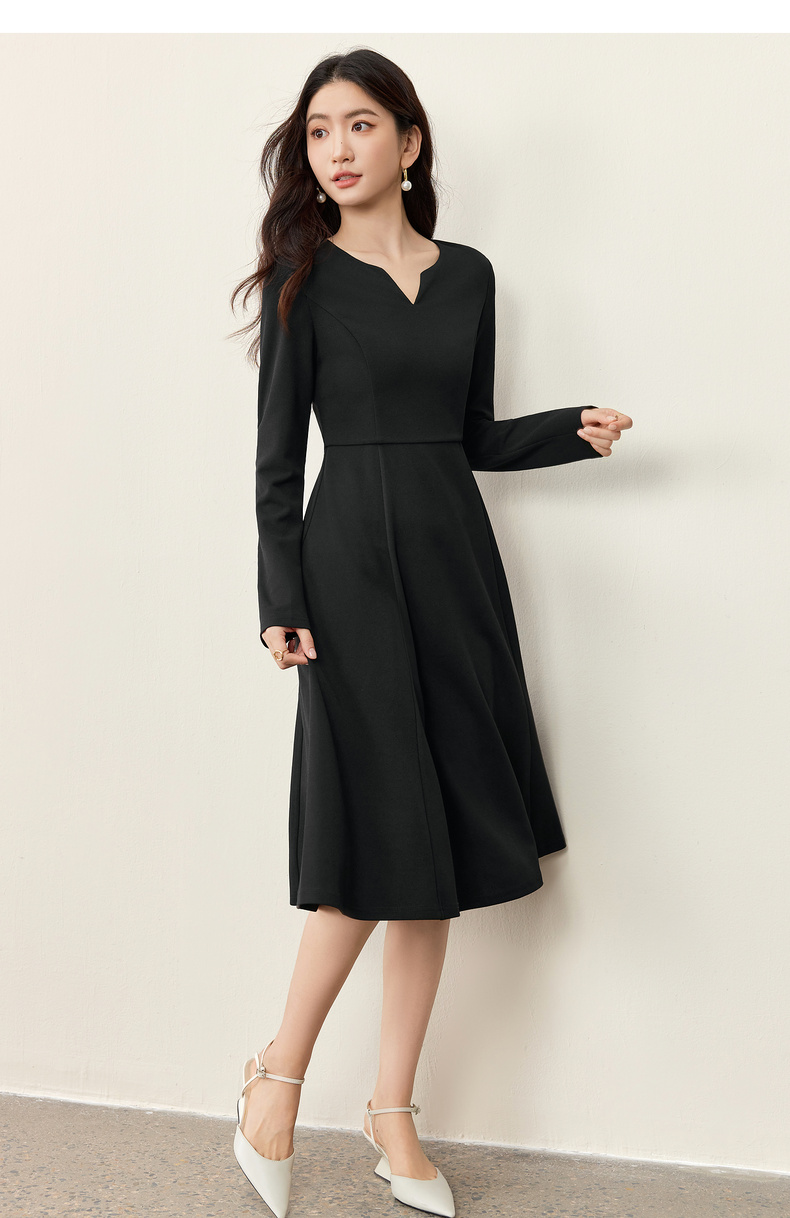 【内购】【立裁设计】气质通勤圆V领收腰显瘦弹力针织长袖小黑裙连衣裙-153LJ2775