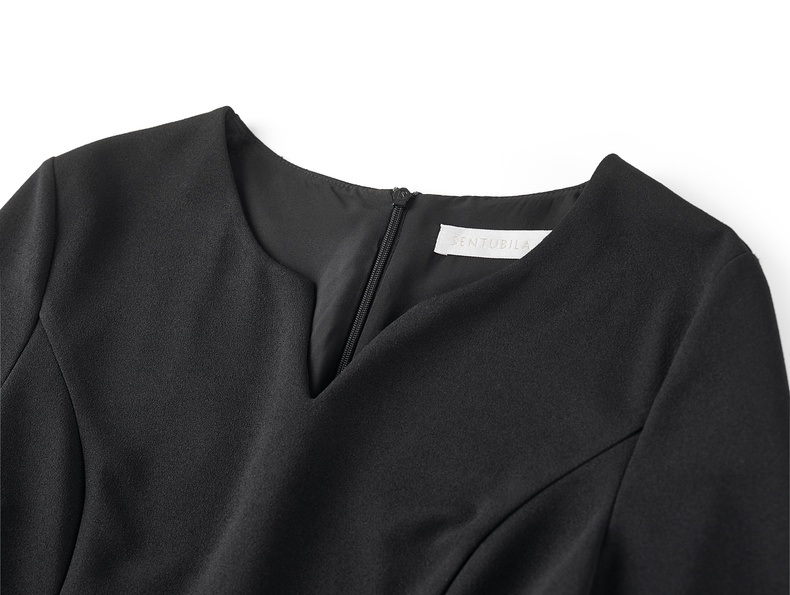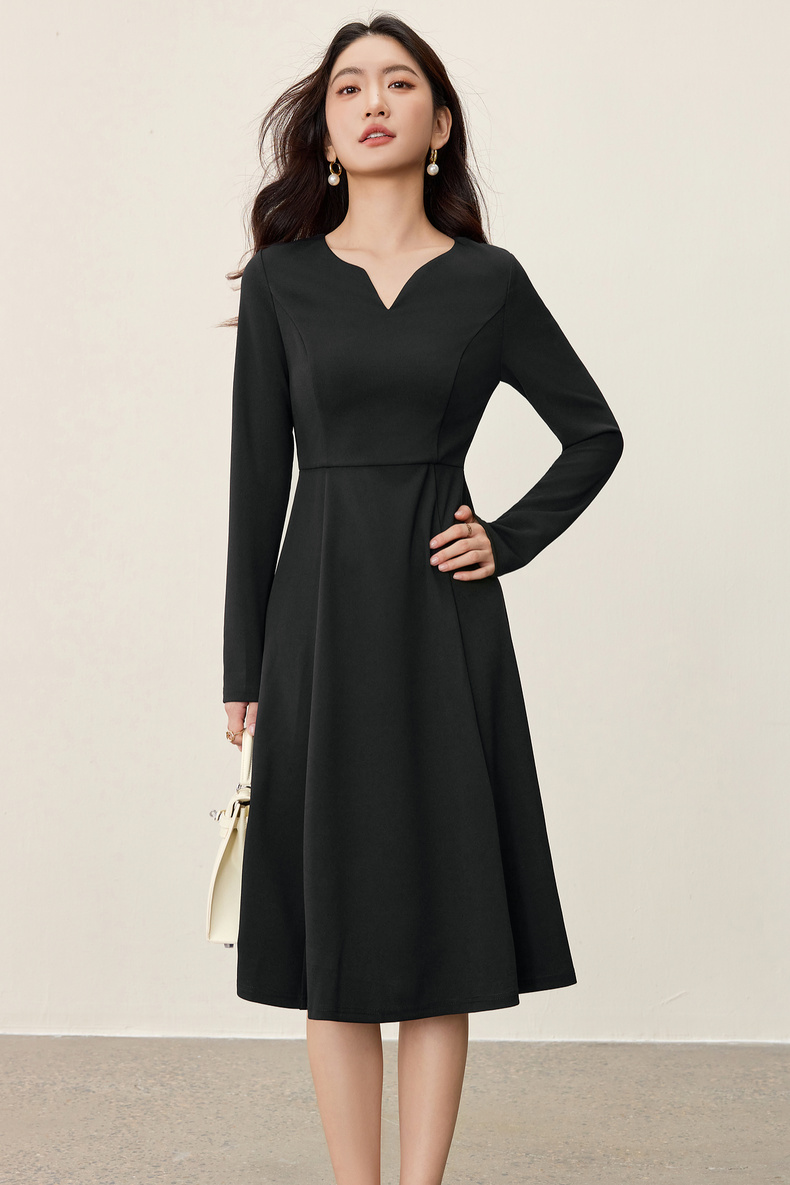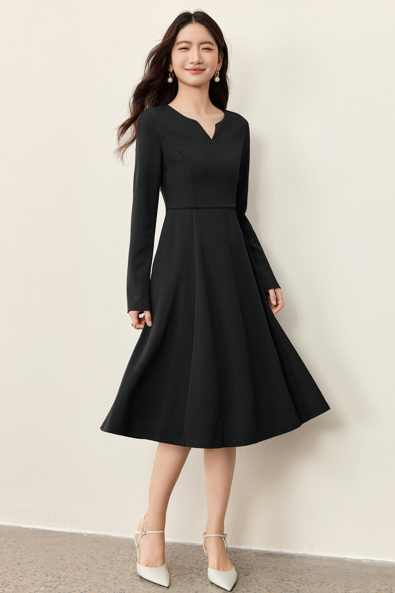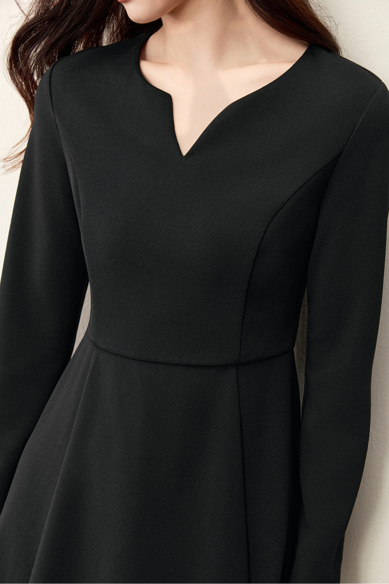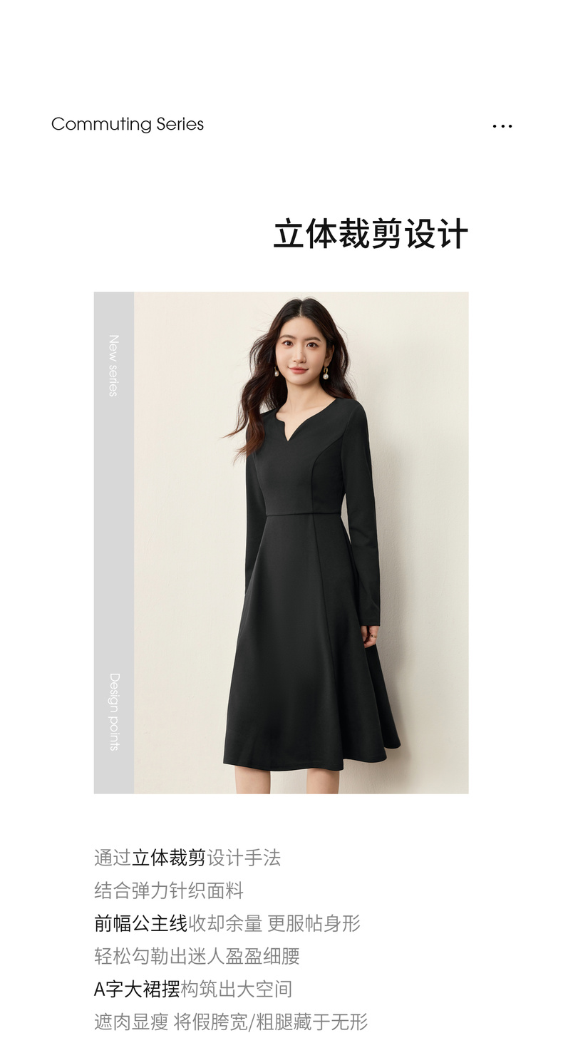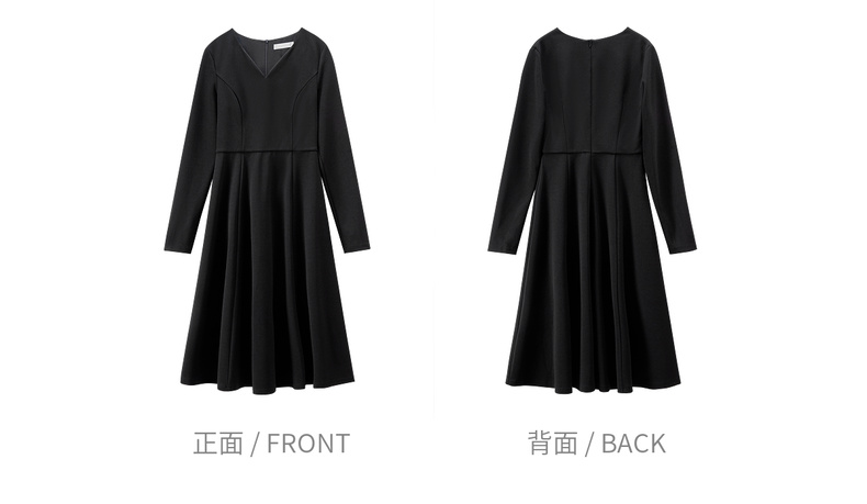 【内购】【立裁设计】气质通勤圆V领收腰显瘦弹力针织长袖小黑裙连衣裙-153LJ2775