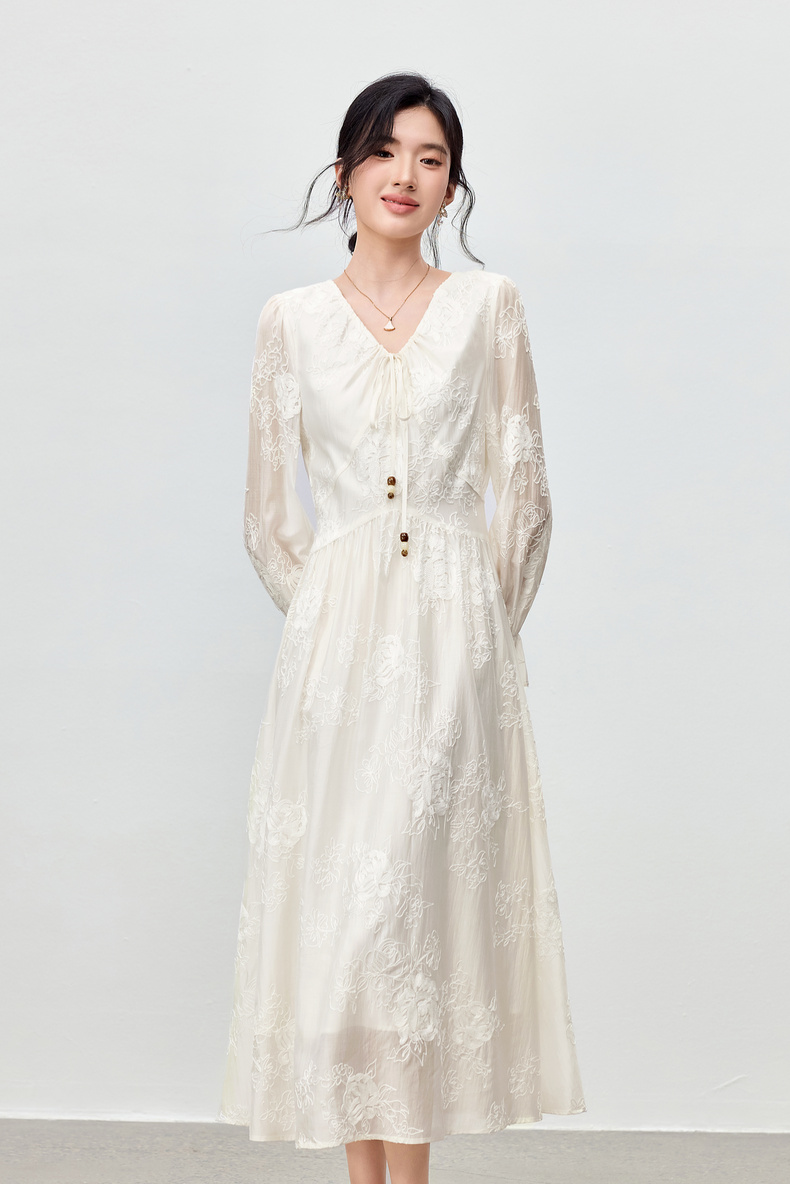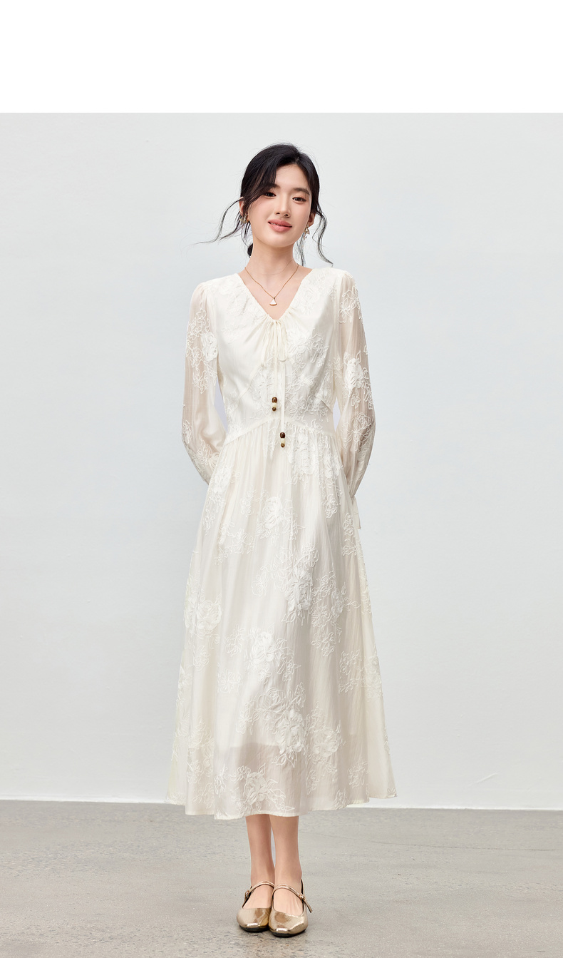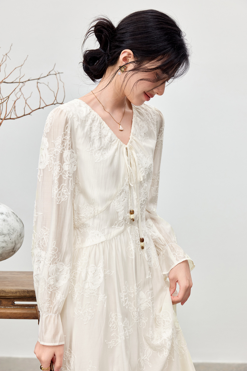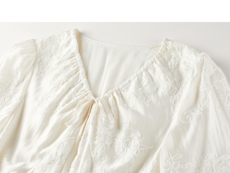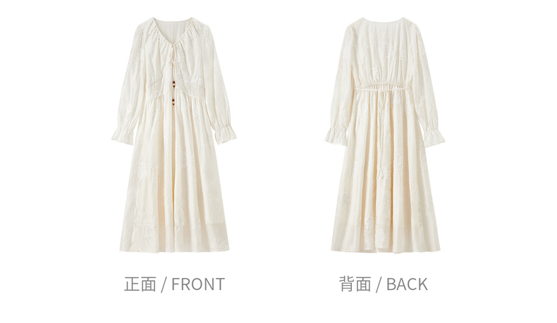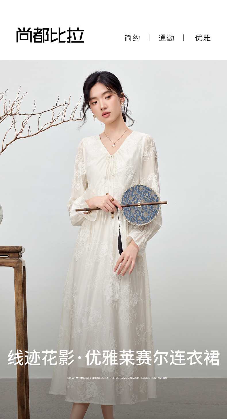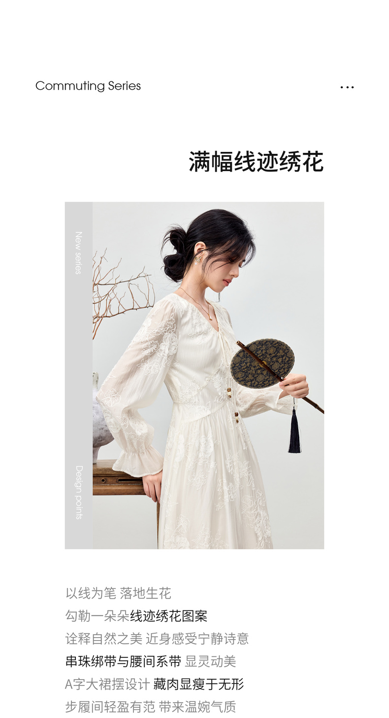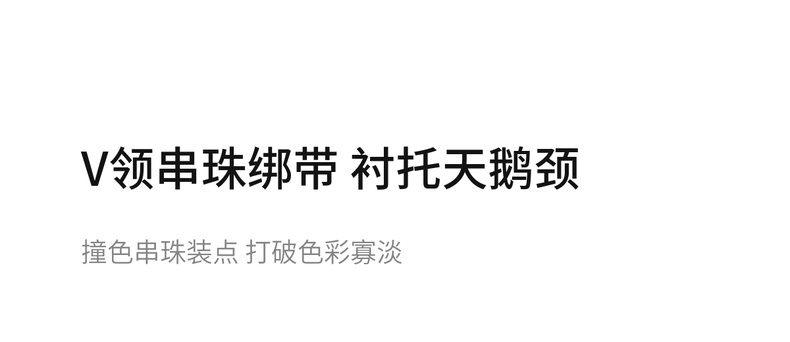 【内购】【莱赛尔】优雅通勤V领撞色串珠绑带设计收腰线迹绣花连衣裙-Q53LI3977