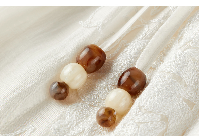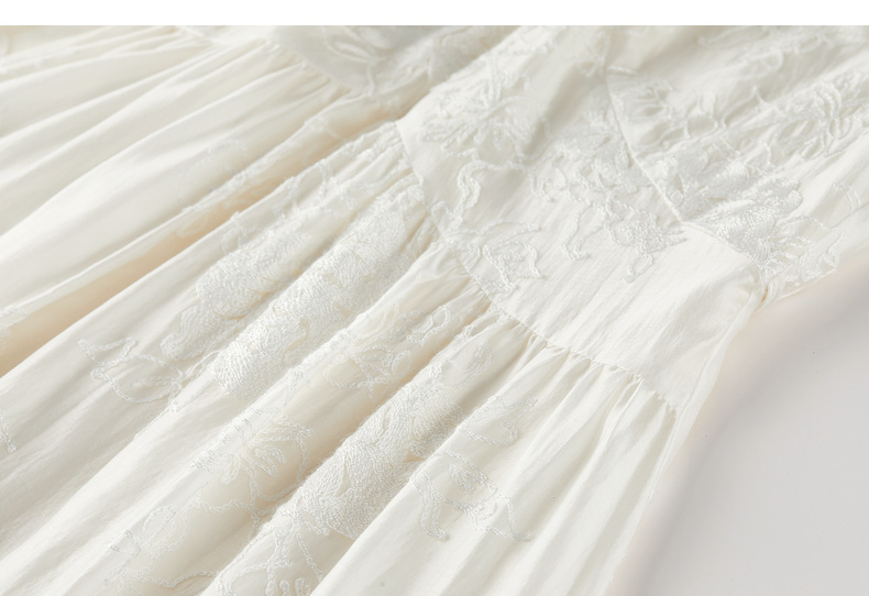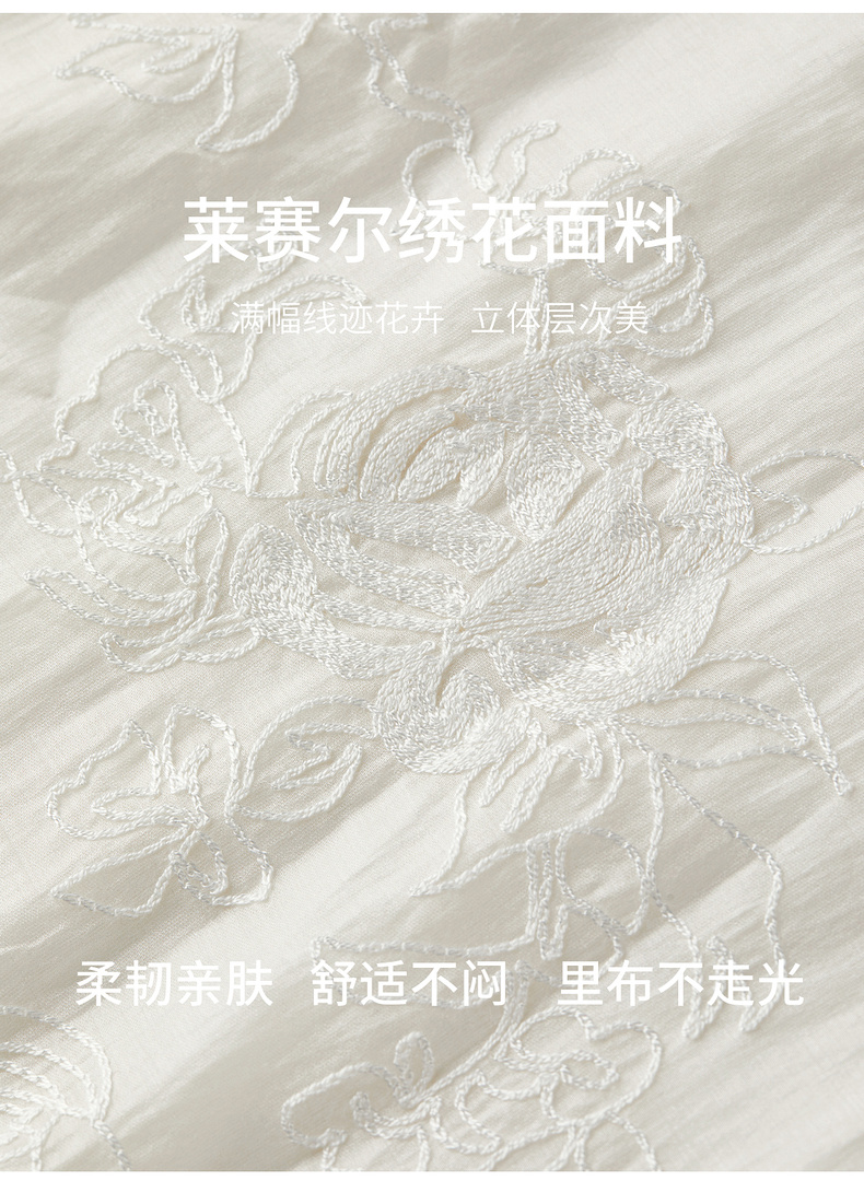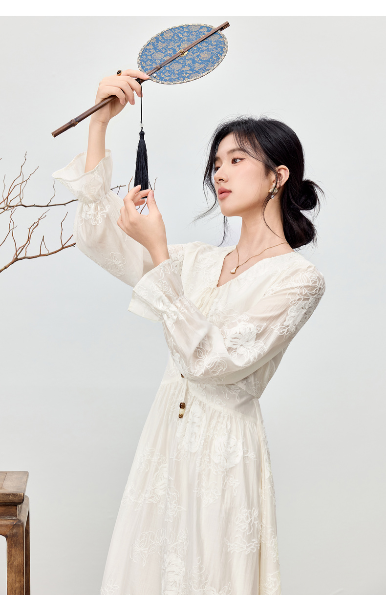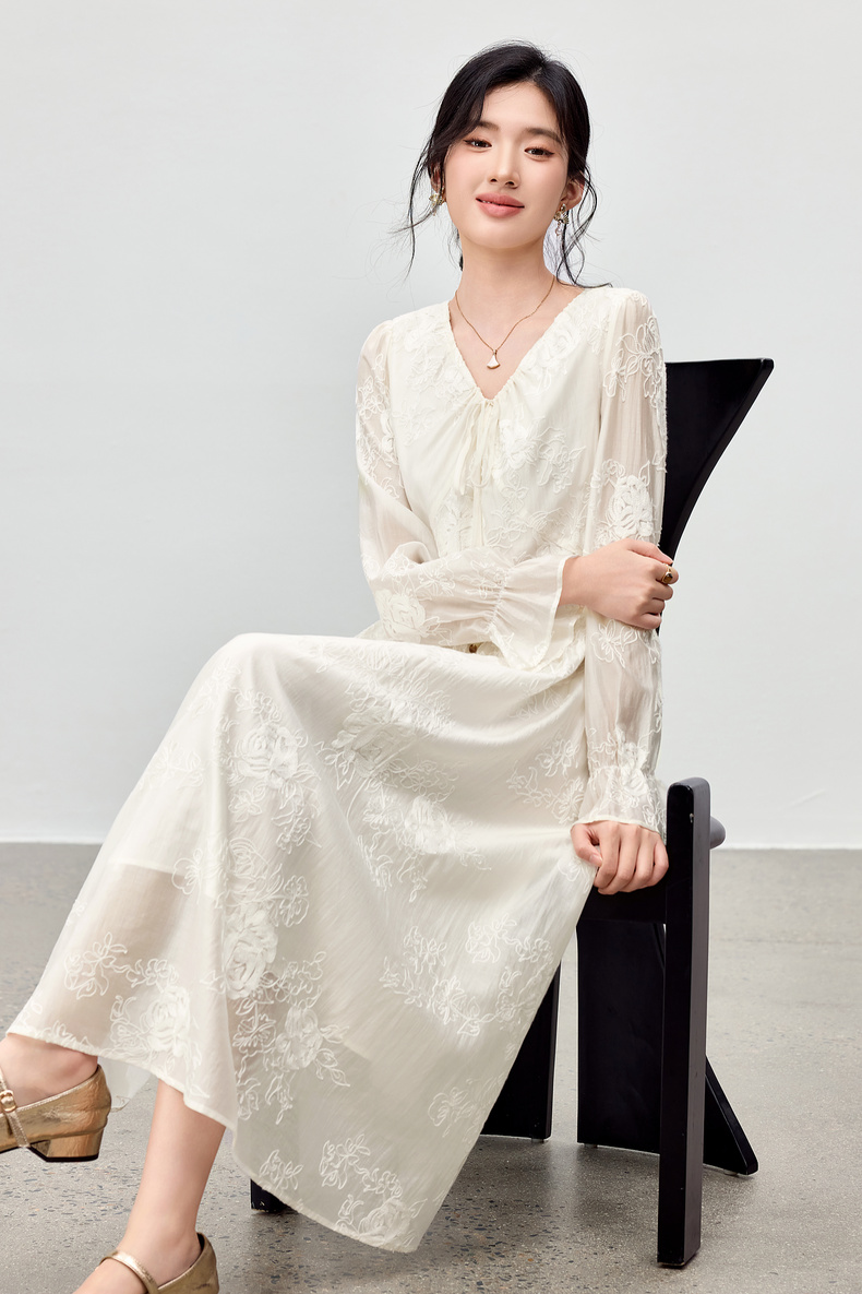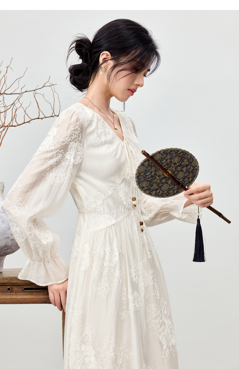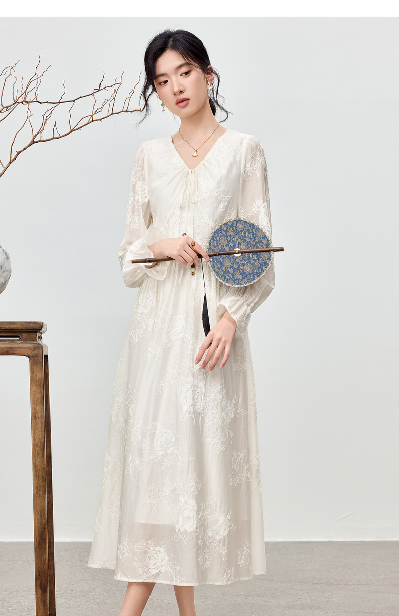 【内购】【莱赛尔】优雅通勤V领撞色串珠绑带设计收腰线迹绣花连衣裙-Q53LI3977