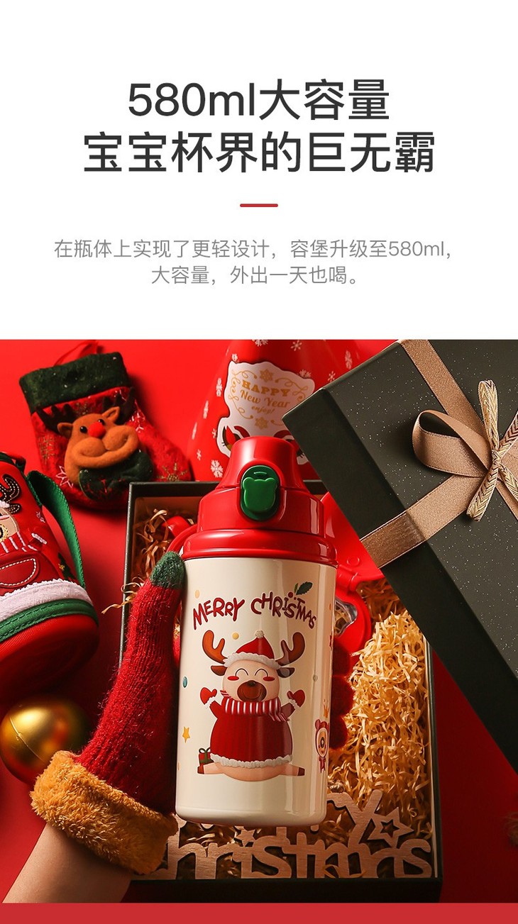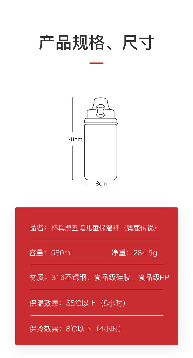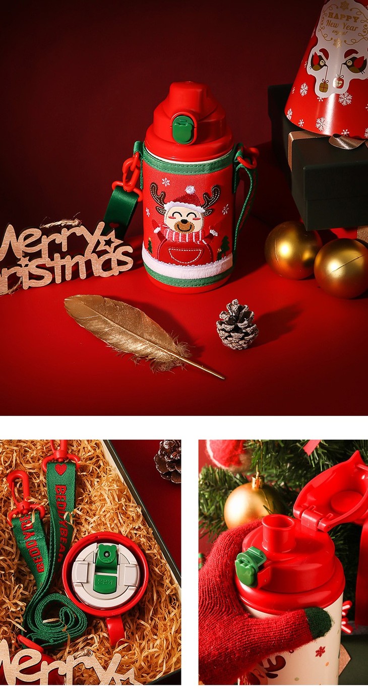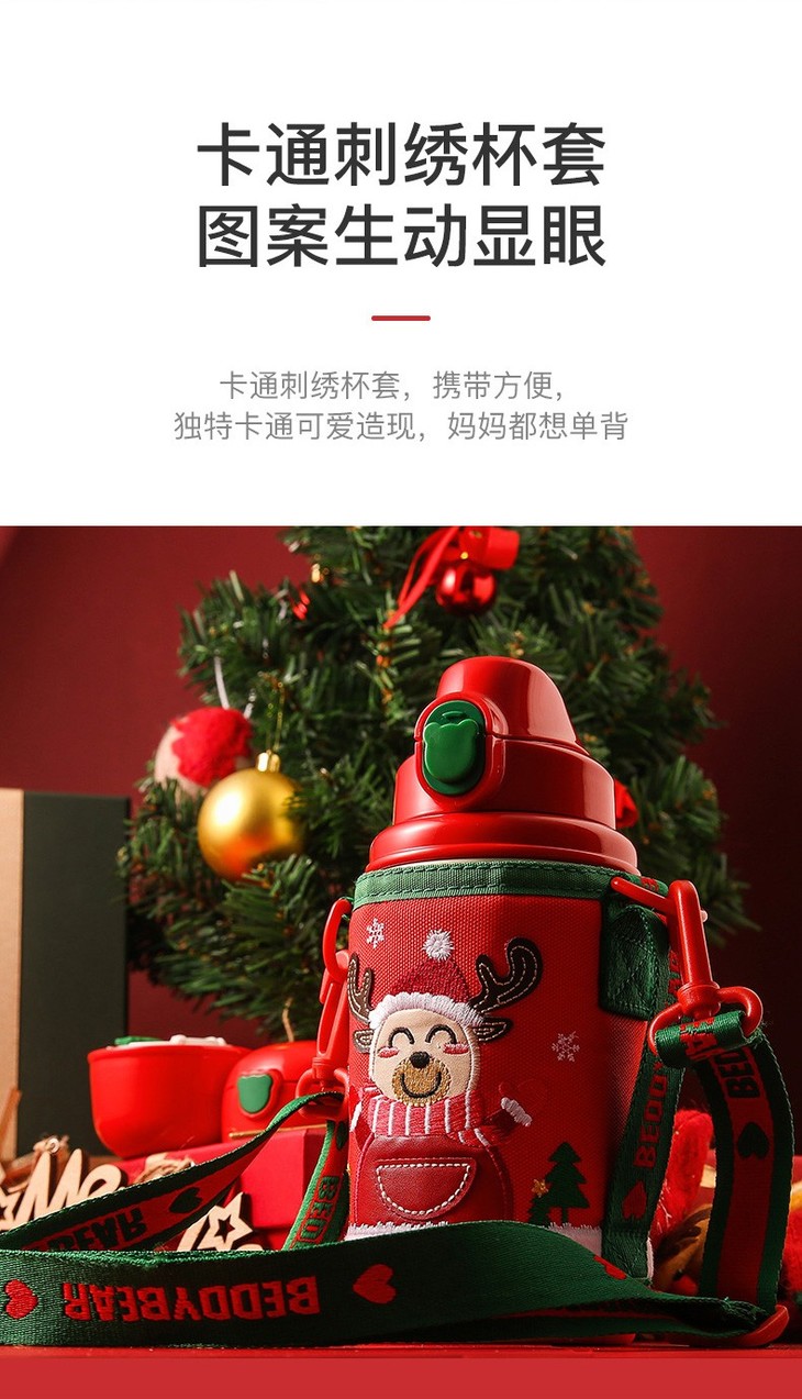 【圣诞礼物】杯具熊圣诞款口袋杯儿童保温杯幼儿园四叶草麋鹿喝水杯带杯套吸管(630ml)