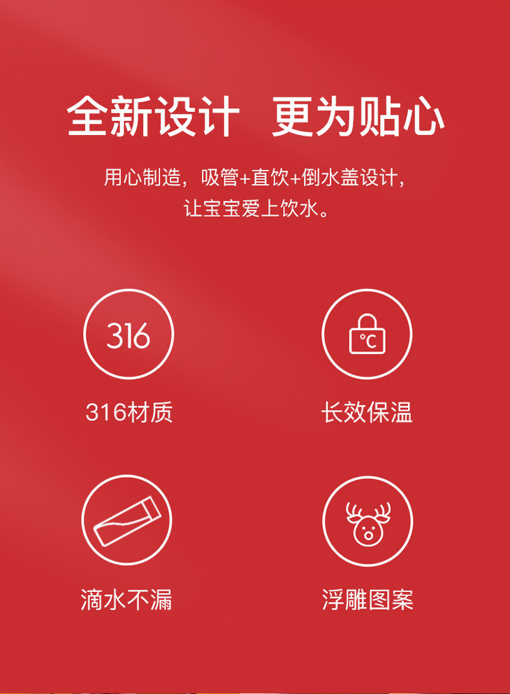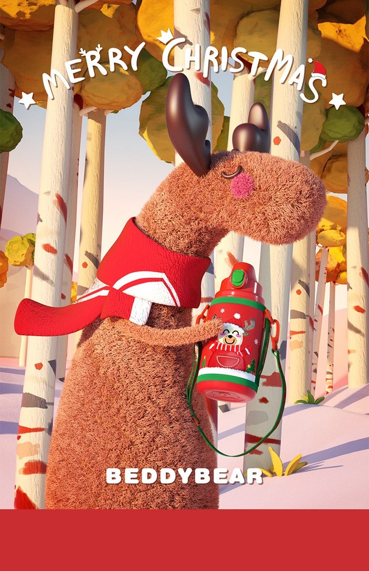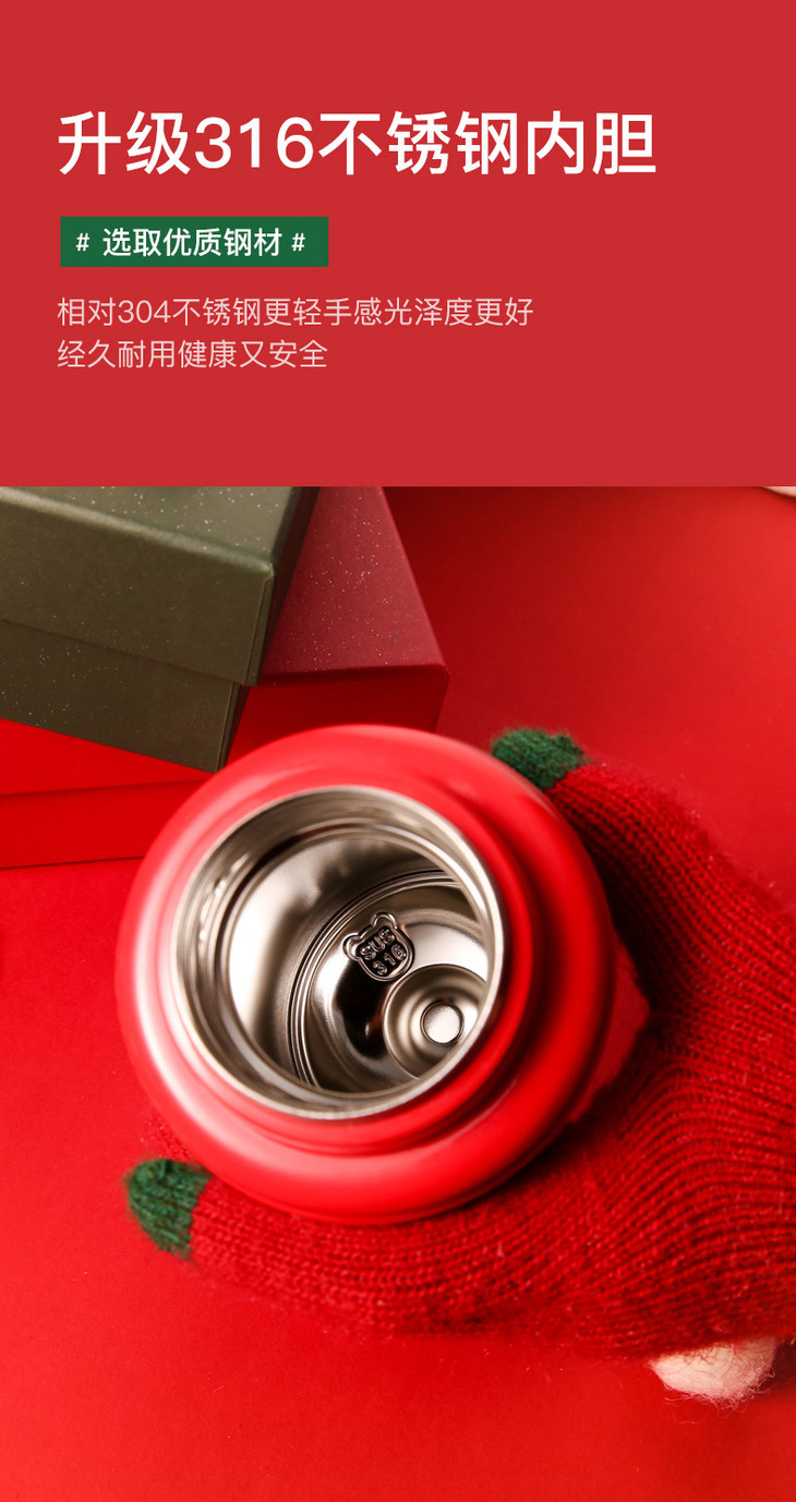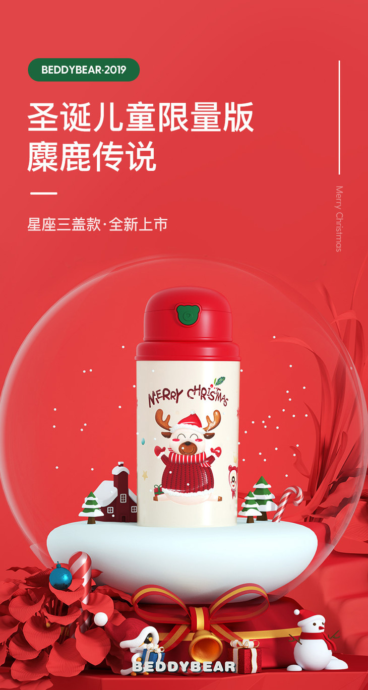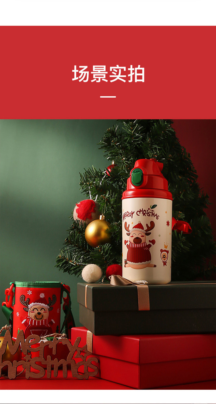 【圣诞礼物】杯具熊圣诞款口袋杯儿童保温杯幼儿园四叶草麋鹿喝水杯带杯套吸管(630ml)
