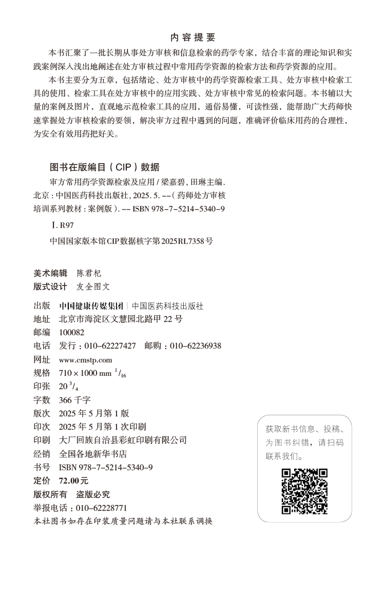 书名:审方常用药学资源检索及应用——药师处方审核培训系列教材(案例版)