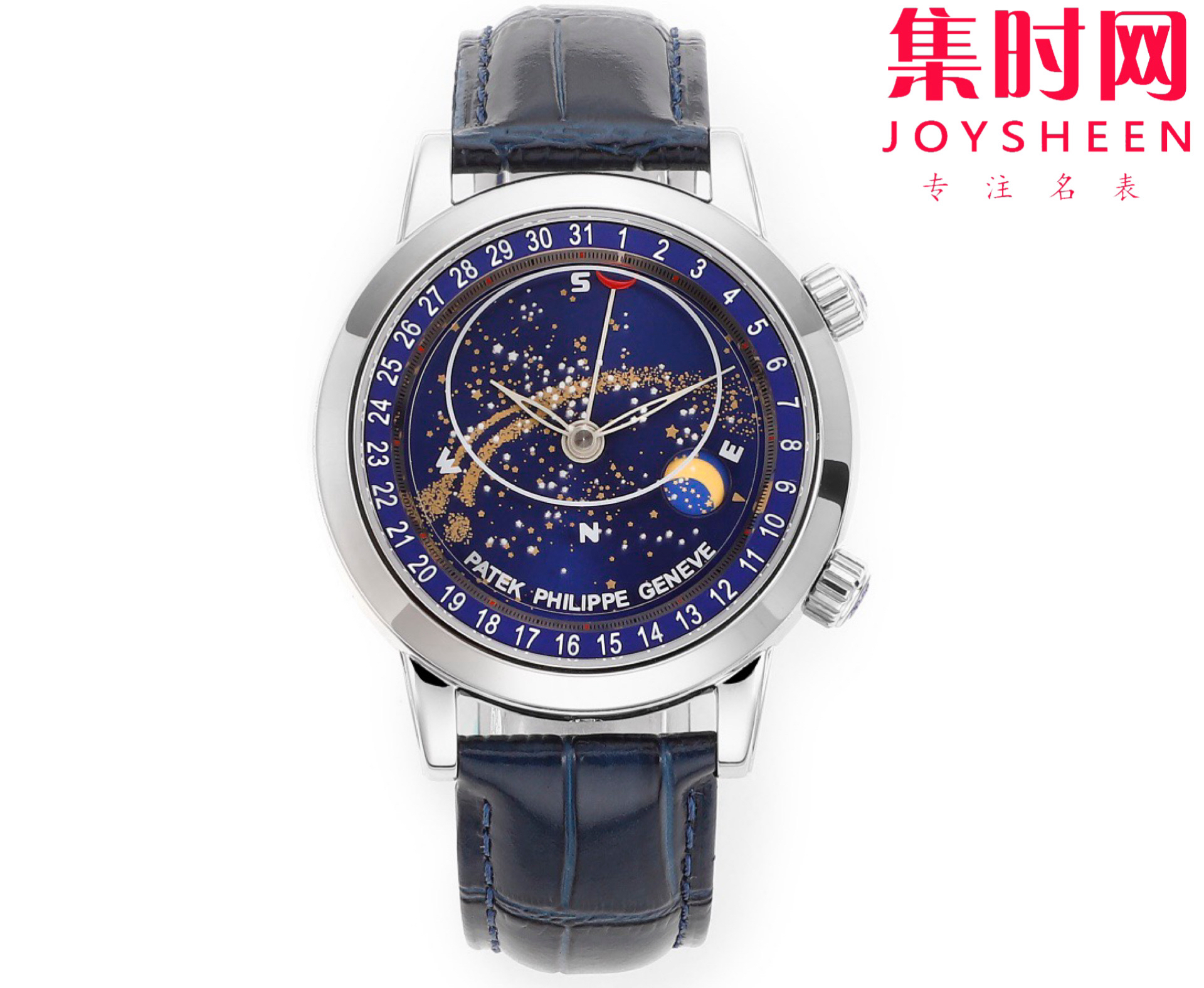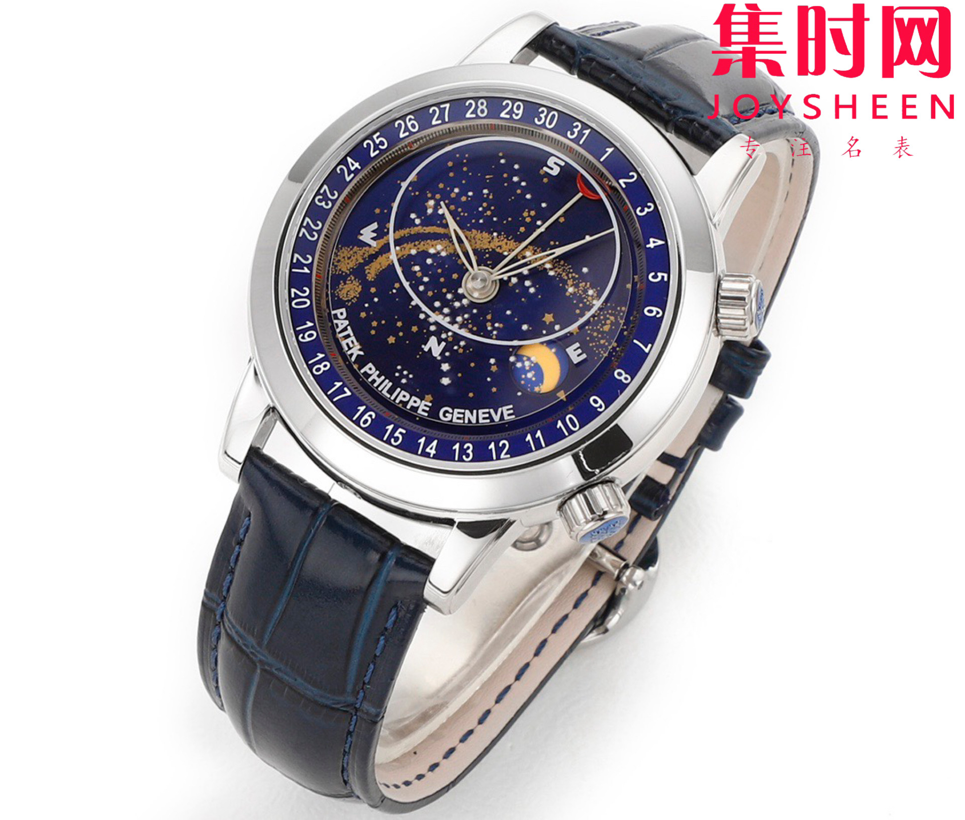 PP百达翡丽星空6102天月款日内瓦苍穹系列 男士腕表 你可想象把星空佩戴在腕上吗?TW超级复杂功能时计系列 这款星空腕表独具特别星象功能,蓝色圆表盘上就能欣赏日内瓦苍穹图,还有金色月球运行轨迹,熬时20个月 采用进口9015全自动机械机芯改造而成的珍珠陀,表盘上的月亮会根据天空的月亮月满圆 月蚀弯的情况自动变化 表壳前后玻璃采用先进技术处理让玻璃折射光提高,让表盘看起来更加通透 似乎没有玻璃的感觉 5字位把头调星空盘转动。本厂壳身百达花纹 花重金采CNC深雕刻 立体感凹凸感 超强。升级了24小时自转的星空 表盘尺寸44mm