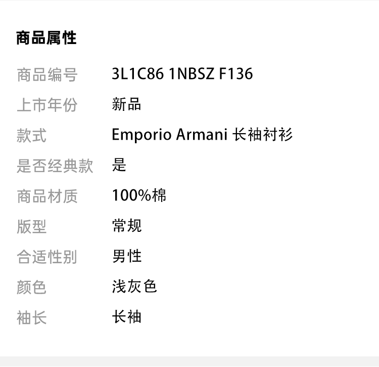 EMPORIO ARMANI 阿玛尼 男士长袖衬衫 浅灰 3L1C86 1NBSZ F136