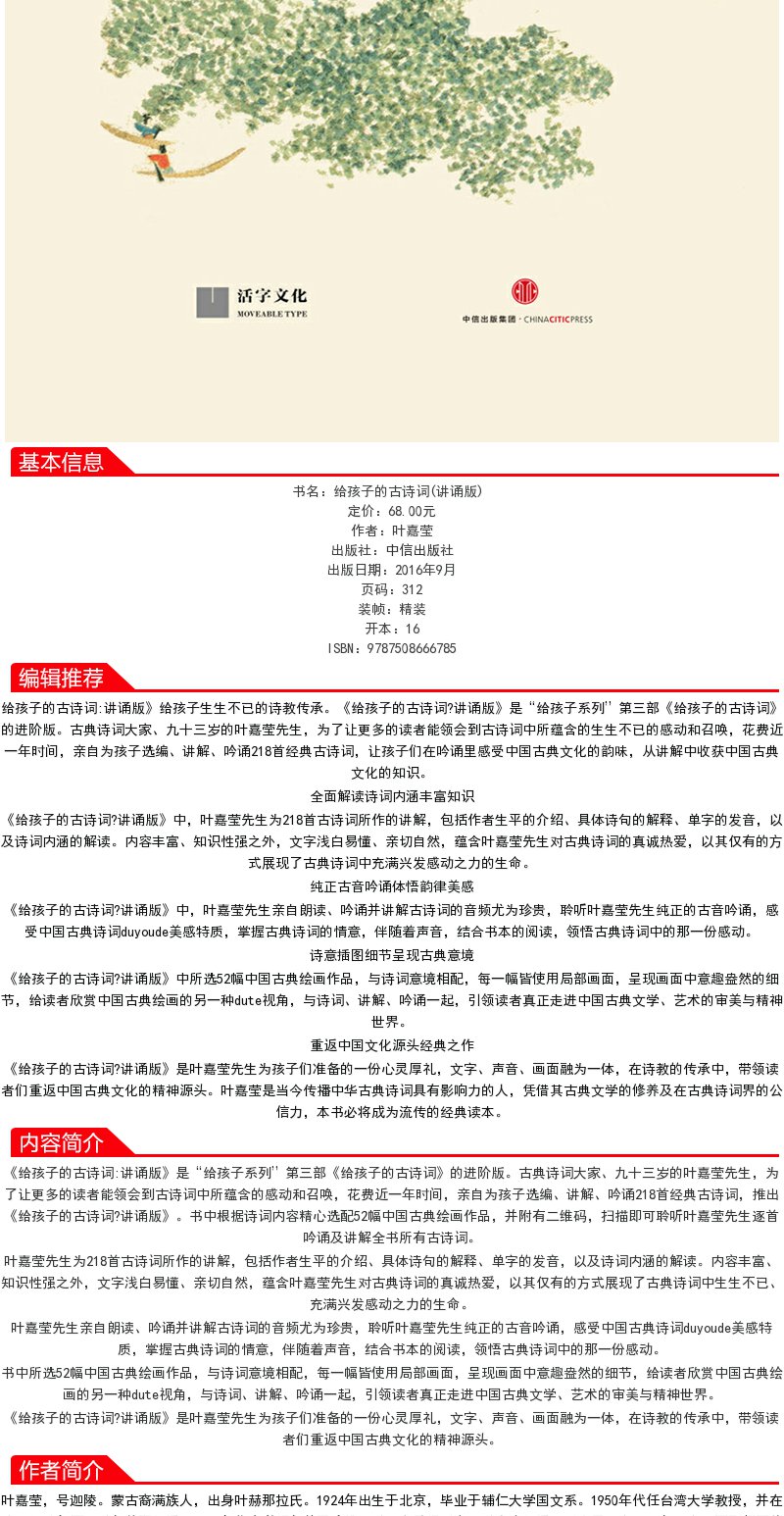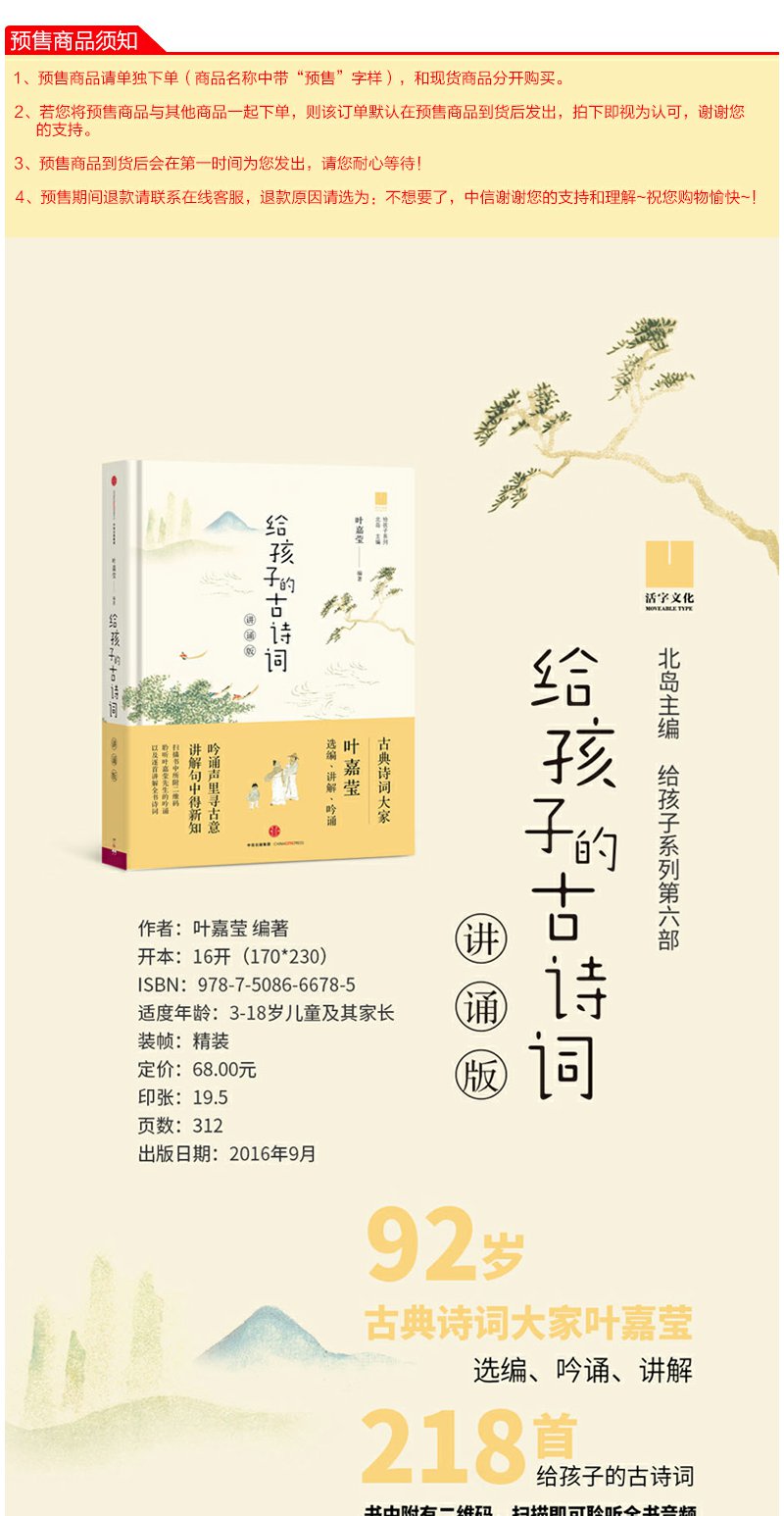 给孩子的古诗词(讲诵版)【3-6-18岁】 叶嘉莹 儿童文学(讲诵版)叶嘉莹 著 北岛 编 叶嘉莹为孩子打开诗词之门 中信