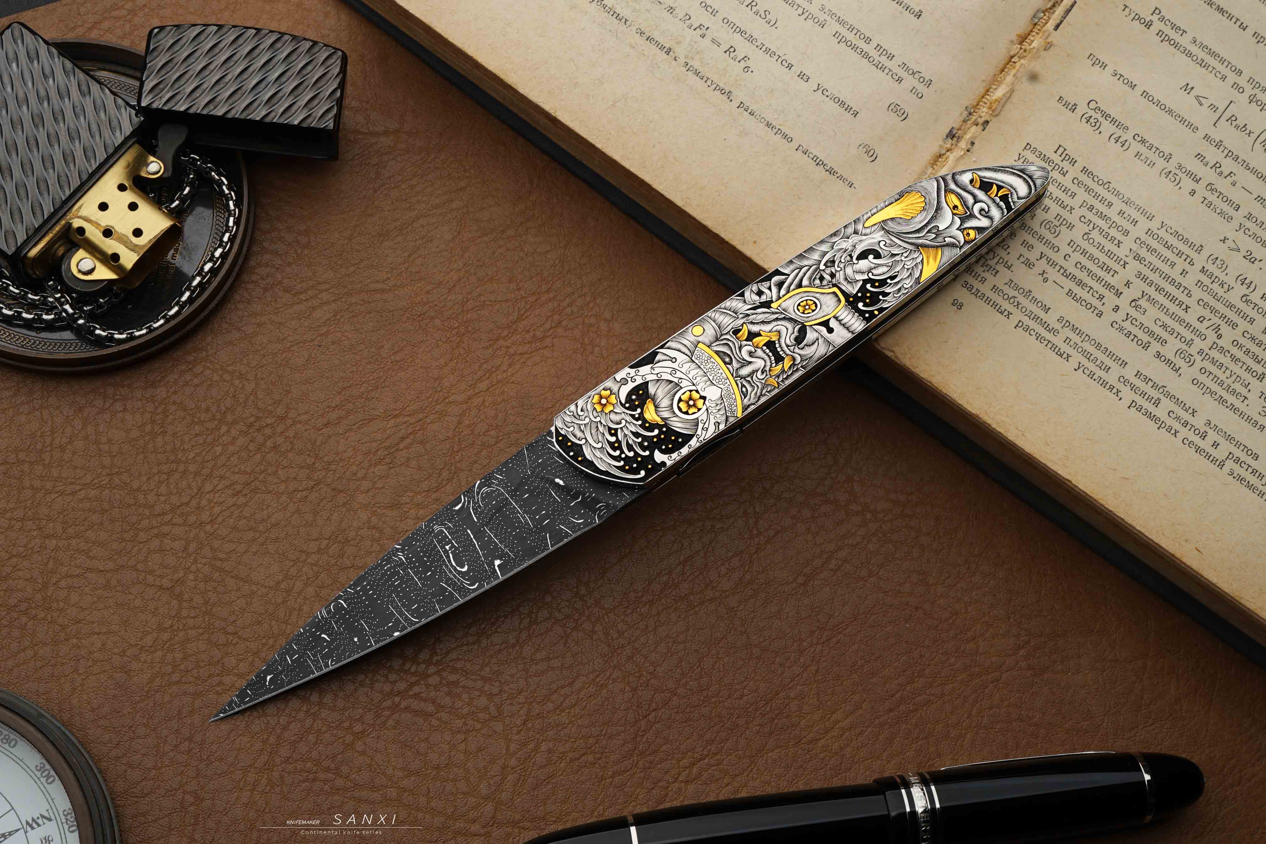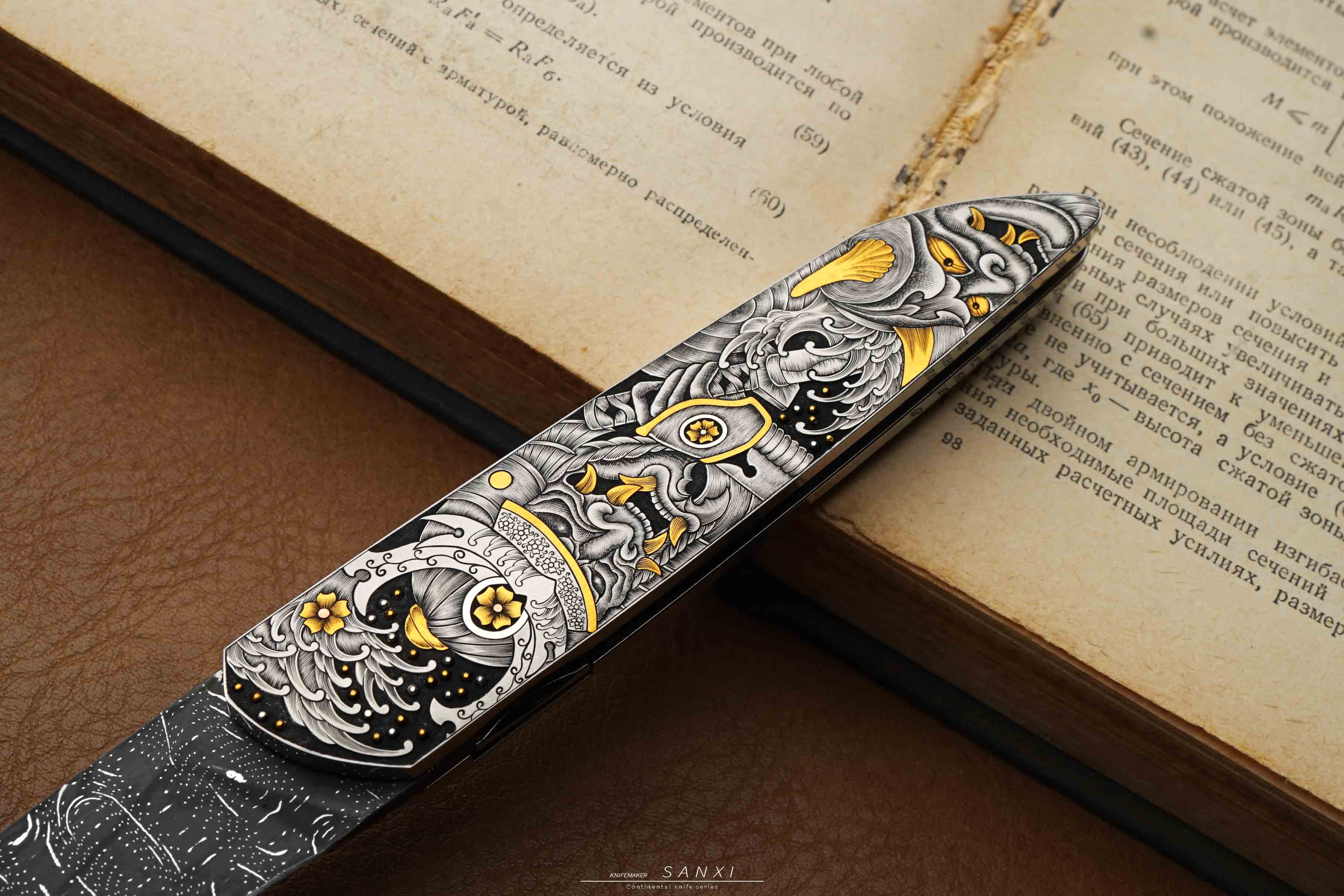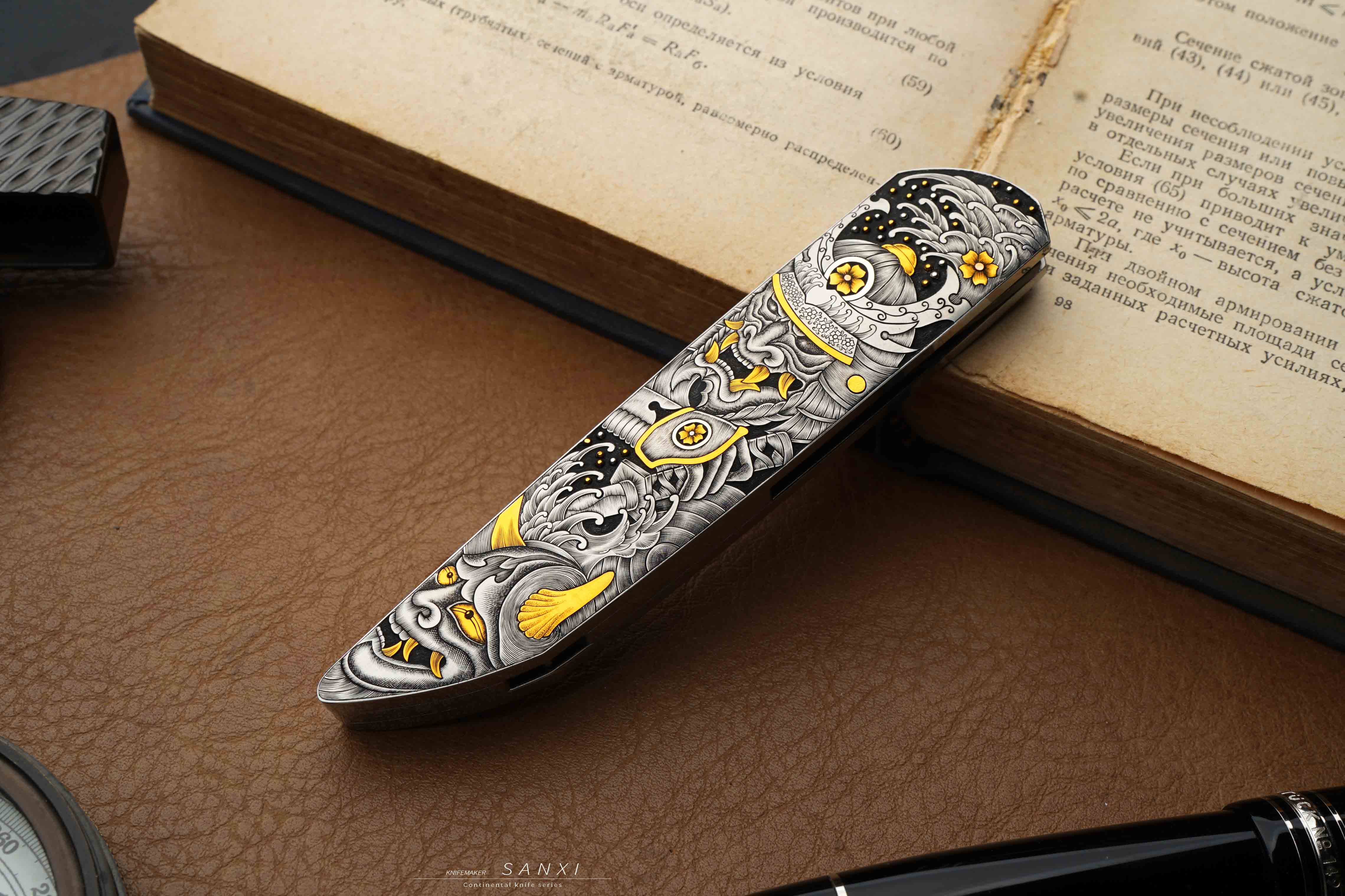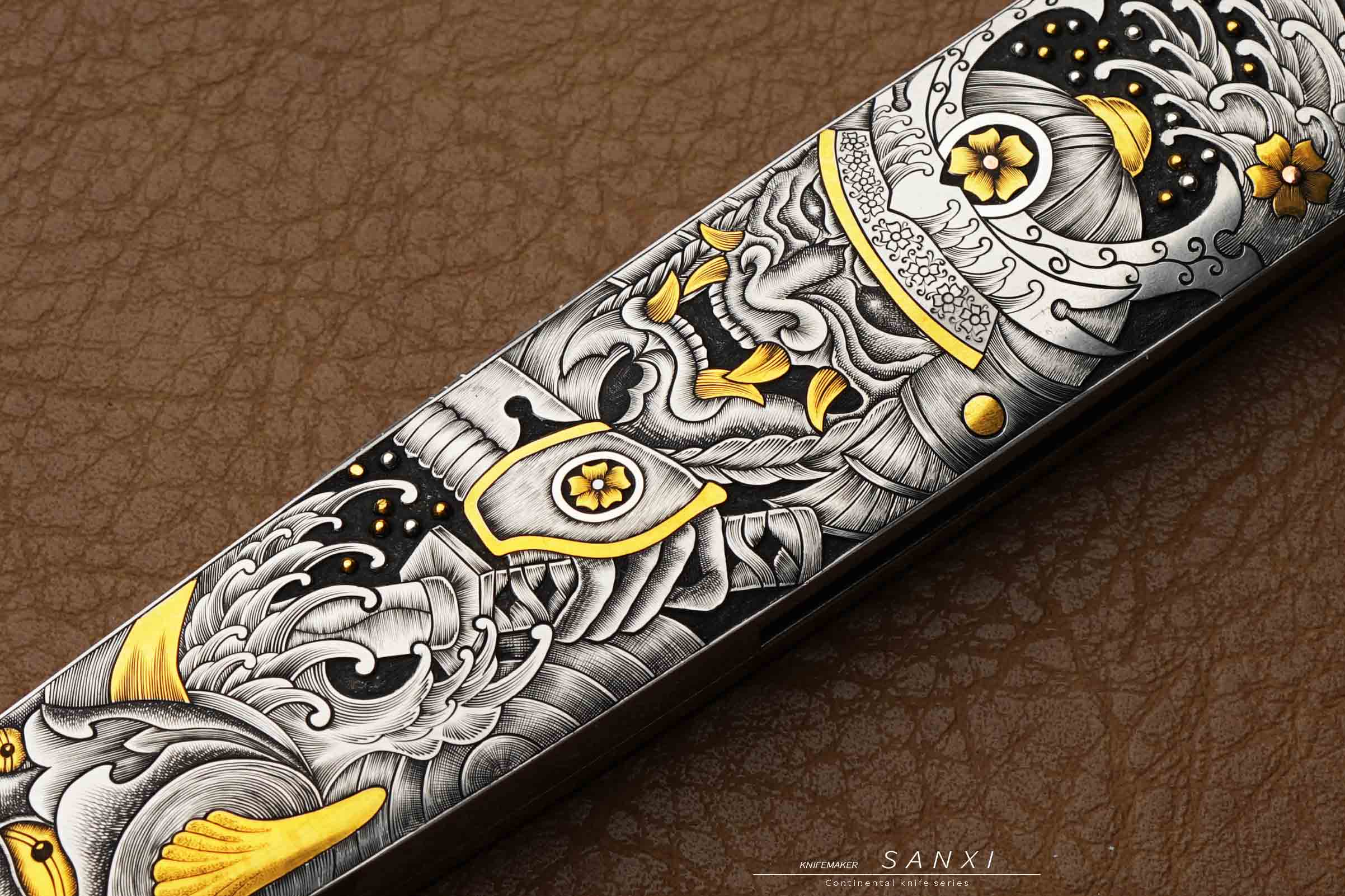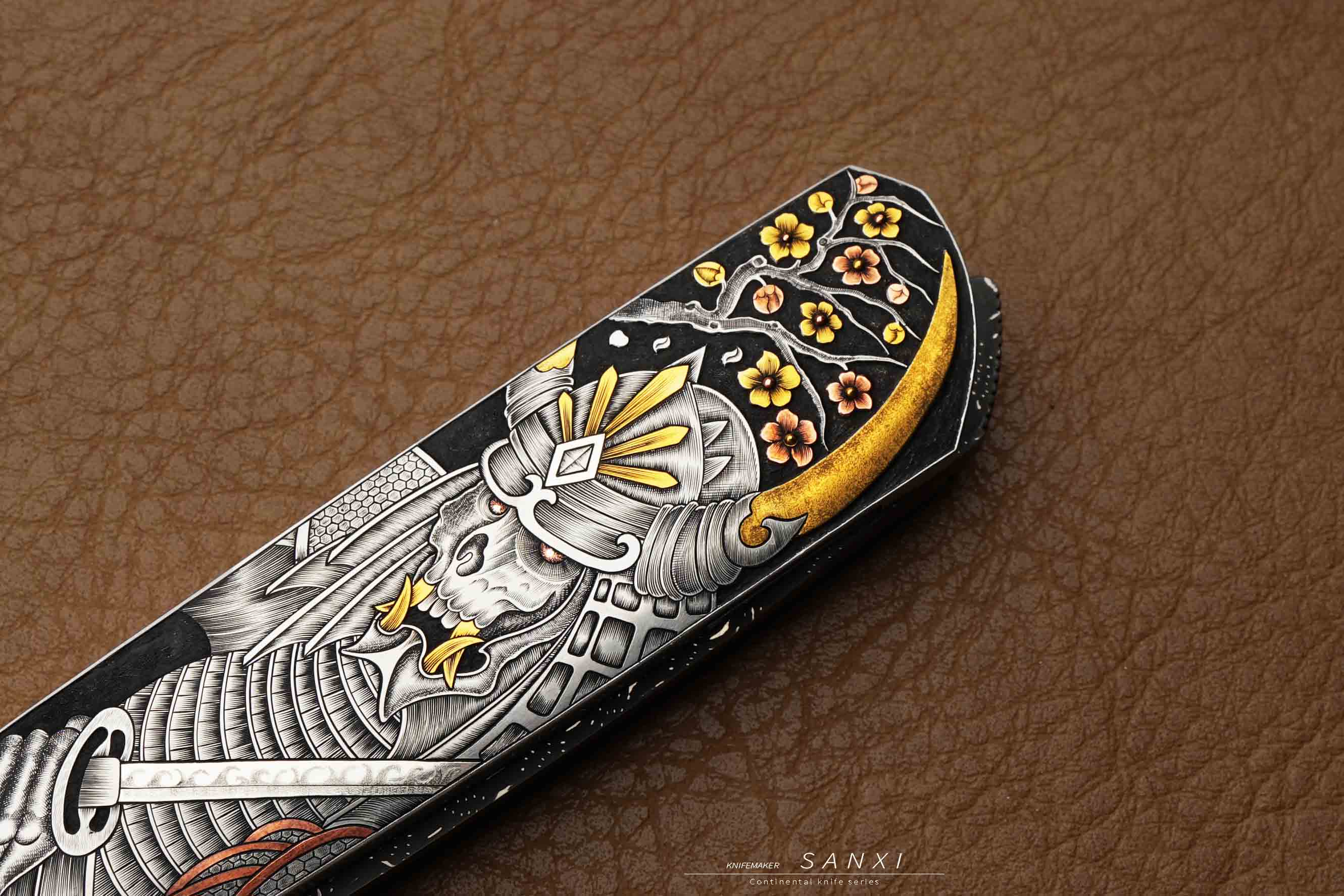 高配雕刻小折作品,全手工雕刻鬼武士主题图案,画面夸张、细节灵动,大面积镶嵌、点缀24k真金,手锻大马刃