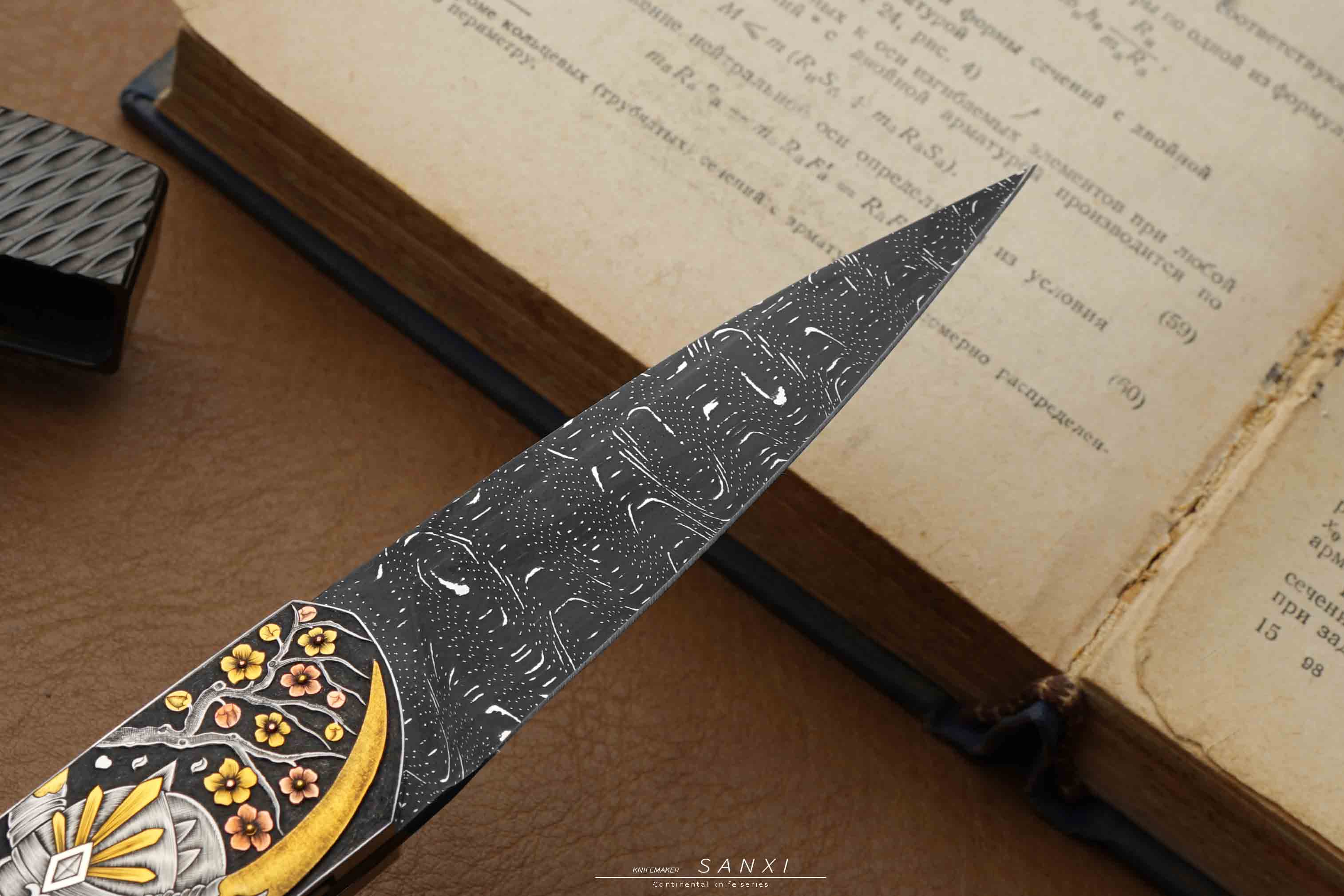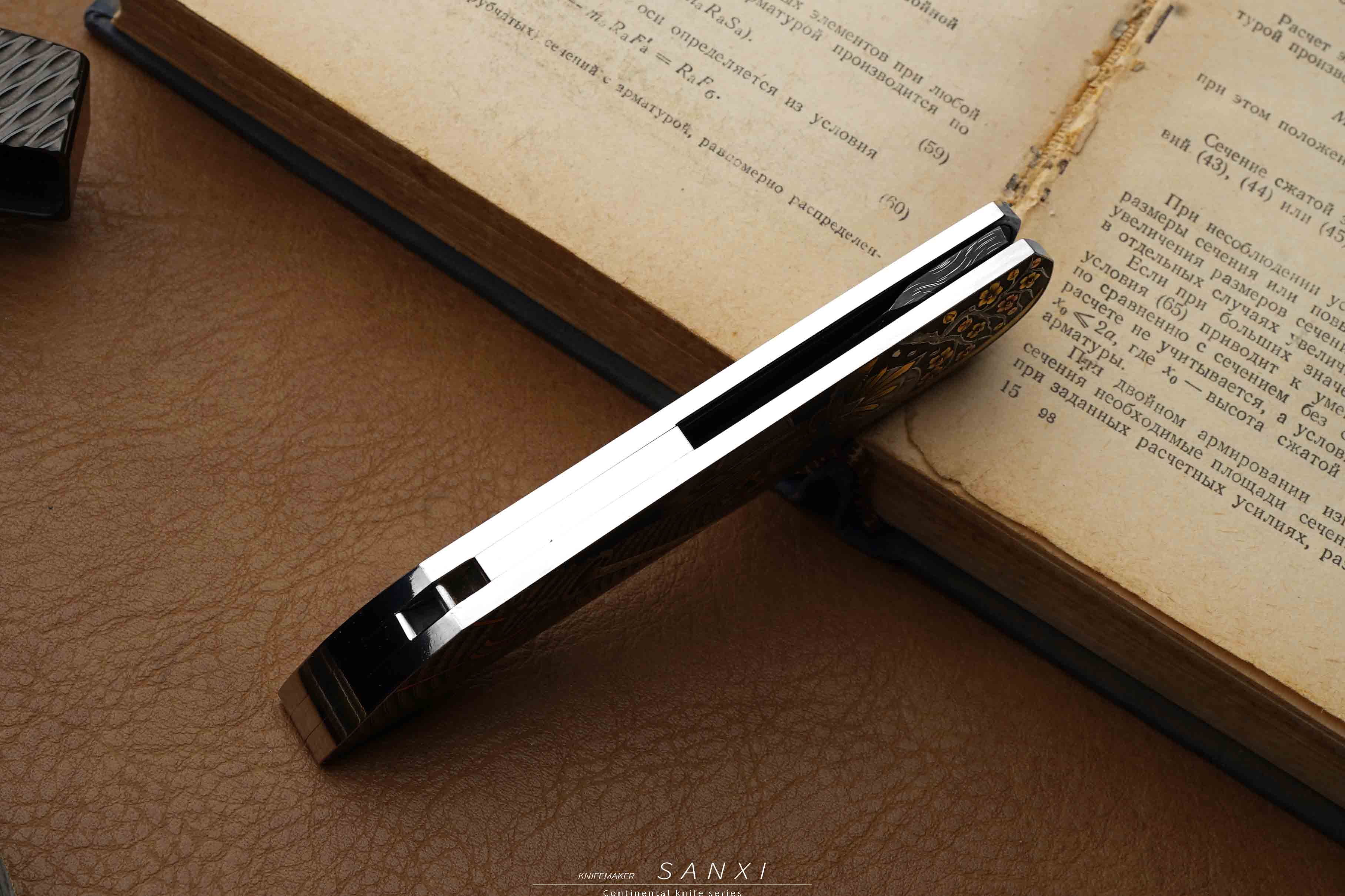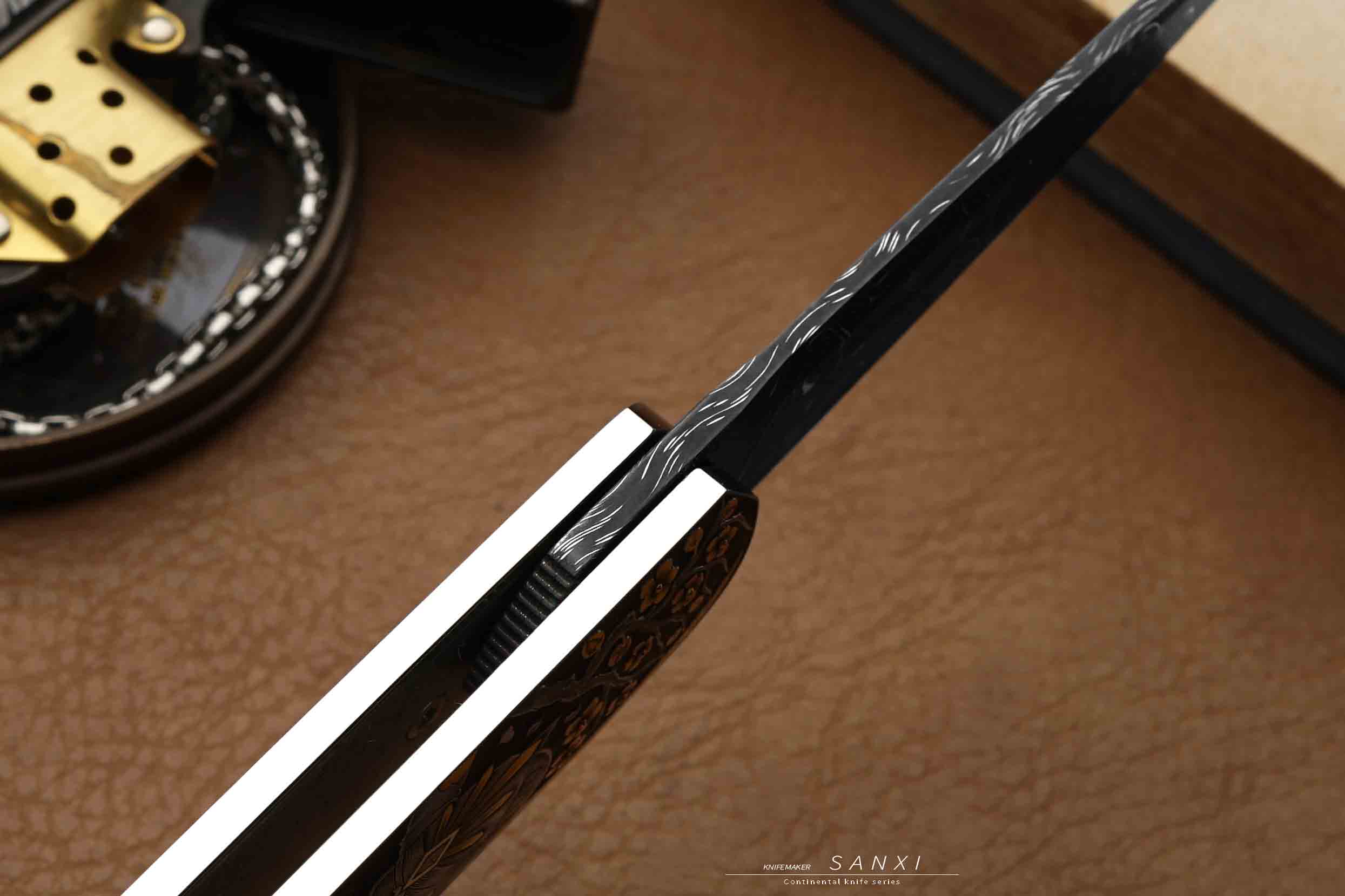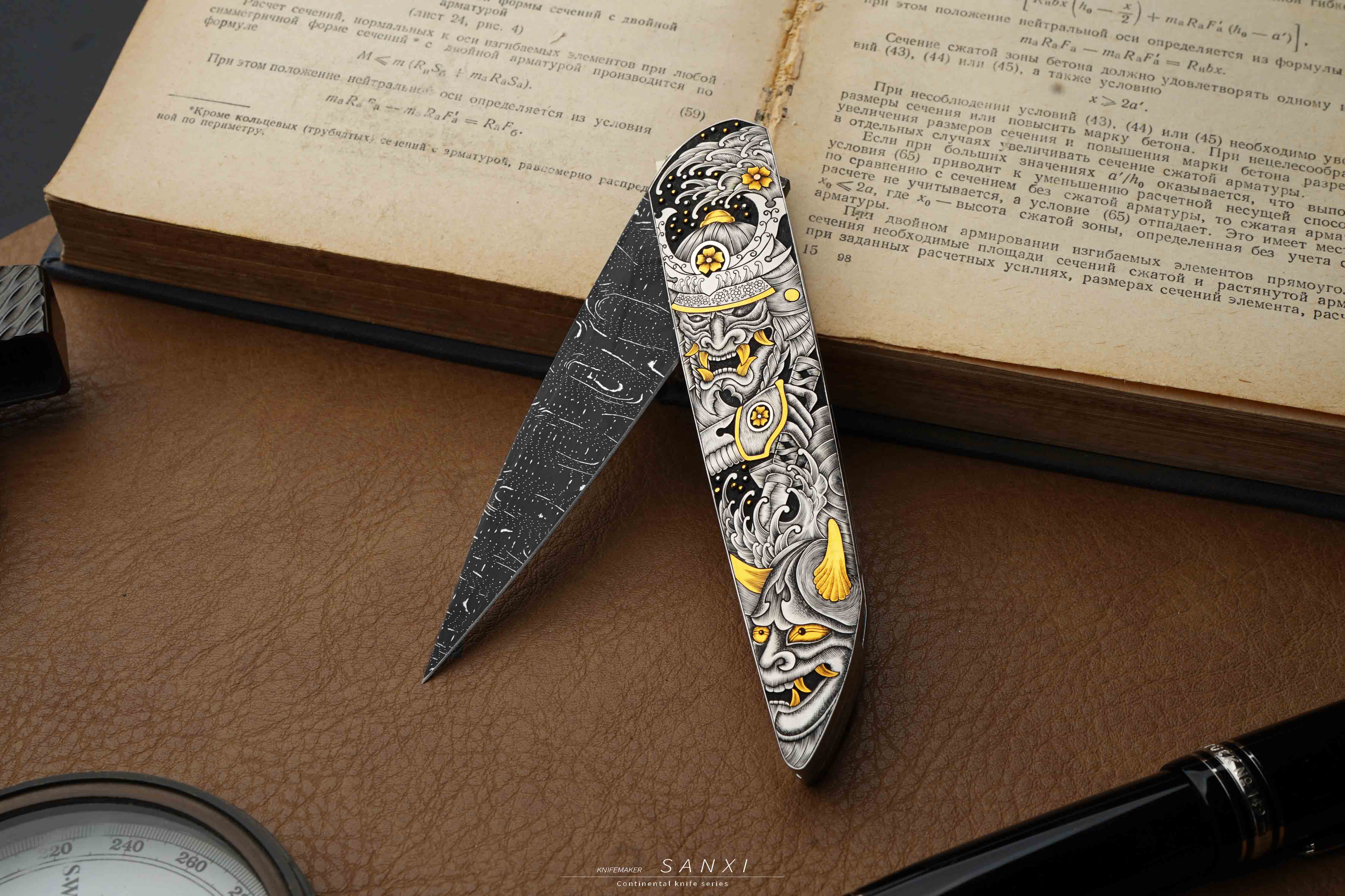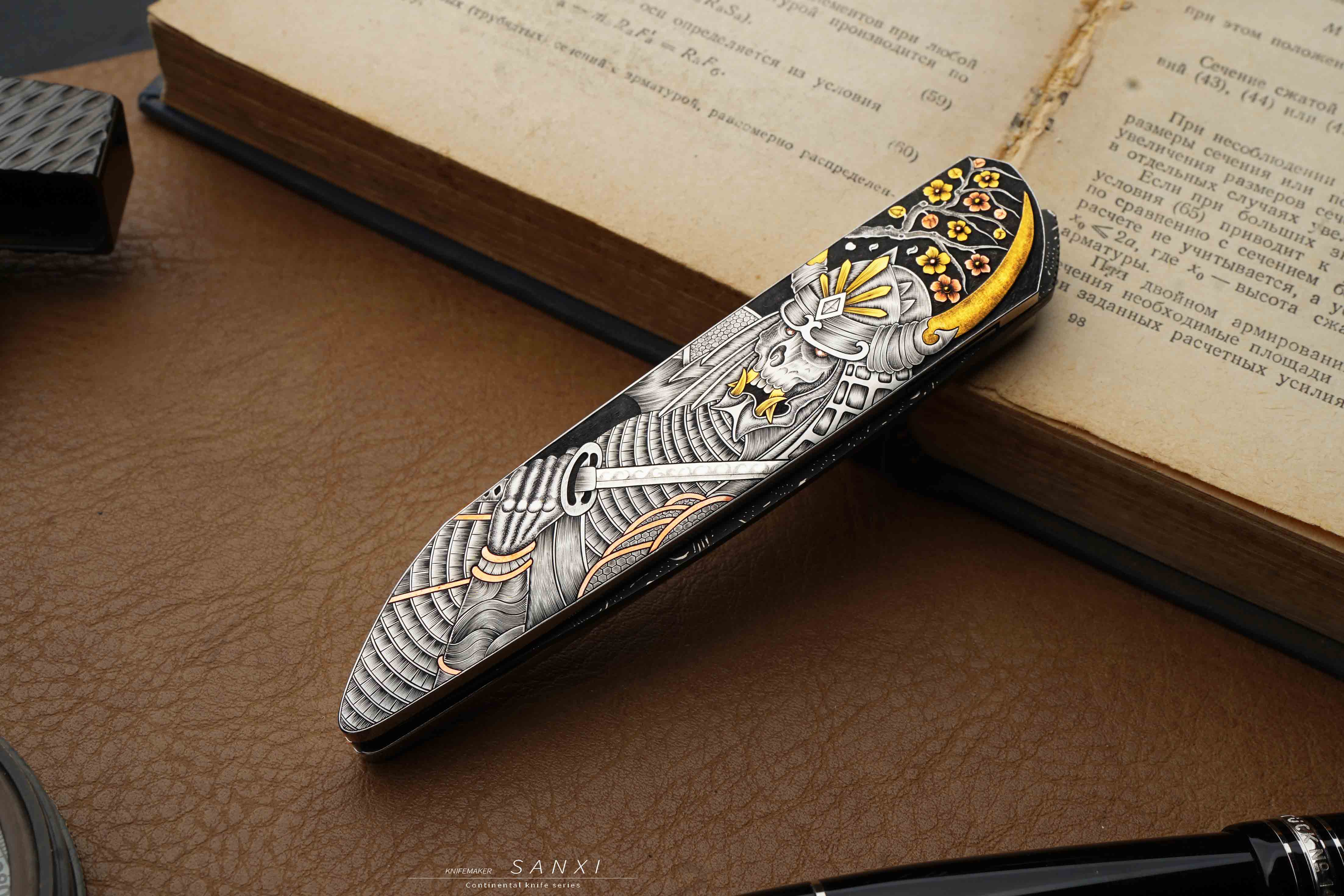 高配雕刻小折作品,全手工雕刻鬼武士主题图案,画面夸张、细节灵动,大面积镶嵌、点缀24k真金,手锻大马刃