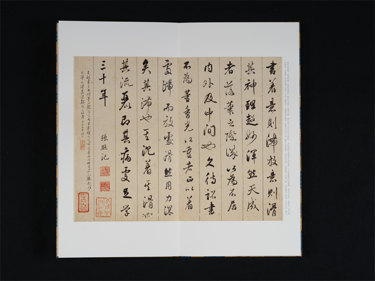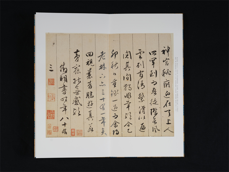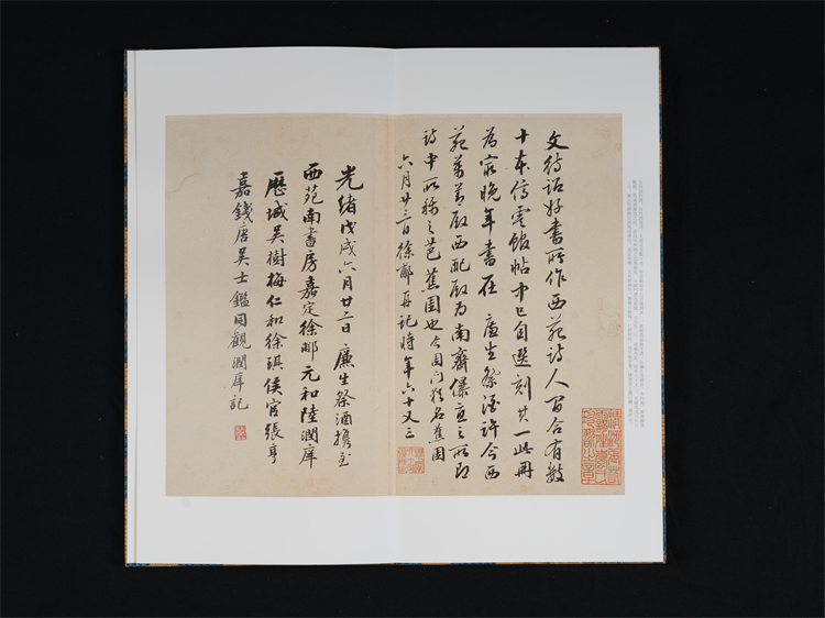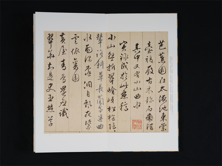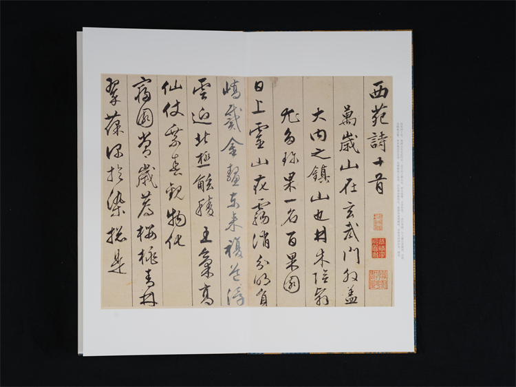 天津博物馆藏文征明《西苑诗》册,正文十二开,写于乌丝栏内,原为手卷,后改称册页。卷后有张照、徐郙、陆润庠等人跋三开。文中西苑即现在的中南海、北海、景山等地,乃皇家园林,嘉靖四年(1525)文征明与陈鲁南、马仲房一同游览西苑后作《西苑诗》七律十首。此件作品笔精墨妙,点画干净利落,转折处提笔顿挫把握有度,是典型的文征明小字行草书风格。