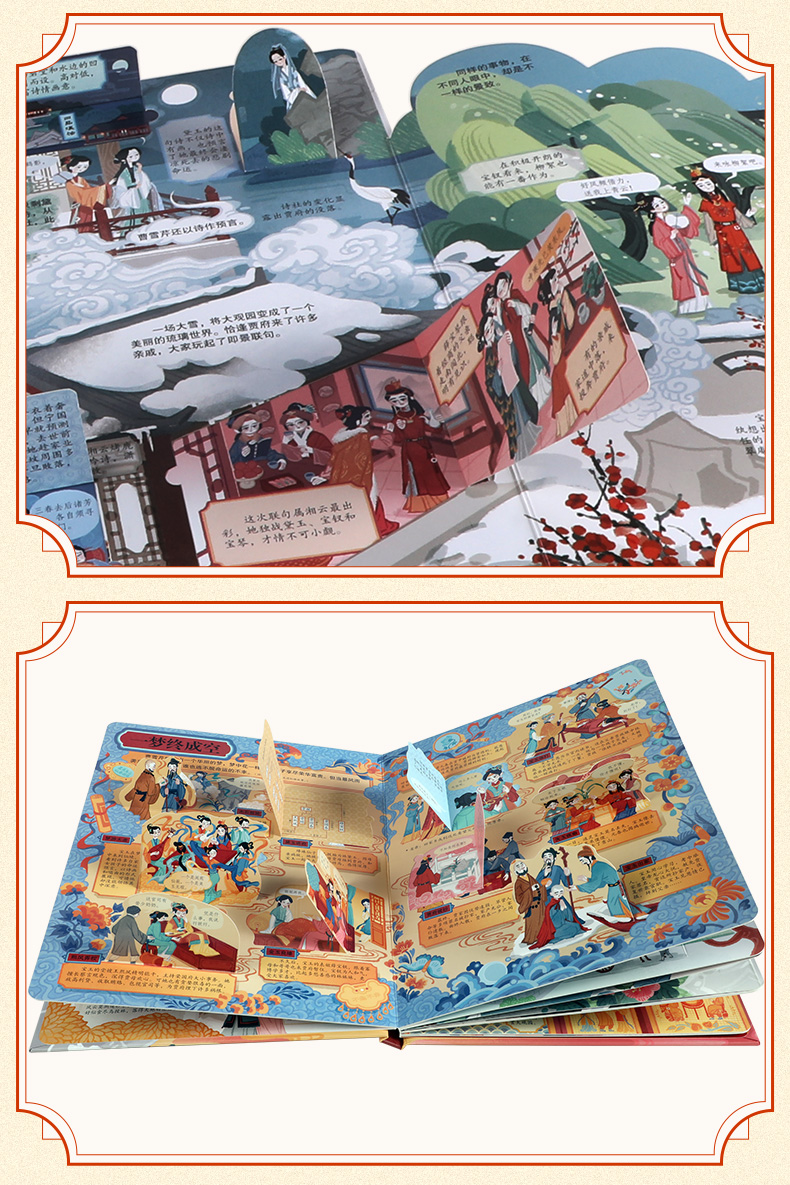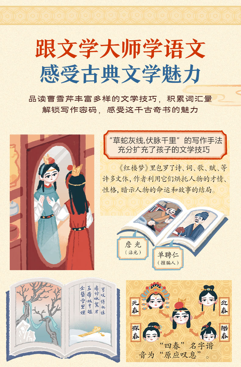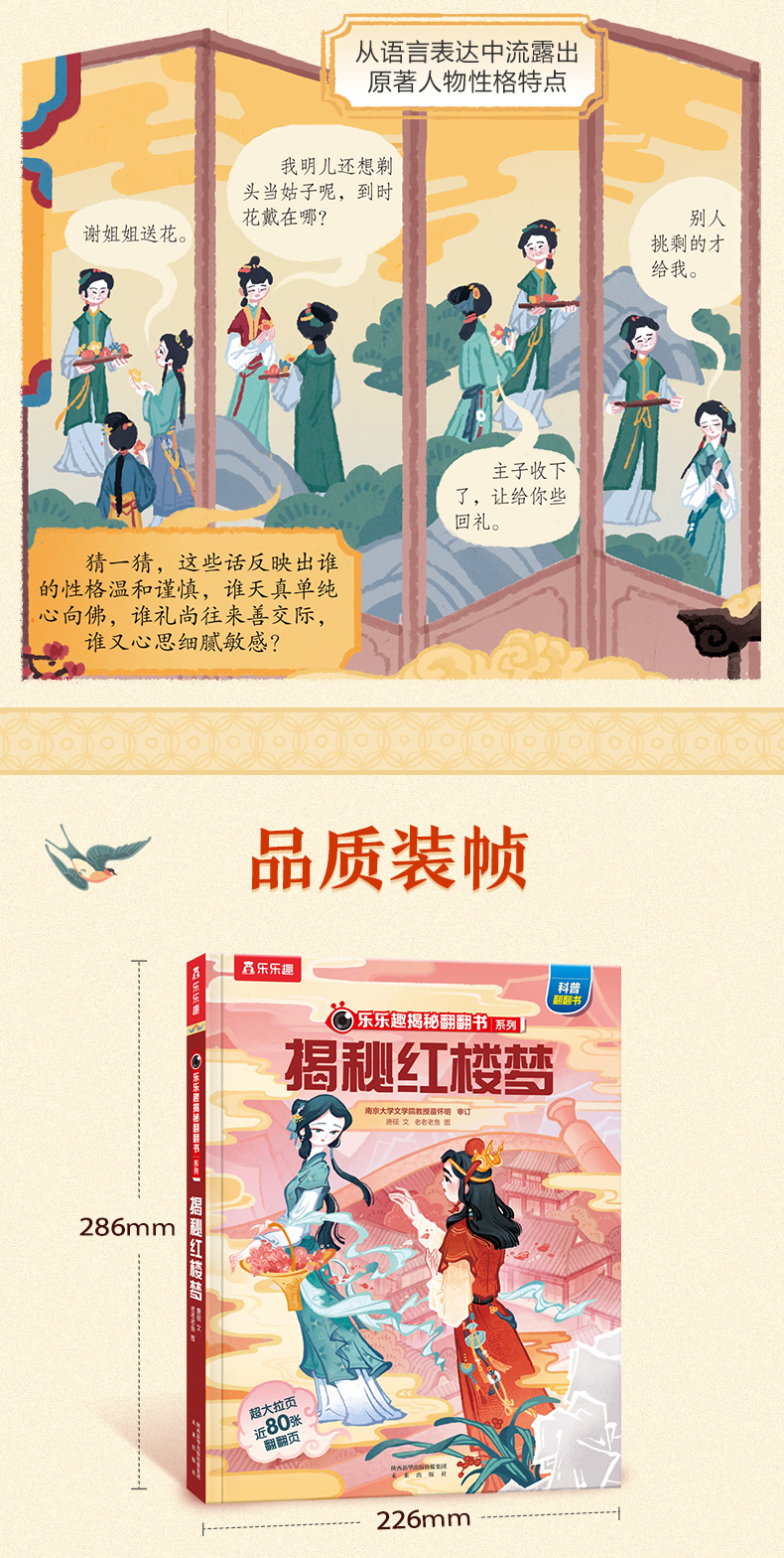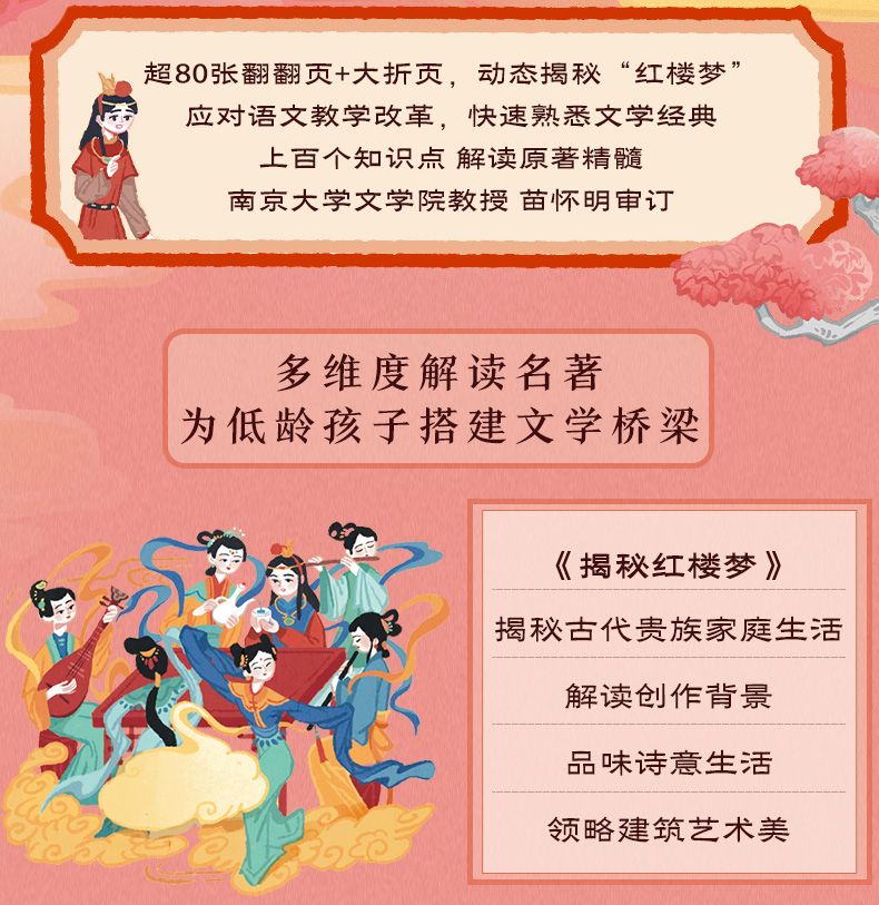 用经典打开传统文化之门,让《红楼梦》带孩子踏上亲近古典文学之旅。 《红楼梦》作为中国古典文学巅峰之作,有超高的文学价值、艺术价值、思想价值,原著中包含了大量中国传统文化知识,是孩子亲近国学优选的“领路人”。用名著夯实孩子人文素养,让孩子自小多一分从容与自信。 从儿童视角出发,以儿童语言编写,让孩子读得懂,才能喜欢读。孩子的第一本名著入门小百科, 独特的翻翻书形式,超过二百个知识点,让孩子在“悦”读中,看到多维度的“红楼”世界。 作为低年龄段孩子的第一本名著入门书,这本书不仅在语言风格上亲近儿童,在插画形式上以迎合孩子的审美需求,还采取了深受孩子喜欢的翻翻书的形式,让孩子获取主动探索的乐趣,从而激发阅读兴趣。全书用精心设计的近80个翻翻页,选取了诸如黛玉进府、宝钗扑蝶、海棠诗会、刘姥姥游大观园等孩子最感兴趣的经典情节。除了故事赏读,内容还涉及诗词文化、礼仪文化、节庆风俗、建筑艺术等,让孩子从不同的角度了解《红楼梦》,成为“红楼”小专家。 探寻艺术的宝殿,走进曹雪芹的书房,感受文学大师炉火纯青的语言功力及博大精深的文化内涵, 品读诸多高超的写作技巧,培育孩子的人文修养。 曹雪芹如何通过几句话就让不同人的人物性格跃然纸上?书中很多神秘的设计又有什么隐喻?解读曹雪芹笔下“谜语”的“钥匙”又是什么?好人就没有缺点吗?看文学大师如何将人物写得更立体。这本书带你解锁曹雪芹的写作密码,感受古典文学巅峰之作的魅力。 面对语文教学改革,帮助孩子提前熟悉经典。 了解原著内容,普及名著常识,拓展传统文化知识,帮助孩子提前熟悉经典。随着语文教育改革不断深入,传统文化在考试中占比日益提高,《红楼梦》已进入小学必读书目,甚至在一些幼升小的考试中都出现相关题目。更早让孩子走进经典,开拓孩子人文知识面,培养阅读力。 名家审读,为知识的准确度保驾护航。 审稿专家:苗怀明,1968年生,河南平舆人。南京大学文学院副院长,教授,博士生导师。兼任中国俗文学学会副会长,江苏省红楼梦学会会长。古代小说网微信公众号(gudaixiaoshuo123)创办人和主持人。出版有《中国古代公案小说史论》、《话说红楼梦》、《梦断灵山:妙语说西游》等学术专著。
