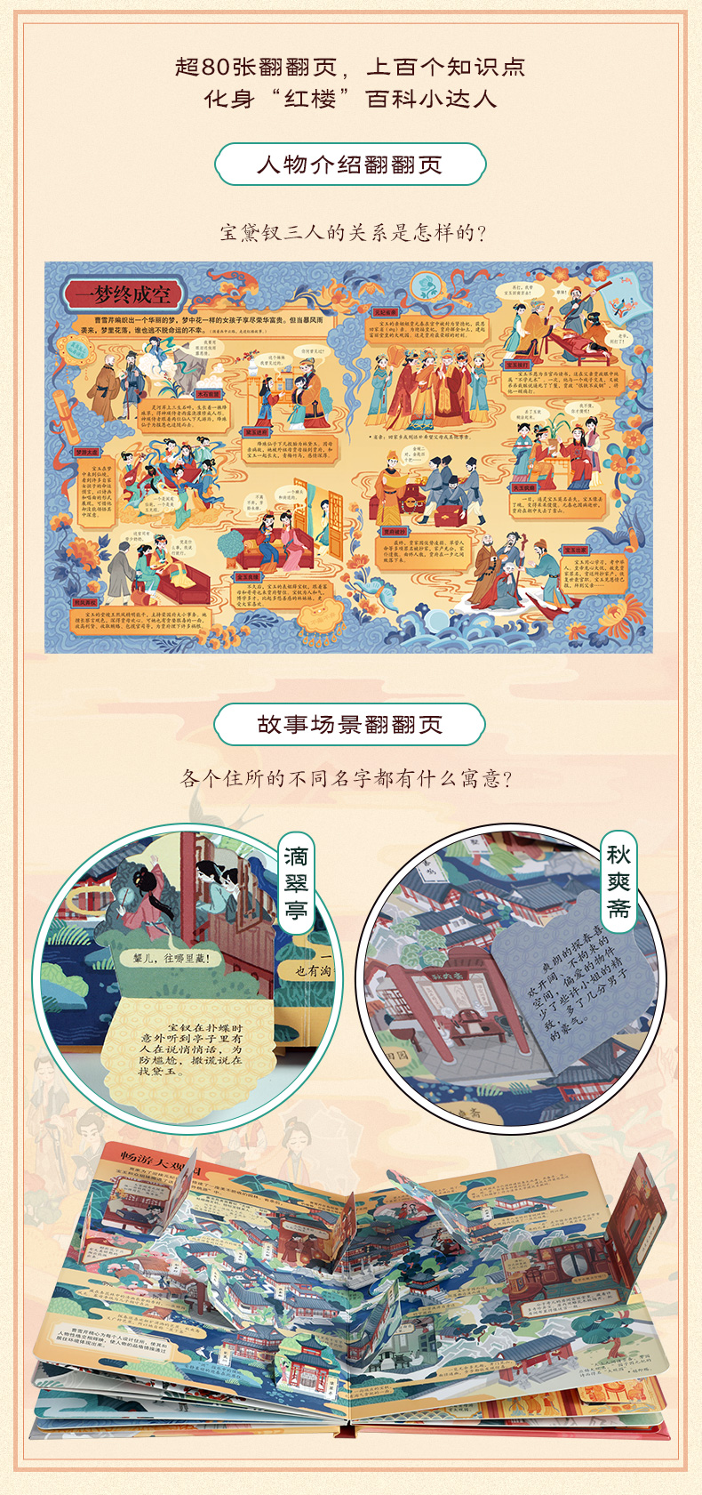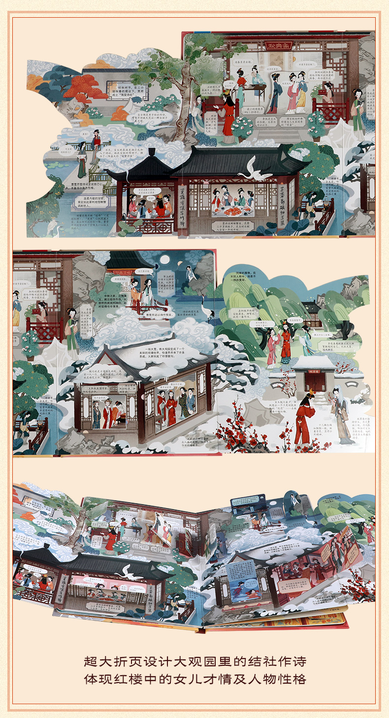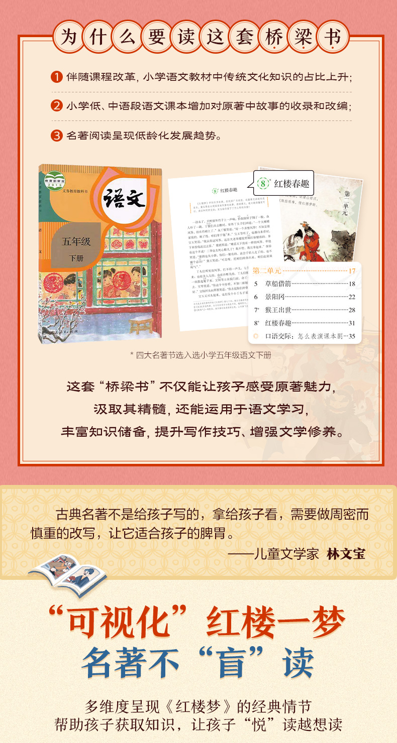 用经典打开传统文化之门,让《红楼梦》带孩子踏上亲近古典文学之旅。 《红楼梦》作为中国古典文学巅峰之作,有超高的文学价值、艺术价值、思想价值,原著中包含了大量中国传统文化知识,是孩子亲近国学优选的“领路人”。用名著夯实孩子人文素养,让孩子自小多一分从容与自信。 从儿童视角出发,以儿童语言编写,让孩子读得懂,才能喜欢读。孩子的第一本名著入门小百科, 独特的翻翻书形式,超过二百个知识点,让孩子在“悦”读中,看到多维度的“红楼”世界。 作为低年龄段孩子的第一本名著入门书,这本书不仅在语言风格上亲近儿童,在插画形式上以迎合孩子的审美需求,还采取了深受孩子喜欢的翻翻书的形式,让孩子获取主动探索的乐趣,从而激发阅读兴趣。全书用精心设计的近80个翻翻页,选取了诸如黛玉进府、宝钗扑蝶、海棠诗会、刘姥姥游大观园等孩子最感兴趣的经典情节。除了故事赏读,内容还涉及诗词文化、礼仪文化、节庆风俗、建筑艺术等,让孩子从不同的角度了解《红楼梦》,成为“红楼”小专家。 探寻艺术的宝殿,走进曹雪芹的书房,感受文学大师炉火纯青的语言功力及博大精深的文化内涵, 品读诸多高超的写作技巧,培育孩子的人文修养。 曹雪芹如何通过几句话就让不同人的人物性格跃然纸上?书中很多神秘的设计又有什么隐喻?解读曹雪芹笔下“谜语”的“钥匙”又是什么?好人就没有缺点吗?看文学大师如何将人物写得更立体。这本书带你解锁曹雪芹的写作密码,感受古典文学巅峰之作的魅力。 面对语文教学改革,帮助孩子提前熟悉经典。 了解原著内容,普及名著常识,拓展传统文化知识,帮助孩子提前熟悉经典。随着语文教育改革不断深入,传统文化在考试中占比日益提高,《红楼梦》已进入小学必读书目,甚至在一些幼升小的考试中都出现相关题目。更早让孩子走进经典,开拓孩子人文知识面,培养阅读力。 名家审读,为知识的准确度保驾护航。 审稿专家:苗怀明,1968年生,河南平舆人。南京大学文学院副院长,教授,博士生导师。兼任中国俗文学学会副会长,江苏省红楼梦学会会长。古代小说网微信公众号(gudaixiaoshuo123)创办人和主持人。出版有《中国古代公案小说史论》、《话说红楼梦》、《梦断灵山:妙语说西游》等学术专著。