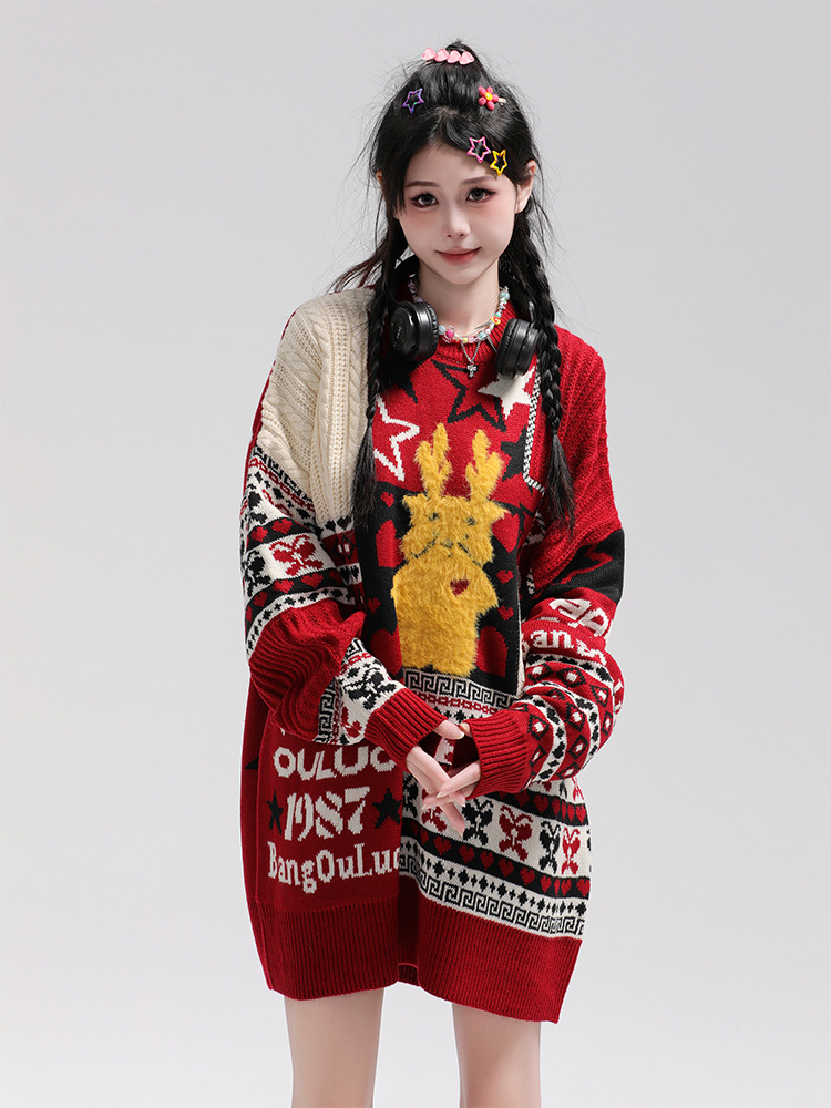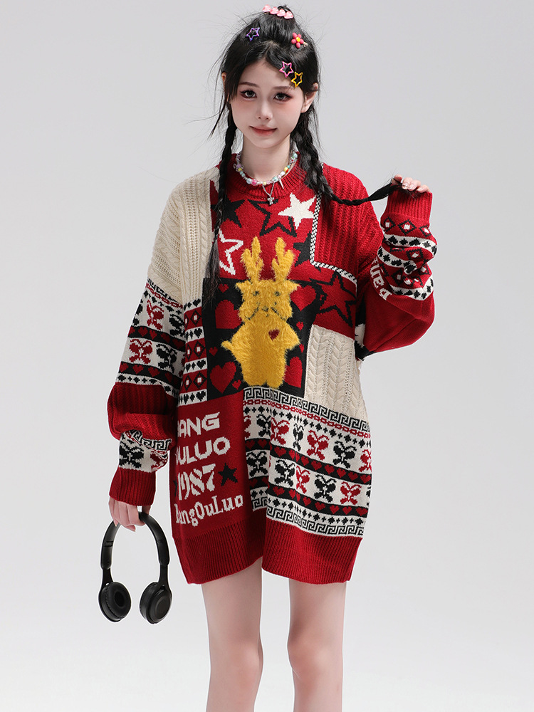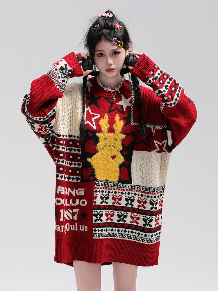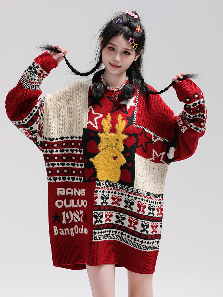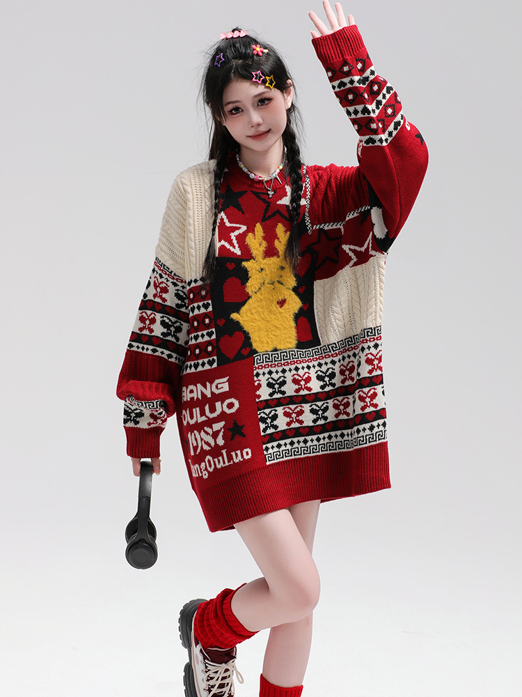 美式复古卡通民族风毛衣男女潮牌慵懒风宽松百搭情侣套头针织衫 商品图0