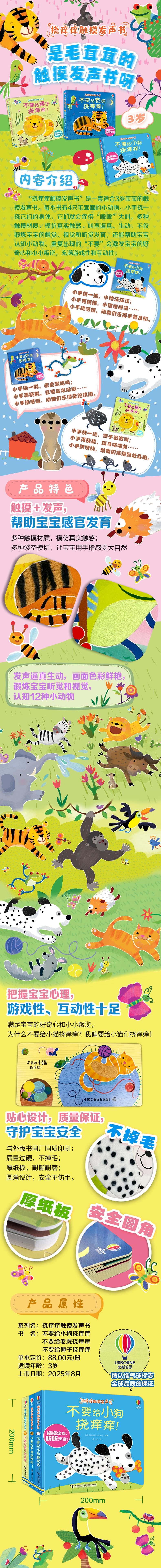 “挠痒痒触摸发声书”一套适合3岁宝宝的触摸发声书,每本书有4只小动物,小手挠一挠它们的身体,它们就会痒得“嗷嗷”大叫。多种触摸材质,模仿真实触感,叫声逼真、生动,不仅锻炼宝宝的触觉、视觉和听觉发育,还能帮助宝宝认知小动物。重复出现的“不要”会激发宝宝的好奇心和小小叛逆,充满游戏性和互动性。《不要给小狗挠痒痒!》里出现了小狗、小猫、豚鼠和毛丝鼠这几种小动物,每只小动物都有着毛茸茸的身体,宝宝的小手挠一挠,动物们痒得手舞足蹈。