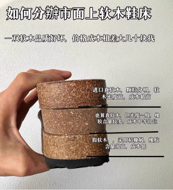 市面上大多数是都是PVC合成的中底或者稻糠屑 那种上脚是非常的硬,而且还是空心的 还穿久了还会脚疼 而脚床中底材料是橡胶软木颗粒,里面是实心的 上脚非常的舒适 这种进口材质市面上没有的 这个你们都是可以去对比 穿10年都不带坏的,质感贼好