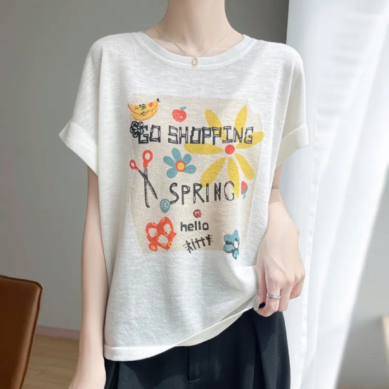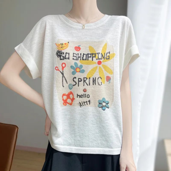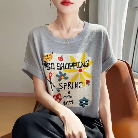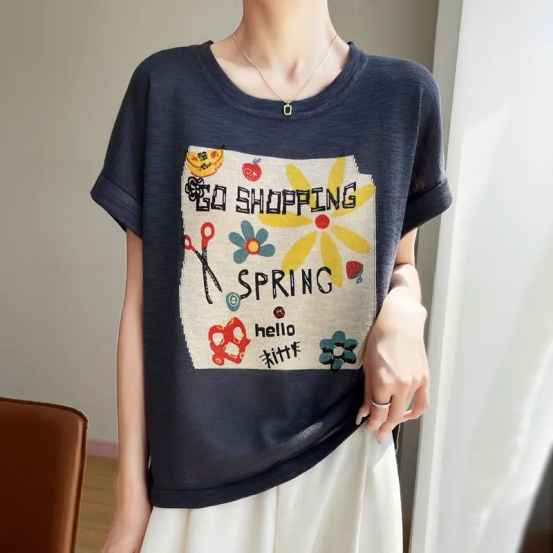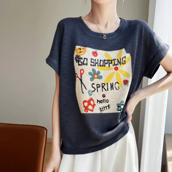 宽松的版型,还特别能遮肉,胳膊上的“拜拜肉”,肚子上的小赘肉,都能藏起来了。 最让人眼前一亮的还是胸前的印花设计。 大片太阳花,俏皮时髦。
