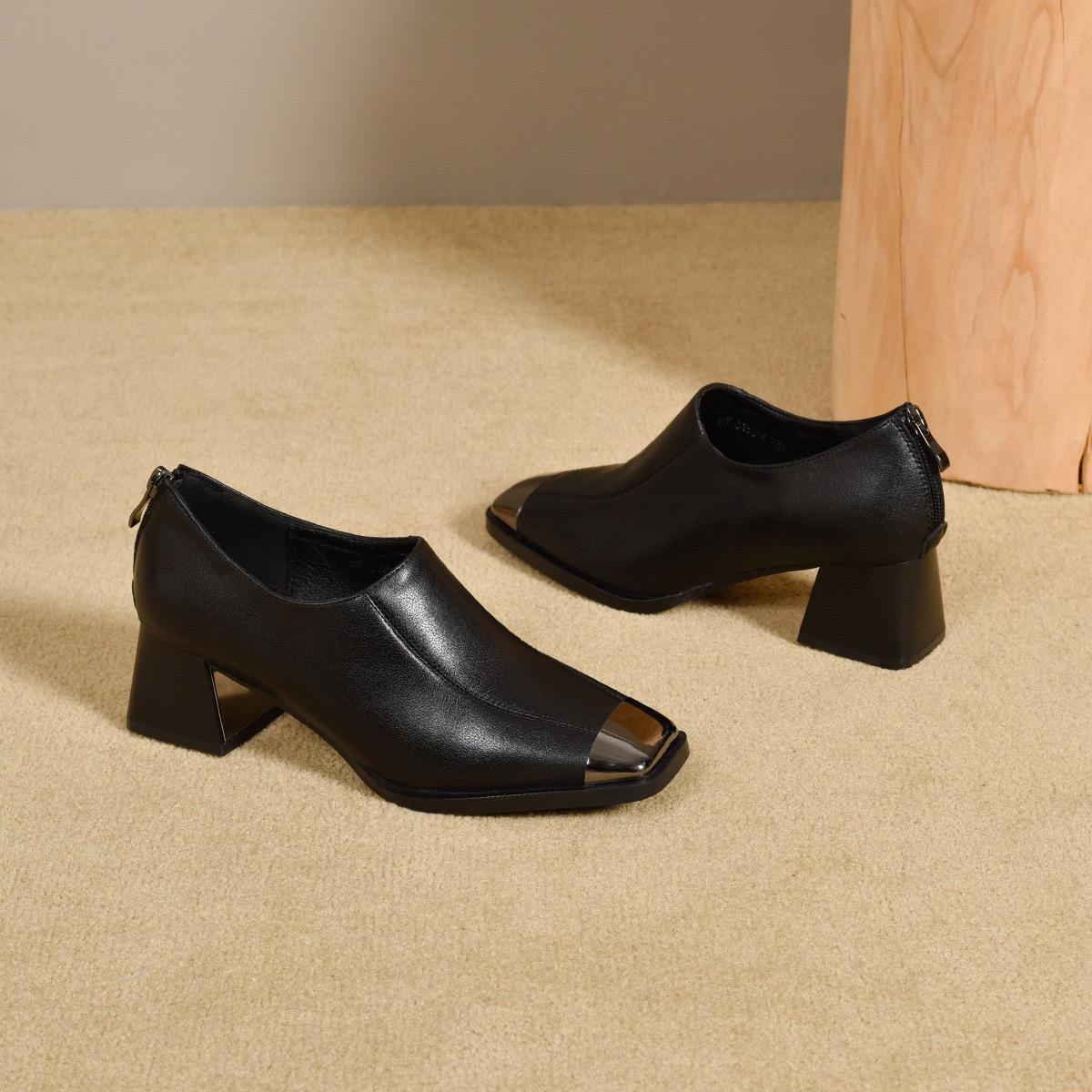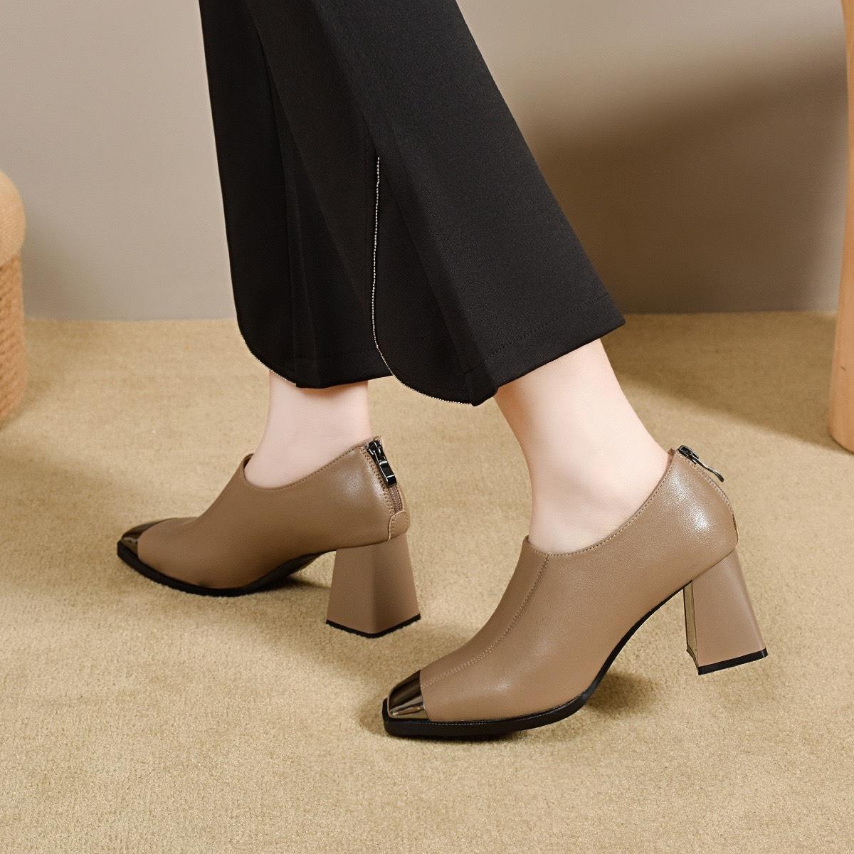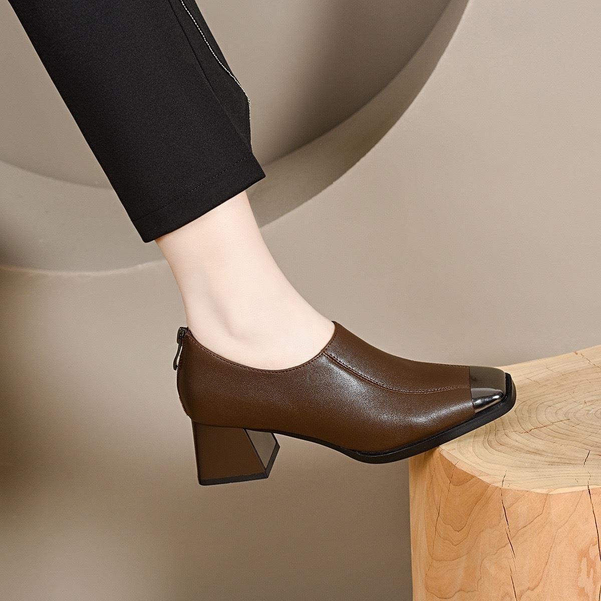2025新款法式气质方头高跟鞋女秋冬软皮粗跟深口单鞋春秋款小皮鞋