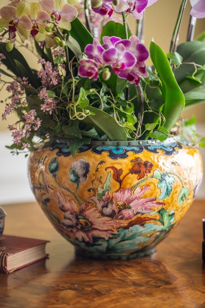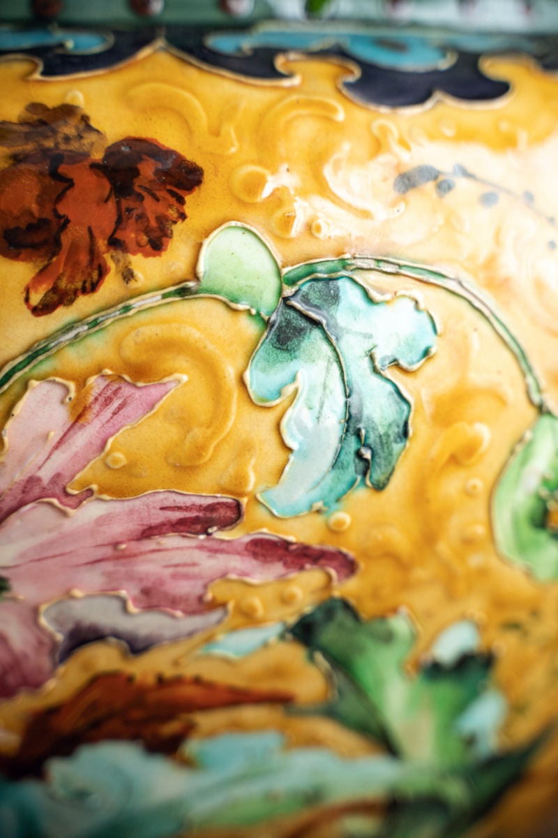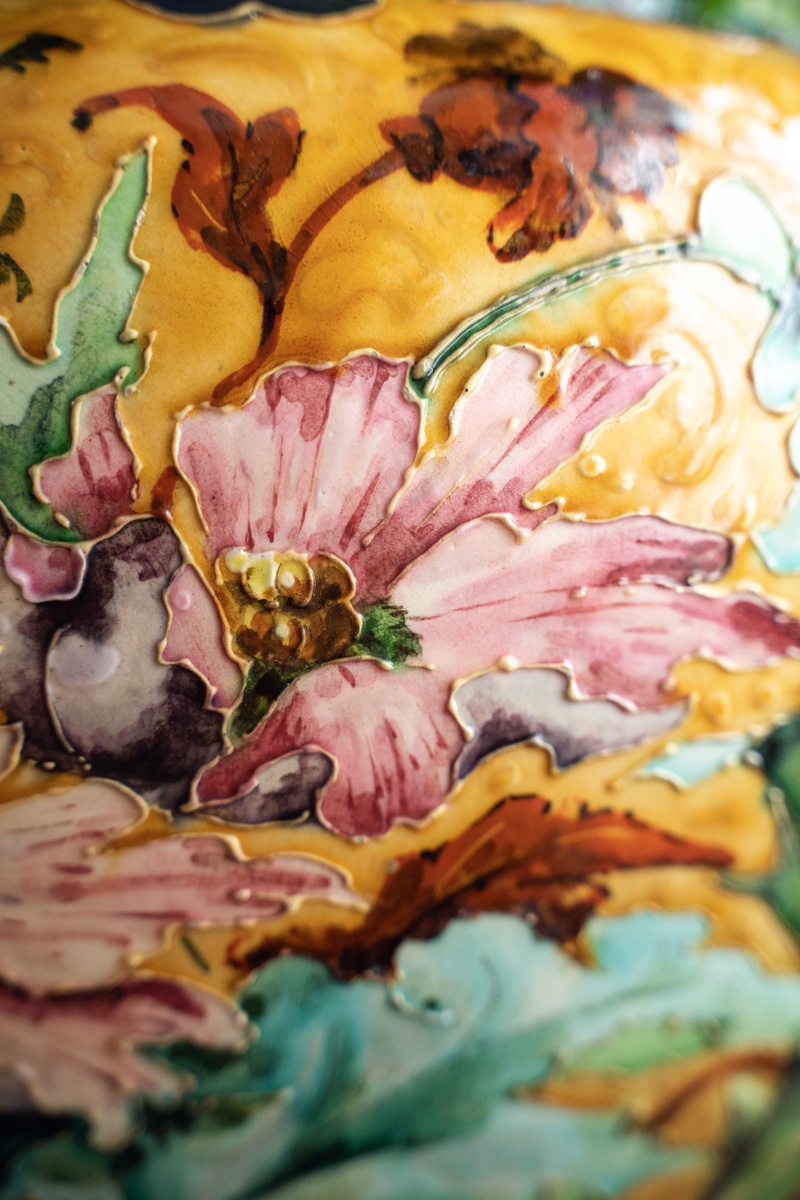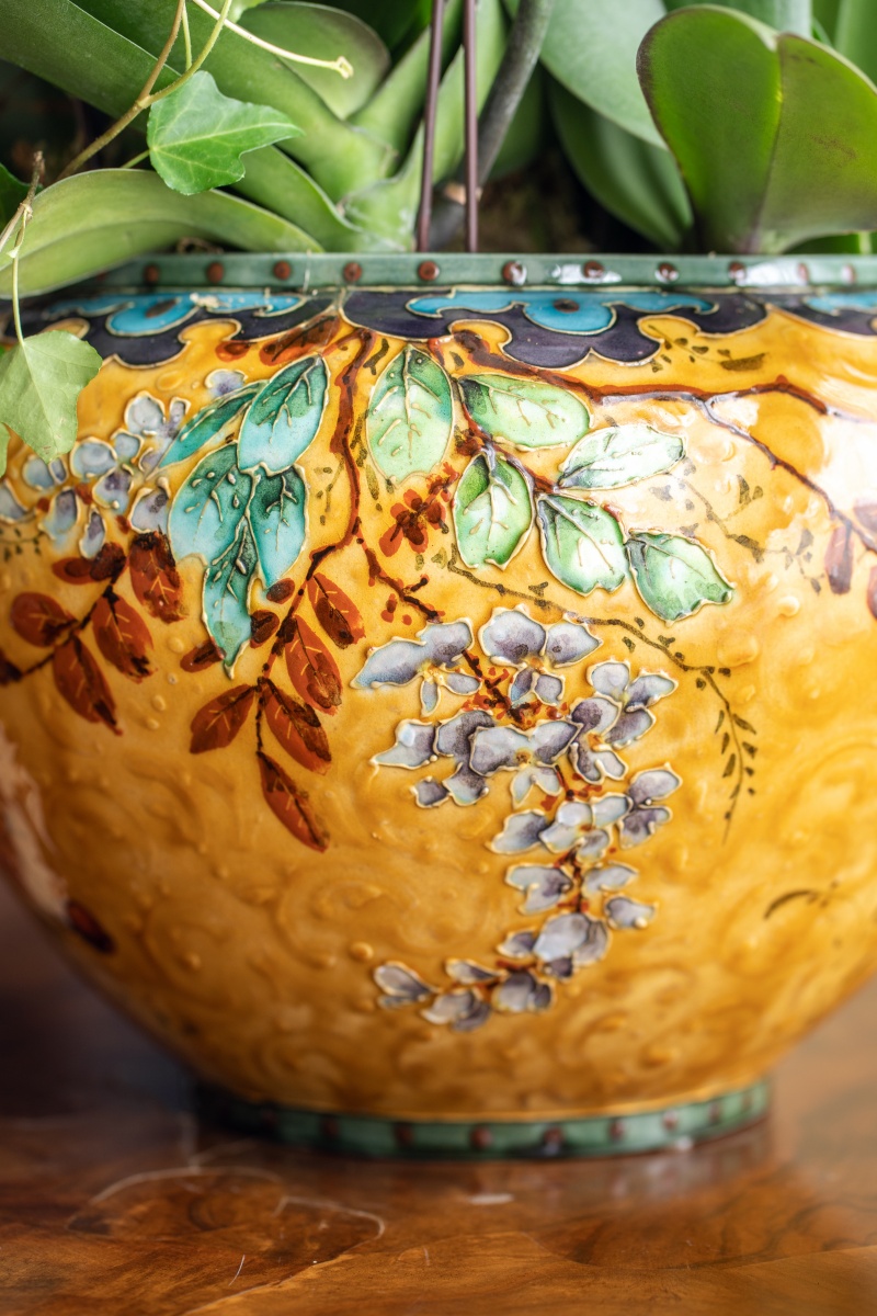 19世纪法国工匠D. Hocheid签名出品Théodore Deck东方风格飞鸟花卉主题彩釉陶瓷花盆