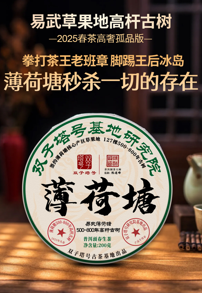 【双子塔号古茶】【5月22日19:00准时开抢!】【专柜价:1980元/片 仅限前66名VIP抢购:180元/片 !拍5发6 拍20发25】2025年薄荷塘500-800年签约18号基地古树 铜锅炒制
