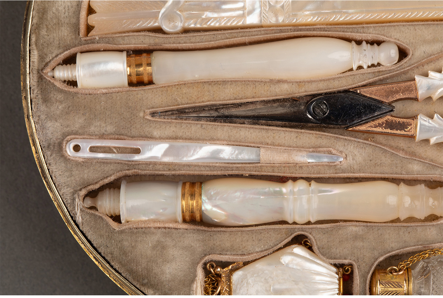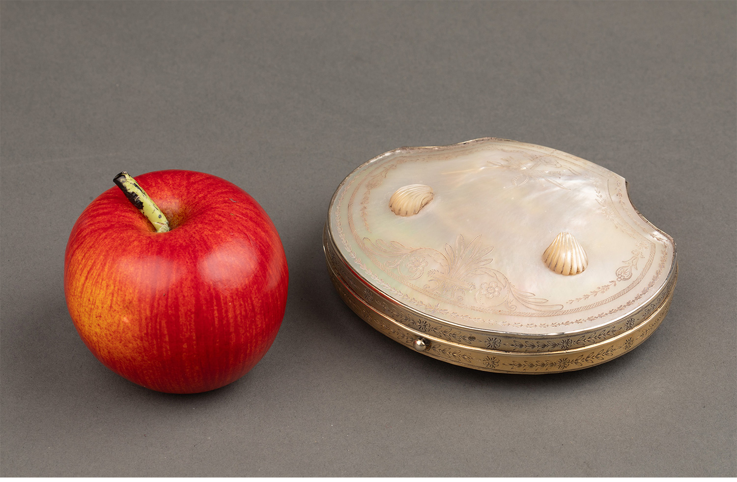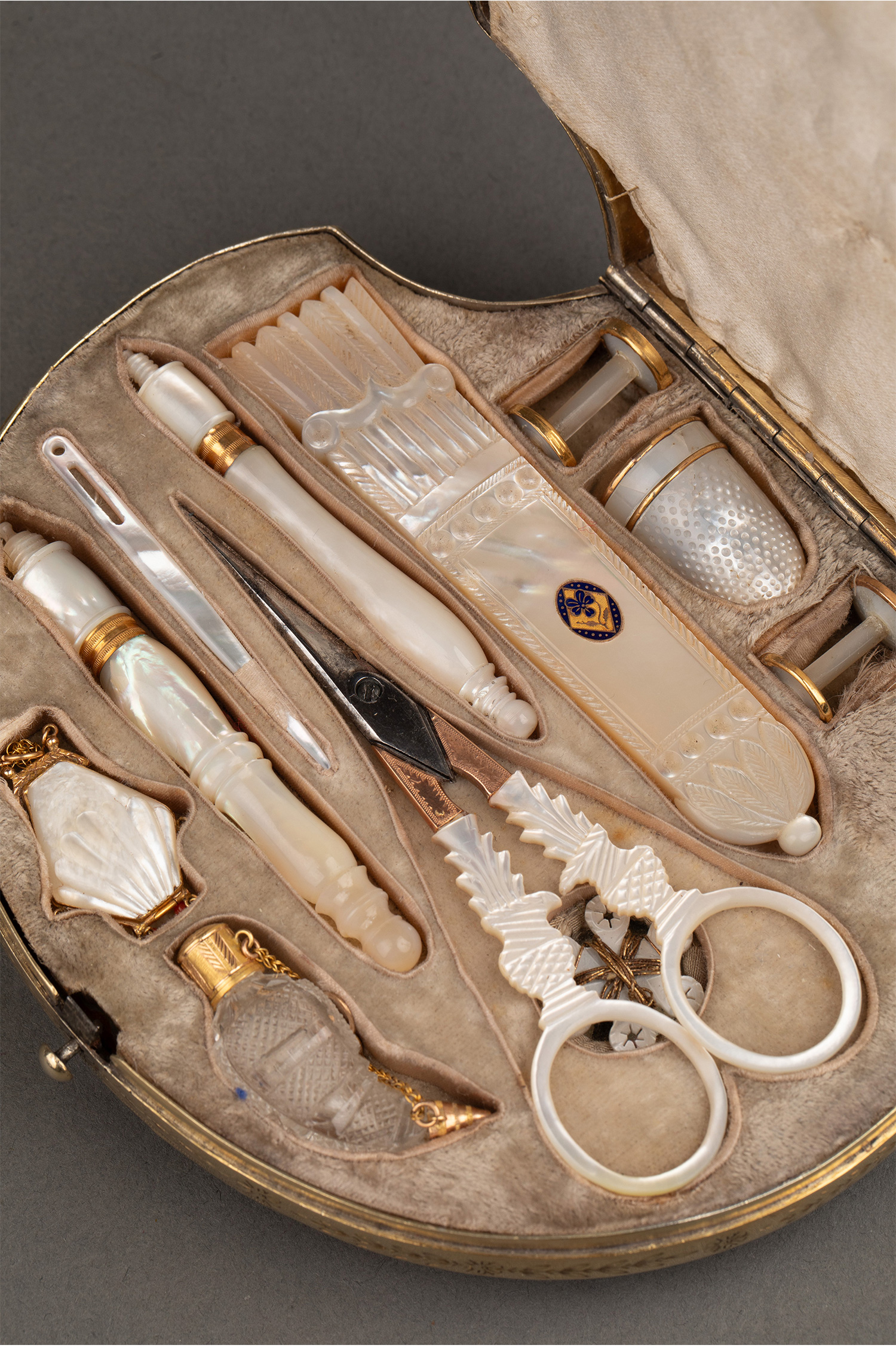 1820年代法国卢浮宫回廊商店出品贝壳造型外盒装饰铜鎏金精雕嵌母贝缝纫套件