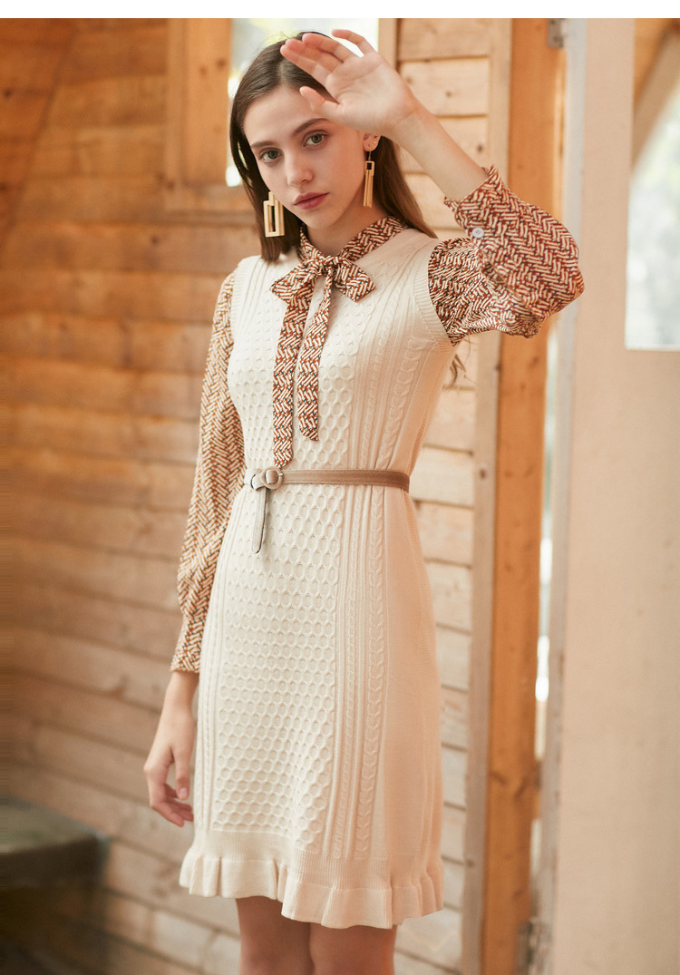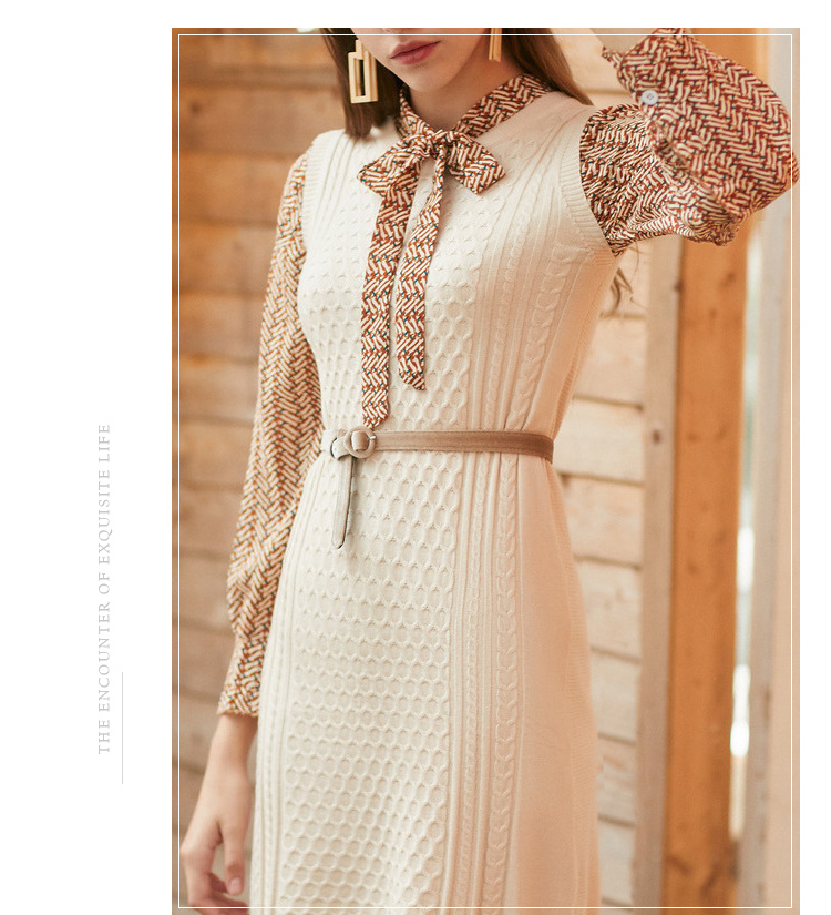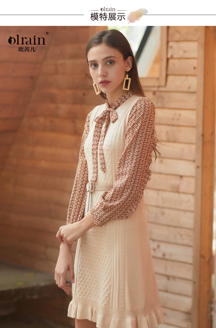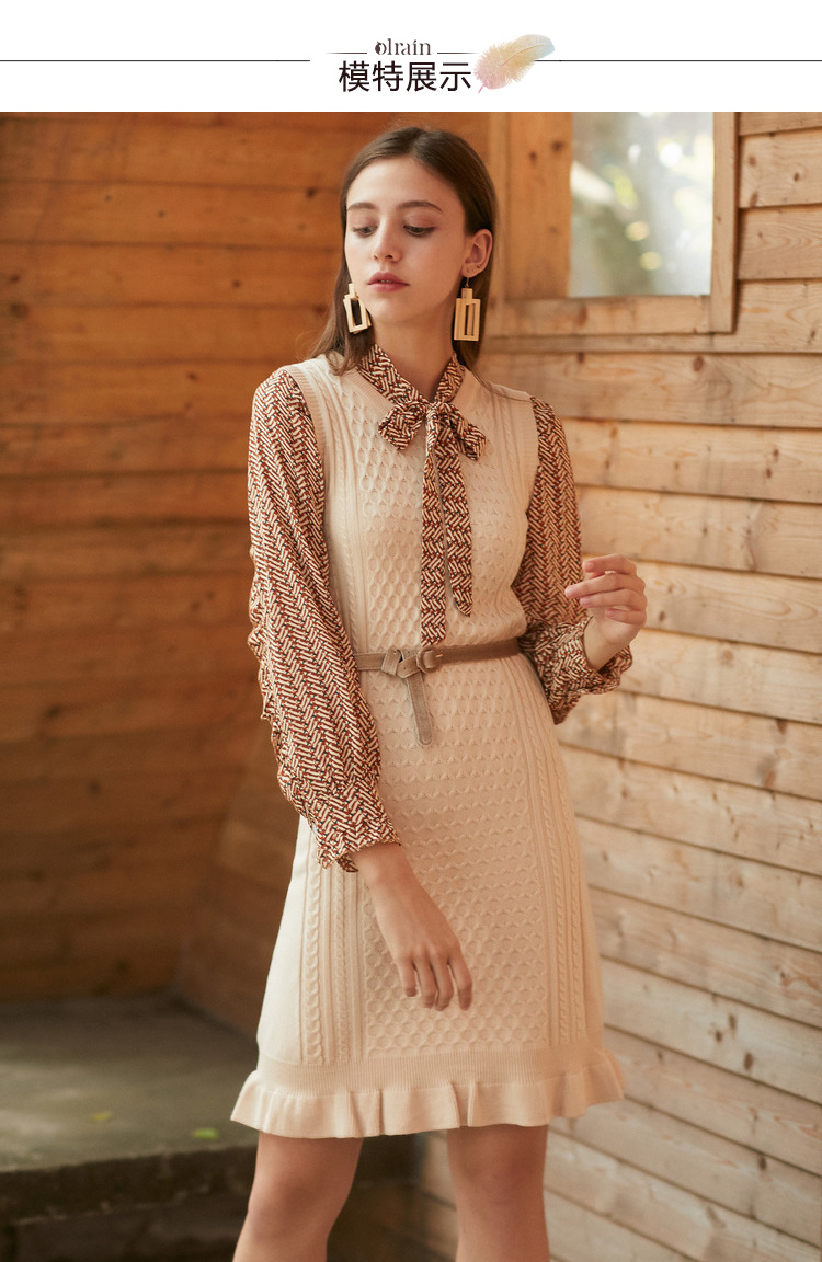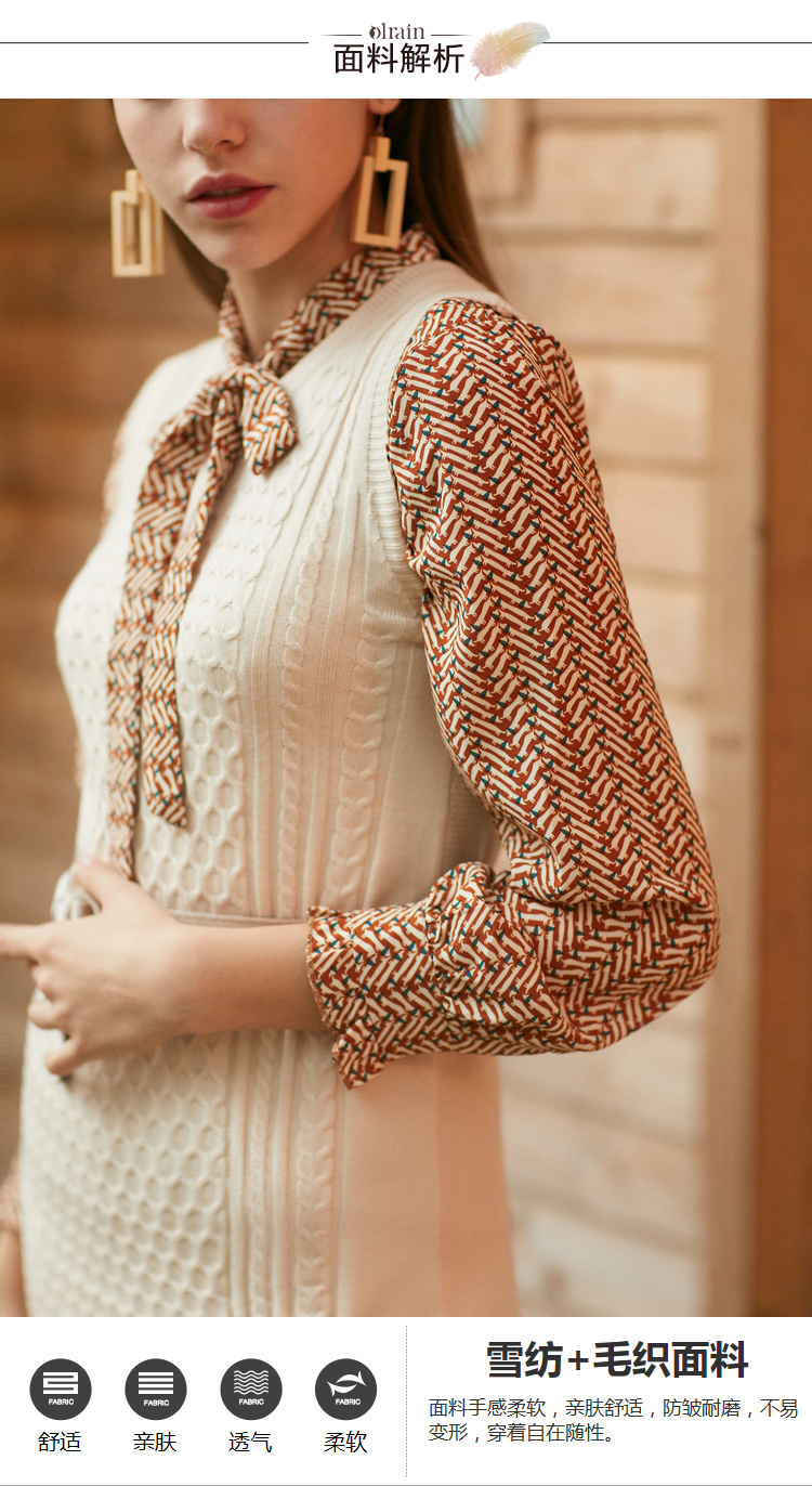 欧芮儿冬装针织背心裙+蝴蝶结碎花雪纺衬衫套装裙子
