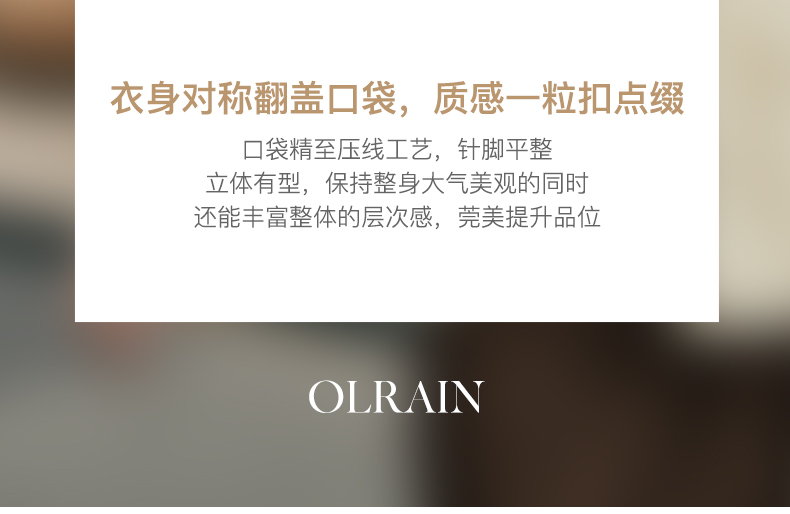“精致”是欧芮儿olrain品牌文化的核心,欧芮儿认为,精致的女人,不但要外在动人,更要内在迷人,内外兼修,有魅力、有气质、有内涵,自信而不自傲,优雅而不矫揉,自有万种风情而不轻浮,更不故作矜持。