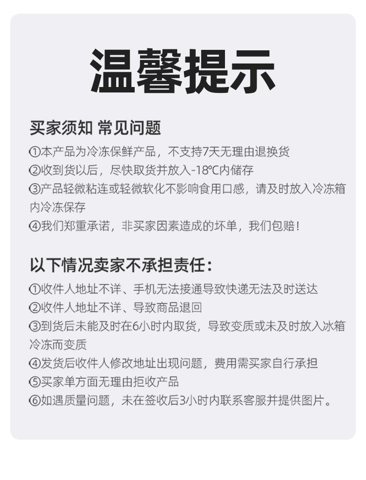 1.生鲜产品不适用7天无理由退换货,有问题签收后48小时内和客服沟通;