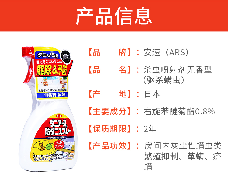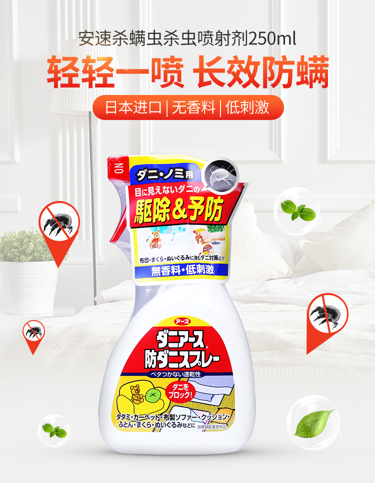 安速ARS 日本进口除螨喷雾防尘螨除螨虫杀螨虫杀虫喷射剂250ml 无香型(新老包装随机发货)