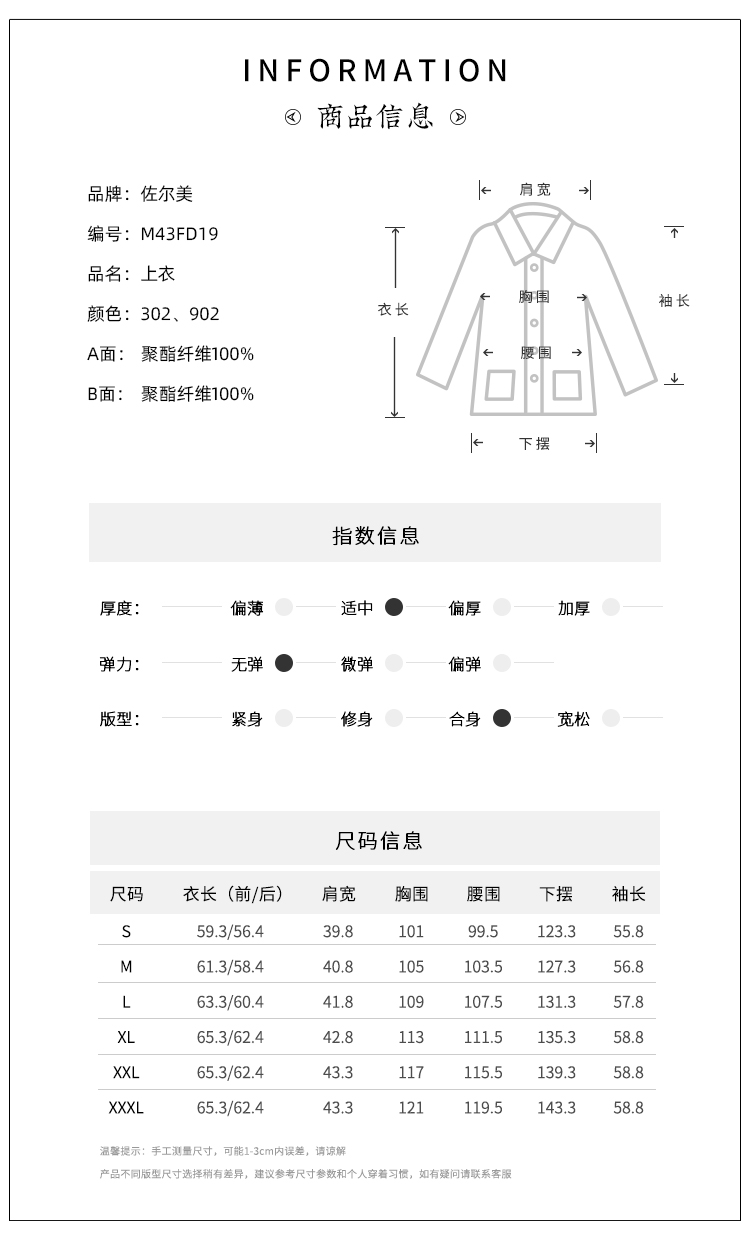 佐尔美新品秋冬新品薄纯色简约时尚妈妈装女外套E73FZ09