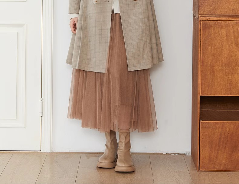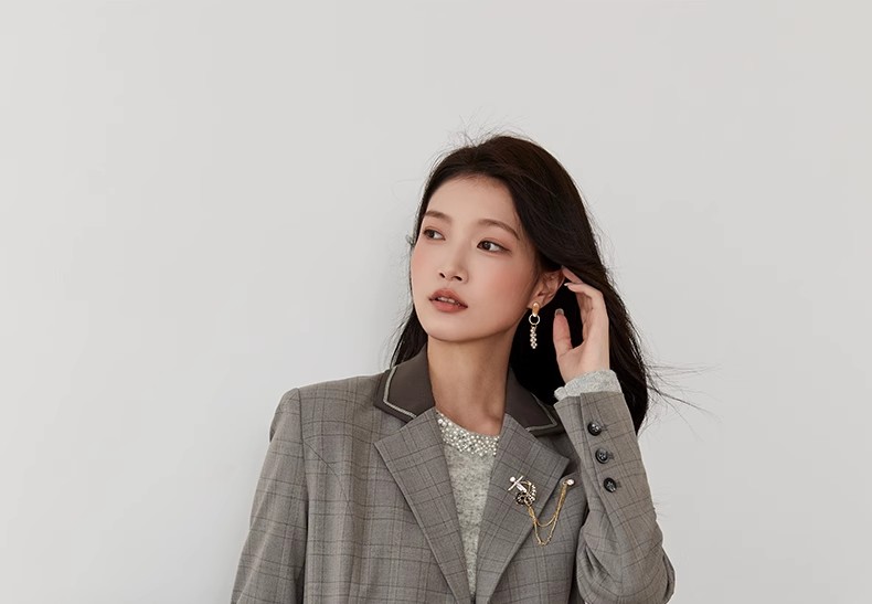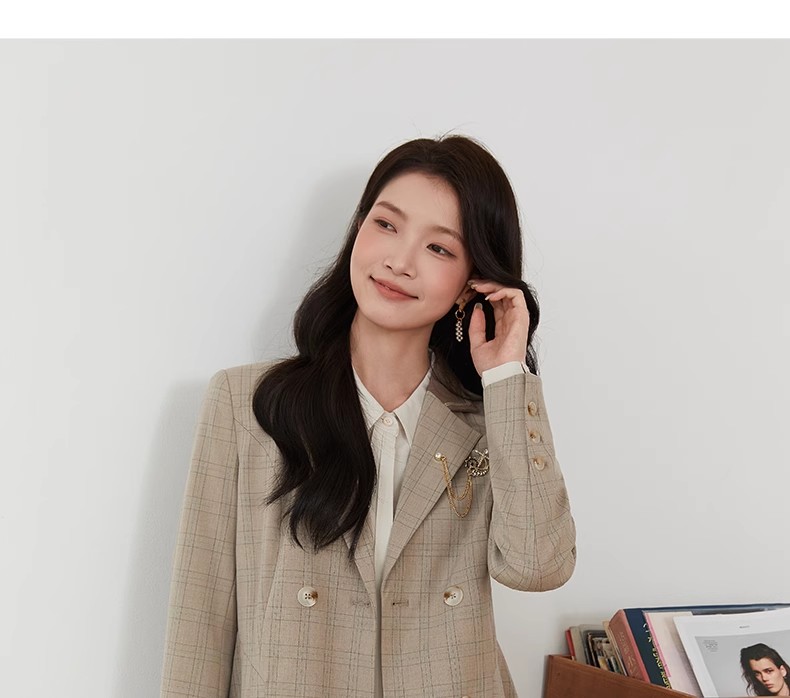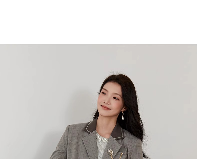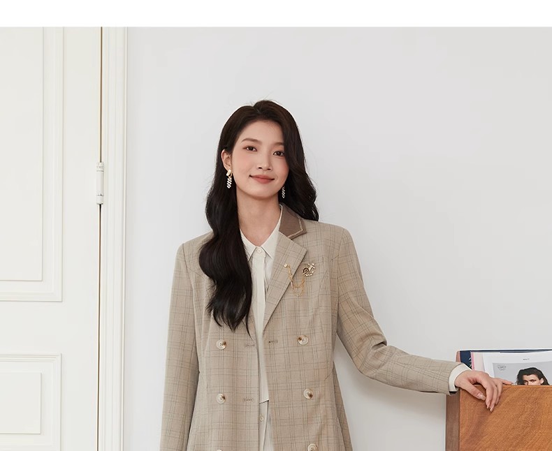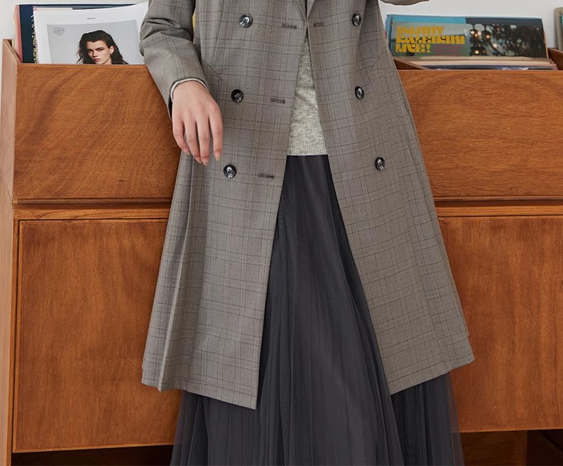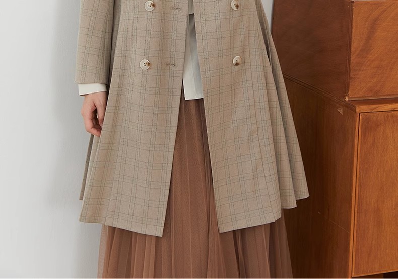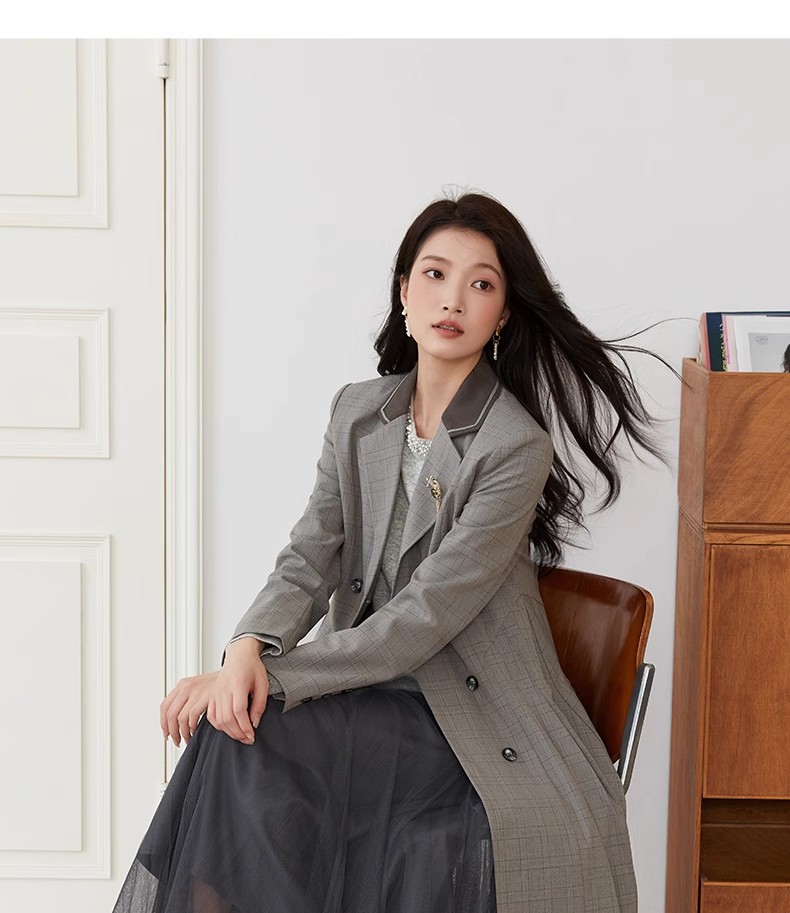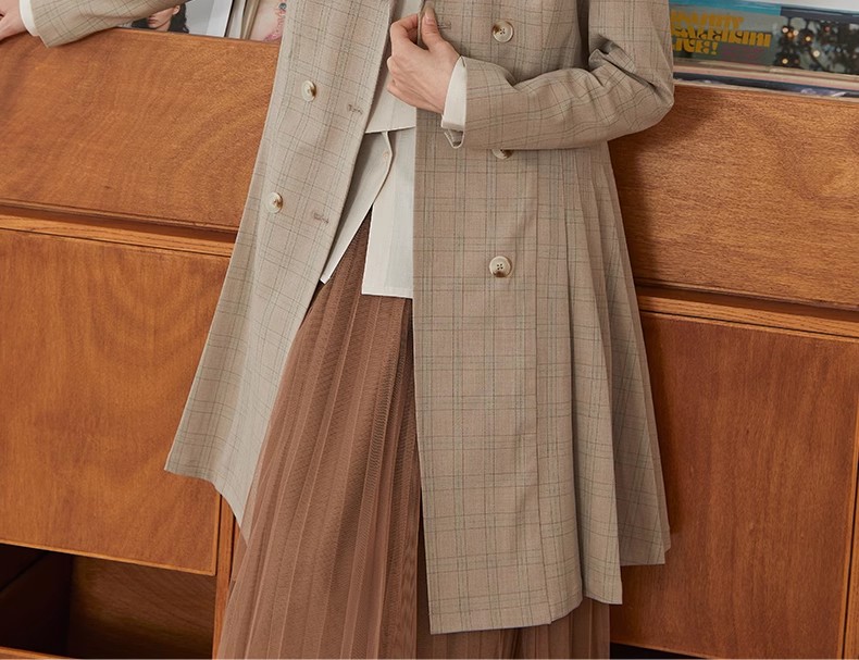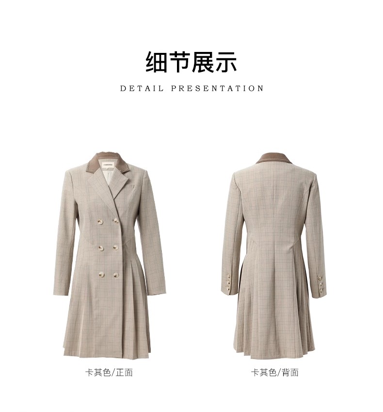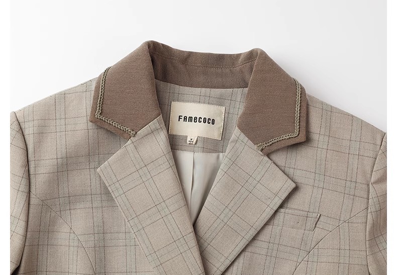 Famecoco范可儿英伦格纹风衣中长款学院风西装领外套FAB6AW006