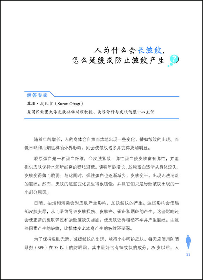随着年龄增长,人的身体会自然而然地出现一些变化,譬如皱纹的出现。而像日晒和抽烟这样的外界影响,则会使皱纹增多并变得更加明显。胶原蛋白是一种蛋白纤维,令皮肤紧致;弹性蛋白使皮肤富有弹性,并能提供皮肤保持水润所必需的糖胺聚糖。随着年龄增长,胶原蛋白逐渐从身体流失,皮肤变得薄而脆弱;与此同时,弹性蛋白也逐渐减少,皮肤变干,出现无法消除的皱纹。然而,皮肤的这些变化发生得很缓慢,并且它们只是导致皱纹出现的一小部分原因。日晒、抽烟和污染会对皮肤产生影响,加快皱纹的产生。这些影响会使局部皮肤变厚,从而终导致皮肤损伤、皮肤癌、雀斑和晒斑的产生。这些影响还会使正常的皮肤弹性和紧致度缺失加剧,使皮肤变得粗糙不平并产生皱纹。由这些因素产生的皱纹,比机体变老本身产生的皱纹还要深。为了保持皮肤光滑,减缓皱纹的出现,就得小心呵护皮肤。每天应使用防晒系数(SPF)在35 以上的防晒霜,其中好含有锌或钛的成分。25 岁以后,人们应使用维A 酸——一种维生素A 衍生物——作为一种抗衰老乳霜。这种药方人们已经使用了30 多年,效果显著。虽然在刚开始使用时可能会出现脱皮现象,但维A 酸终将逐渐减少细纹,缩小毛孔,并淡化褐斑。如果维A 酸治疗效果不够充分,还可以利用去皮术和激光治疗,促进胶原蛋白合成,改善皮肤状况。因为皮肤的正常脱落,会促使人体产生更多的胶原蛋白,而激光治疗能穿透皮肤进入略深位置,可以促进皮肤的这一反应。◎ 译者:田代贵