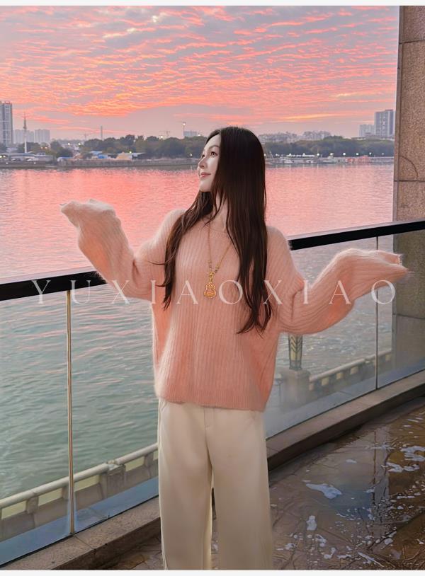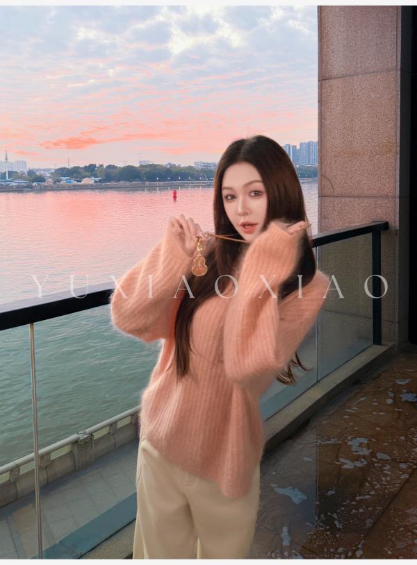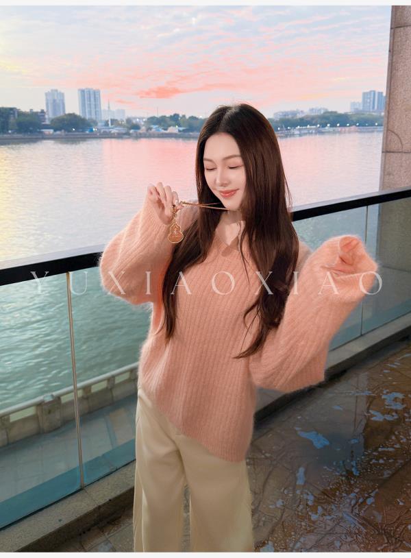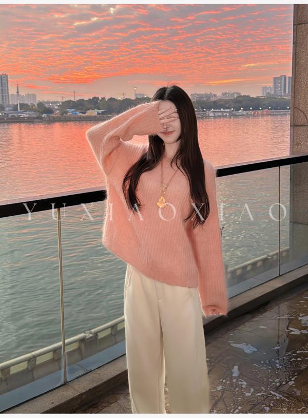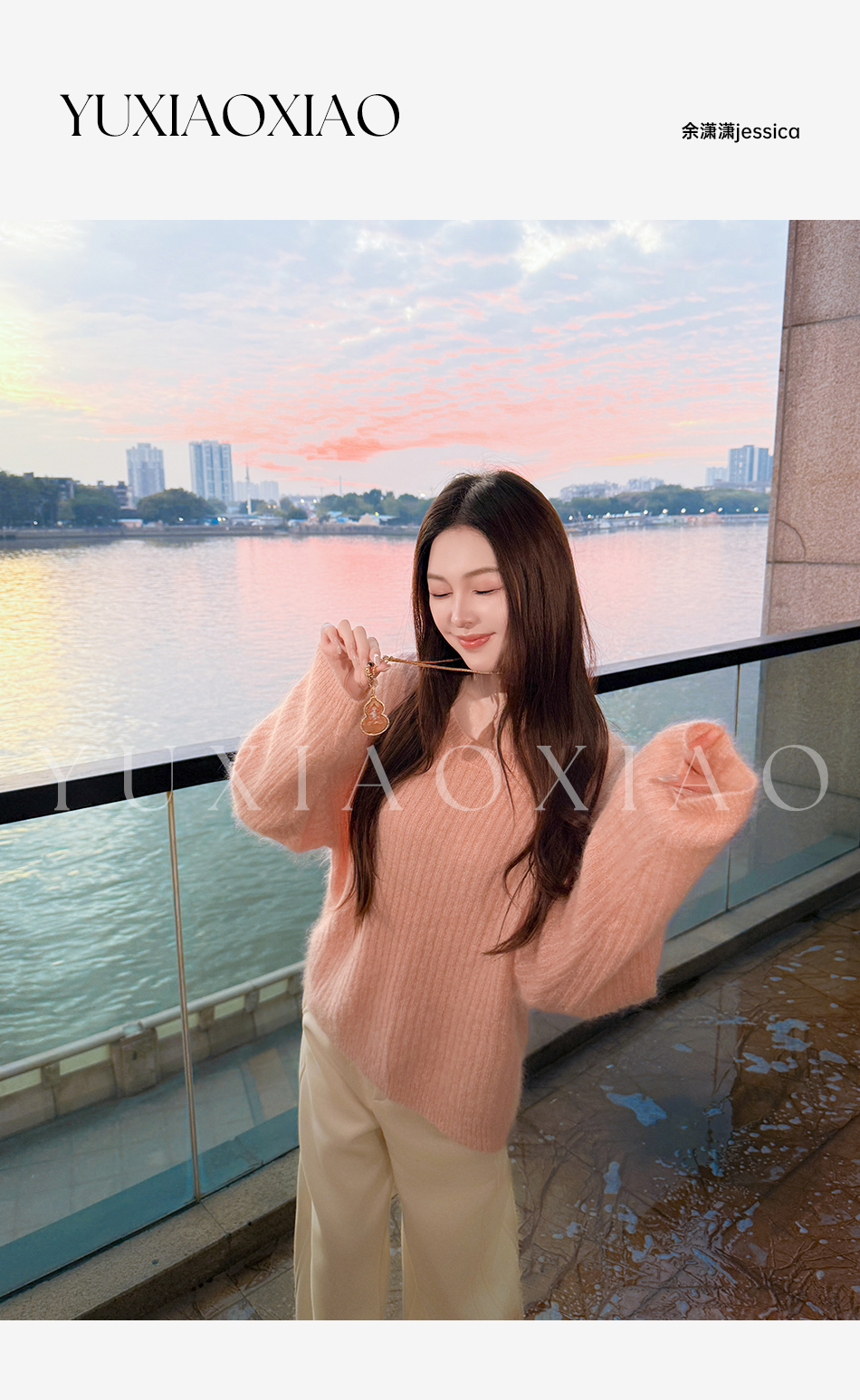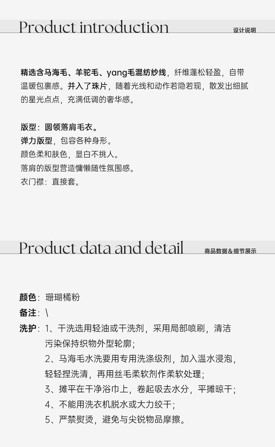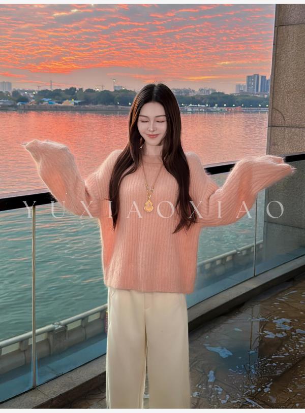 余潇潇【暮光私语】蓬松柔软马海毛羊驼毛羊毛混纺圆领慵懒落肩毛衣