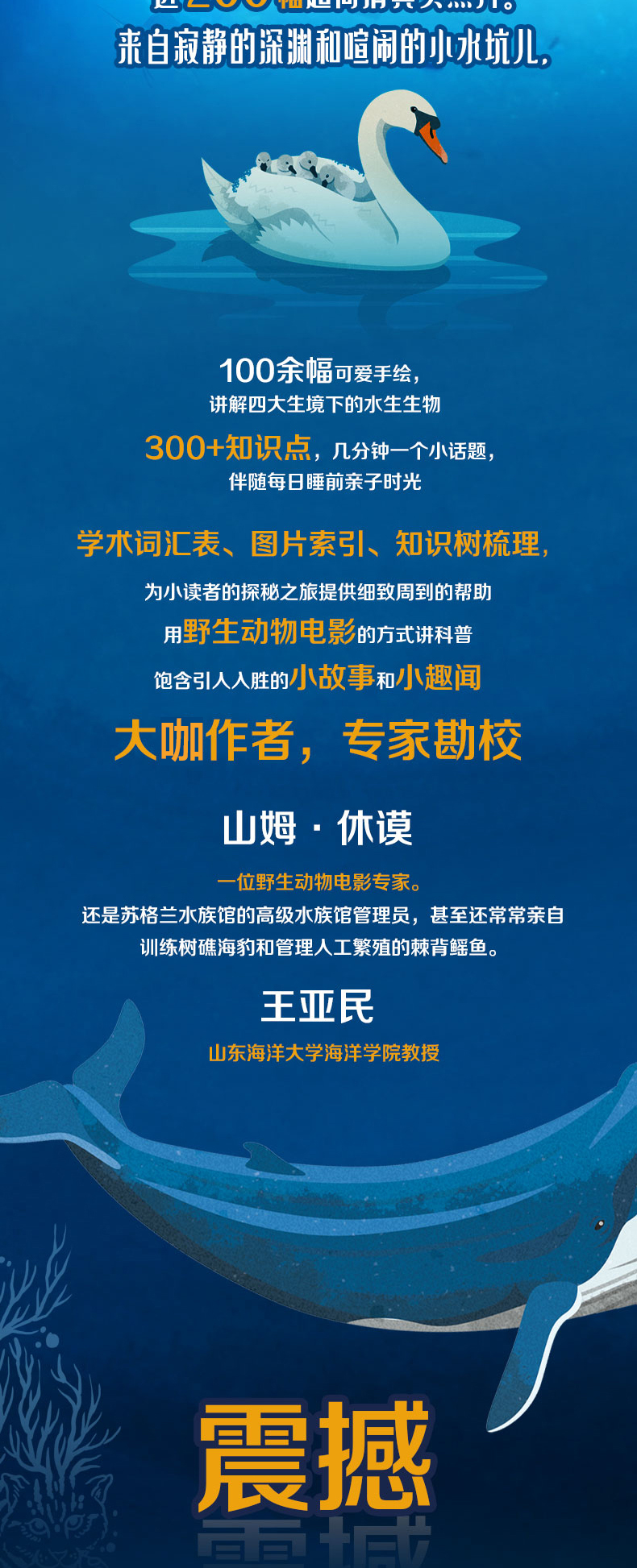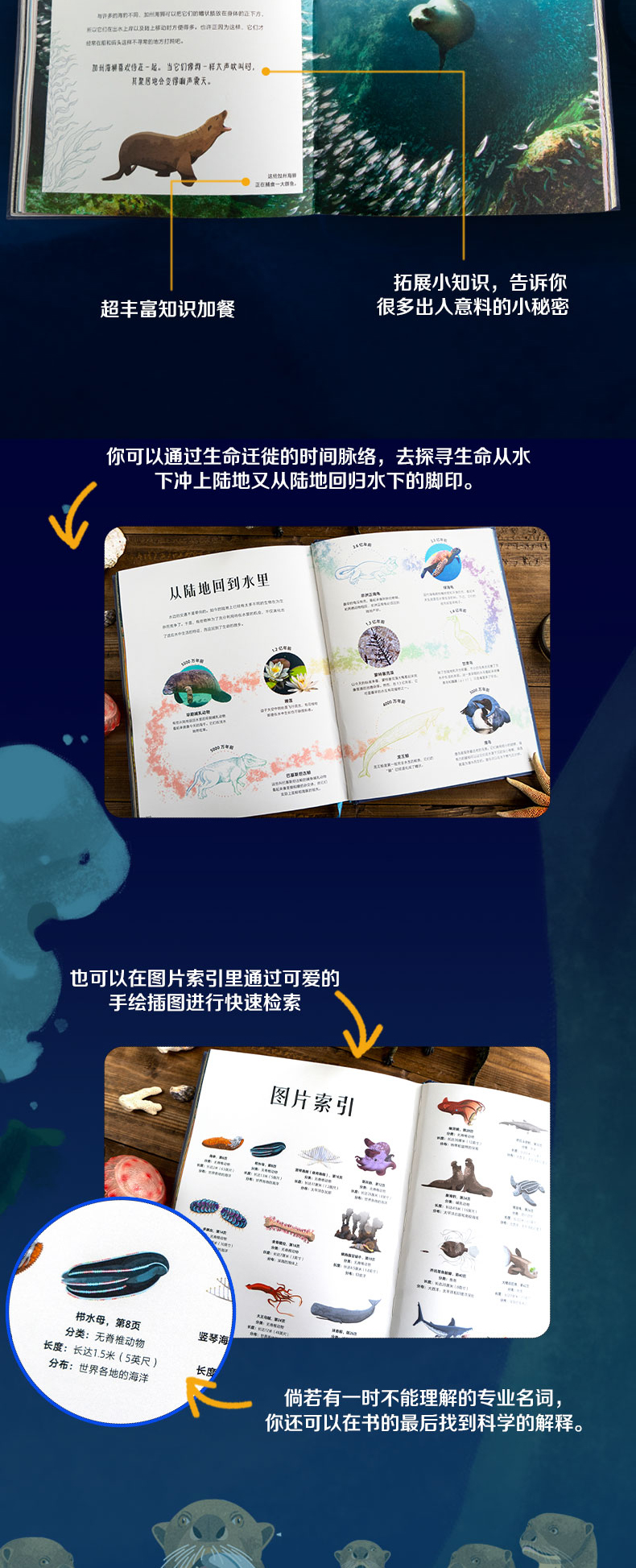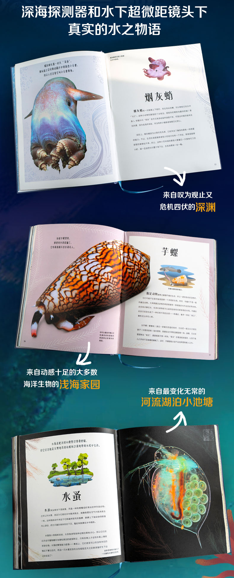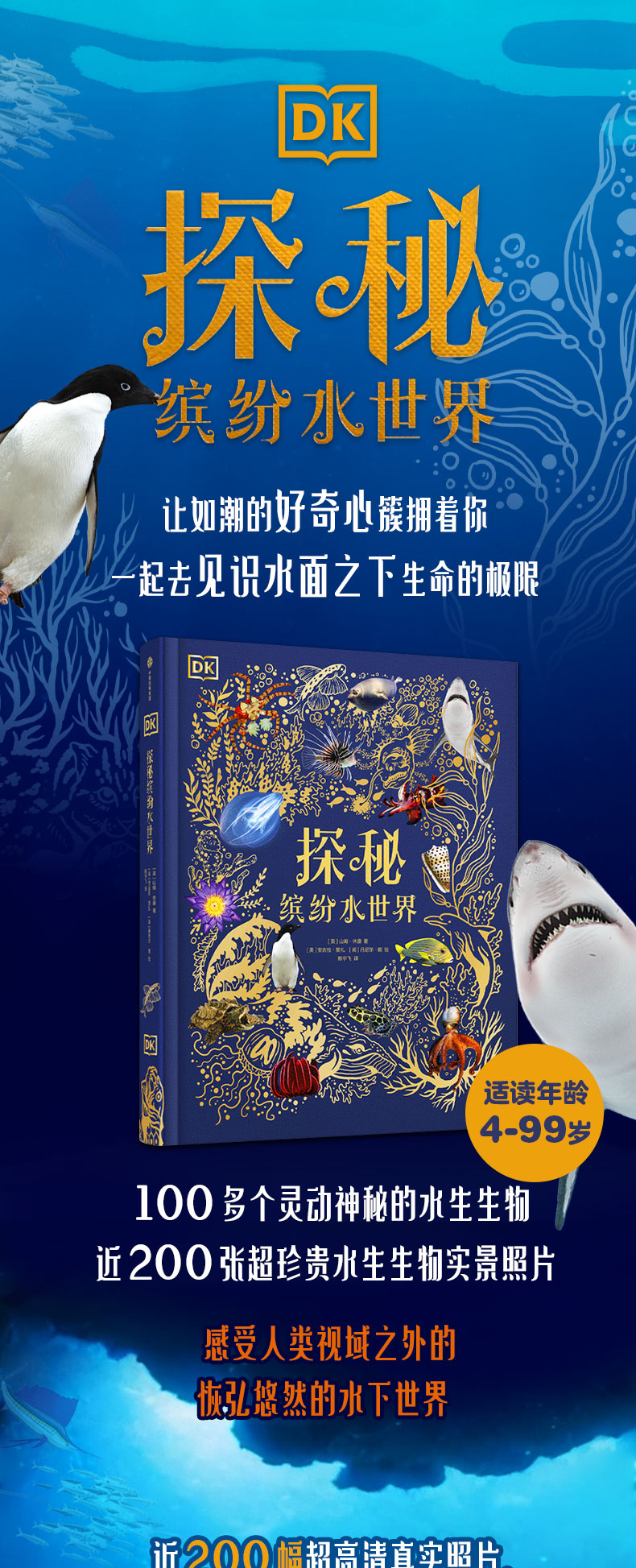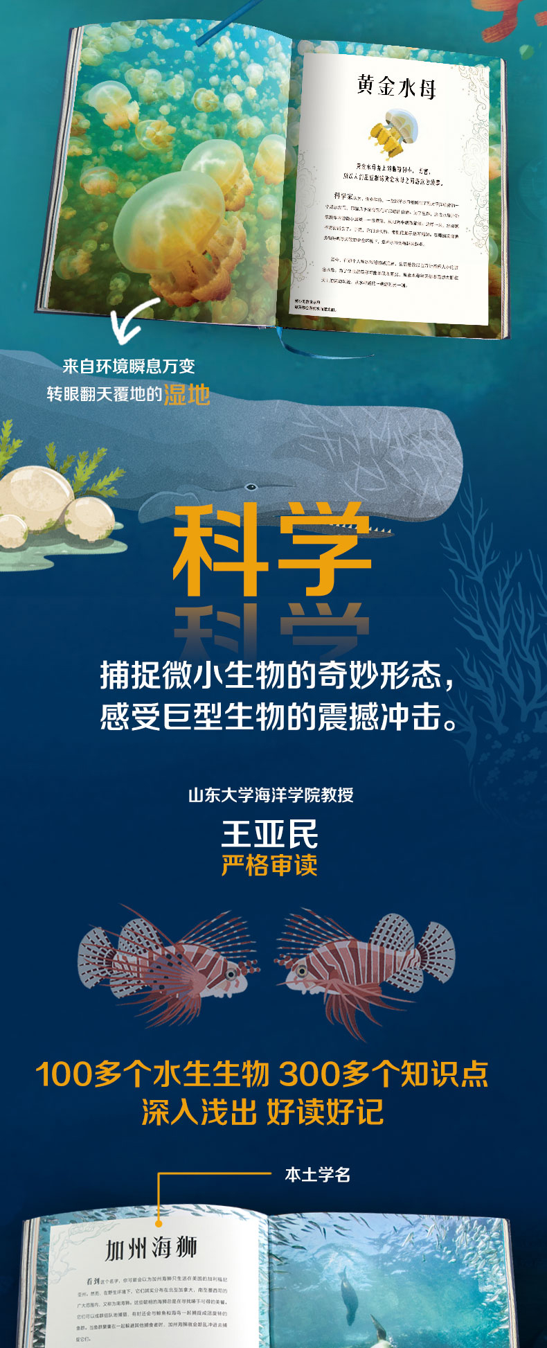 1、DK科普系列中好评如潮的畅销儿童科普 。 2、英国动物学专家撰写,中国海洋大学审校。 为了更贴近中国小朋友的知识体系和认知理解,还特别邀请了中国海洋大学王亚民教授,对全书进行了全面详尽的知识审校,确保交到孩子们手中的是与时俱进、准确、科学的水生生物知识。 3.科普得很通俗,内容儿童友好,是孩子非常容易读懂的水生生物科普。 (1)厚厚一本书的大幅精美水世界真实照片,让小朋友身临其境,仿佛置身水面之下细细探索。 (2)像讲故事一样讲科普:摆脱教材式严肃的讲解方式,摆脱零碎纷乱的知识点。以充满人文气息的方式,讲水面之下生命的奥义,不仅能让读者看到它们真实的样子,学到知识,还能了解许多许多古老的传说和小秘密。 (3)贴心的版面编排,拓展丰富的趣味小知识。 (4)知识点与时俱进,紧跟时代。 (5)脉络清晰,给孩子构建完整系统的水生生物知识。 4.科普书中的颜值担当,值得珍藏的水生生物大书。 封面布面压纹特种纸,摸起来手感就很好。书的正面、背面、书脊三面都是烫金,书页侧边三面滚金边儿,美到无与伦比。大开本,特别好摊平,可以完全打开平铺在桌子上慢慢欣赏书中精美震撼的图景。