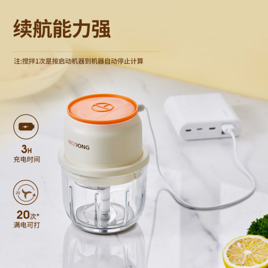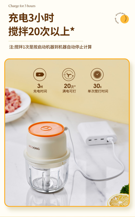 USB充电设计,随时随地方便使用超长续航, 充电三小时,续航一个月,可搅拌20次以上, 绞蒜、绞姜圈绞肉、辅食一按即打,粗细可调