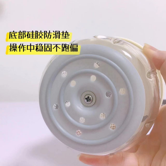 玻璃杯体底部配有硅胶垫,操作时稳固不易跑偏 硅胶能有效防滑并有静音功效,不用担心搅拌食物的时候机器逃跑啦