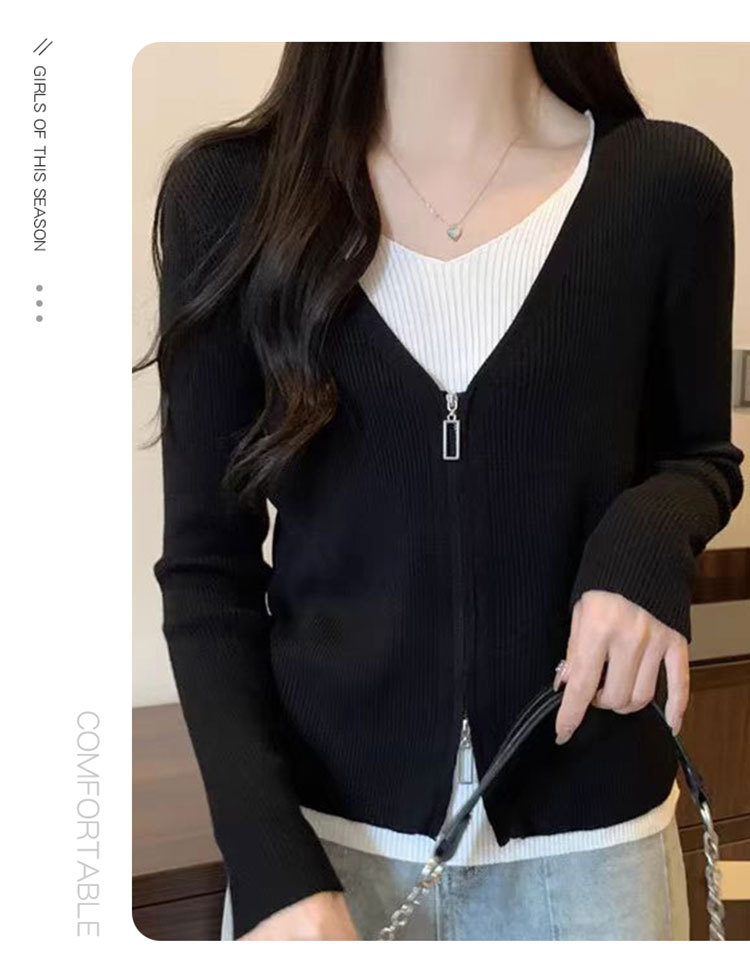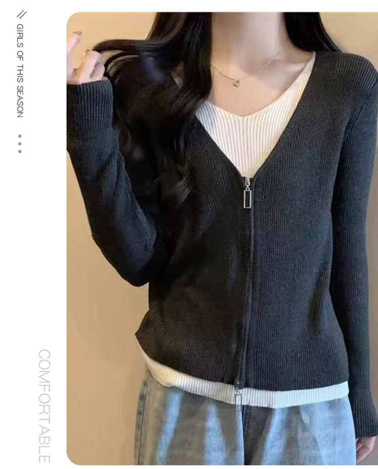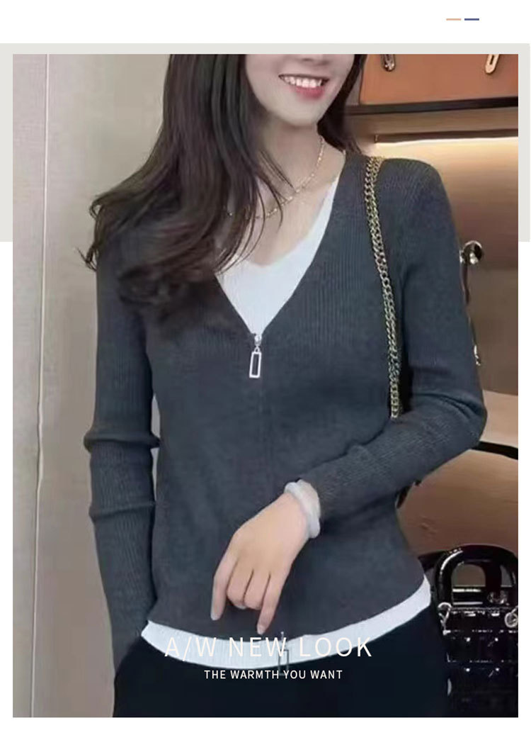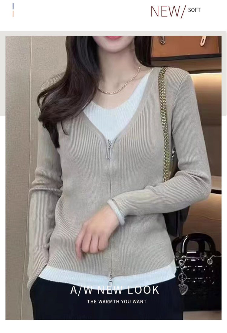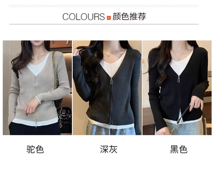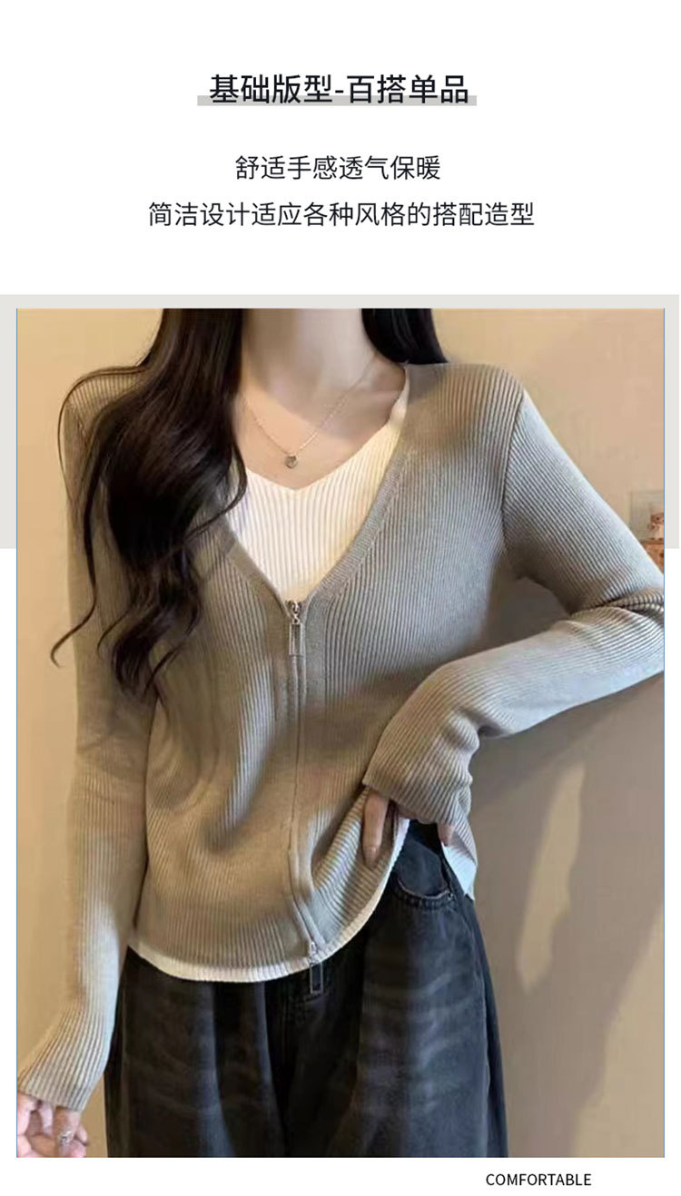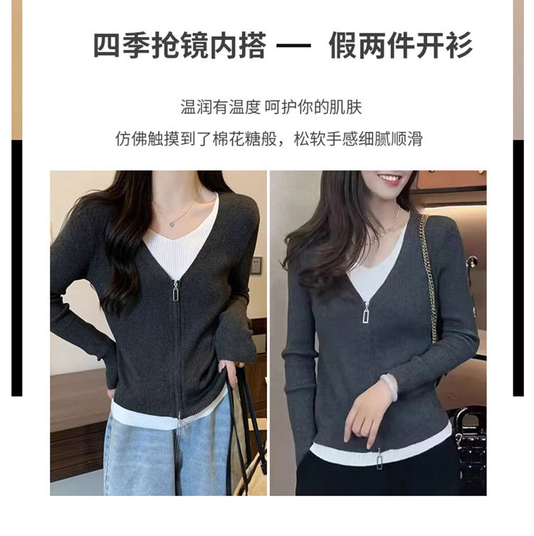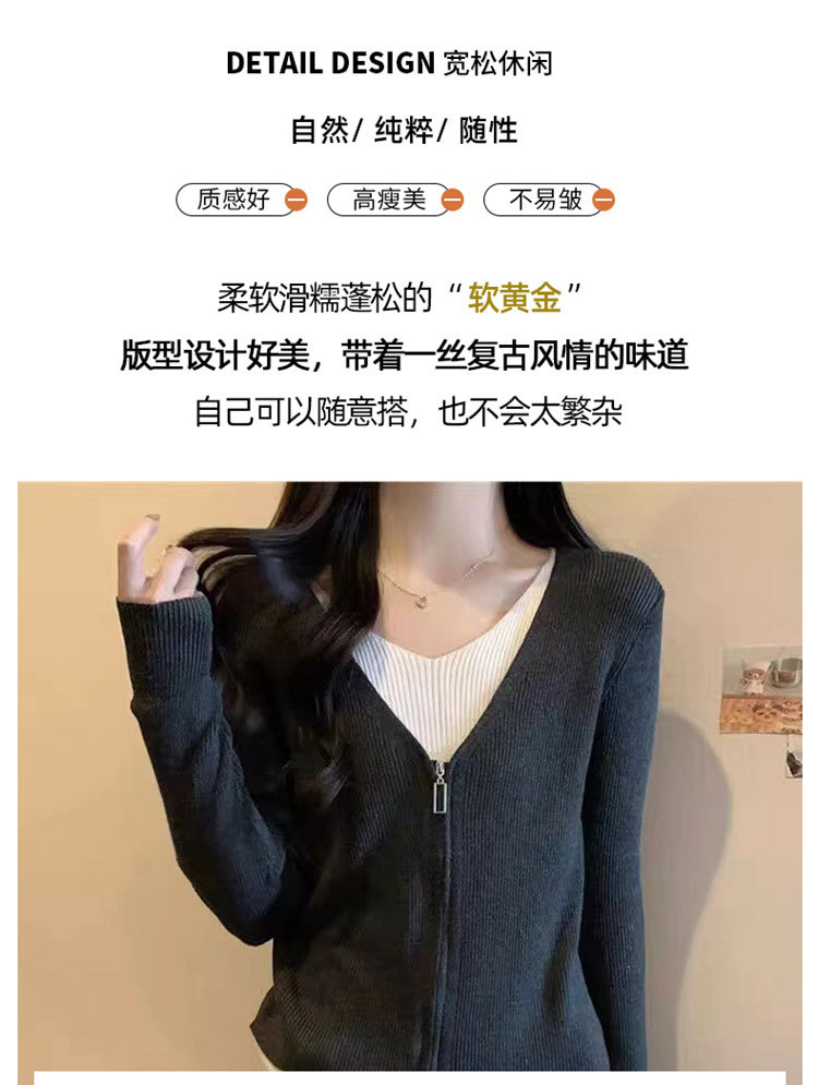 【 V领假两件针织衫 】秋冬慵懒风穿搭 拉链外套新款简约洋气修身显瘦