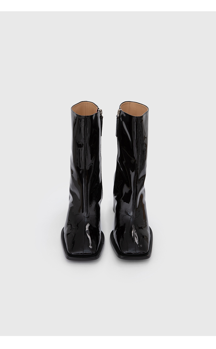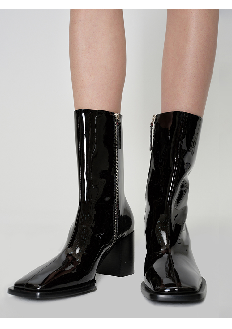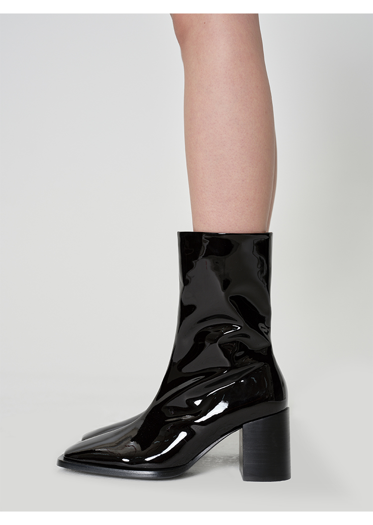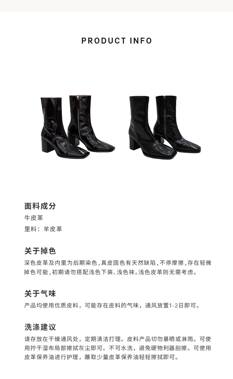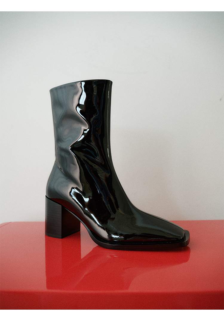 HIDEMI 超显瘦进口牛皮哑光亮皮方头粗跟方跟踝靴短靴 黑色/暗深酒红