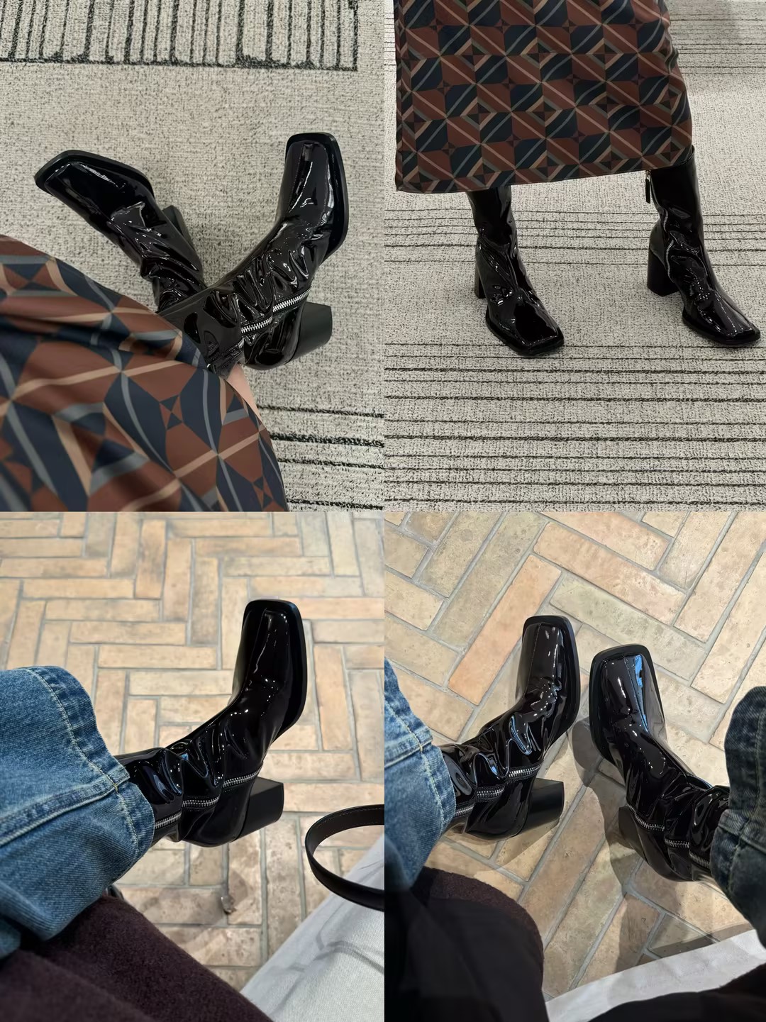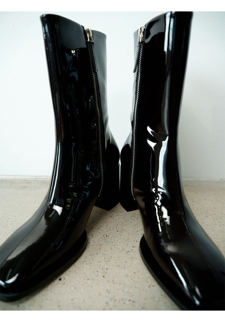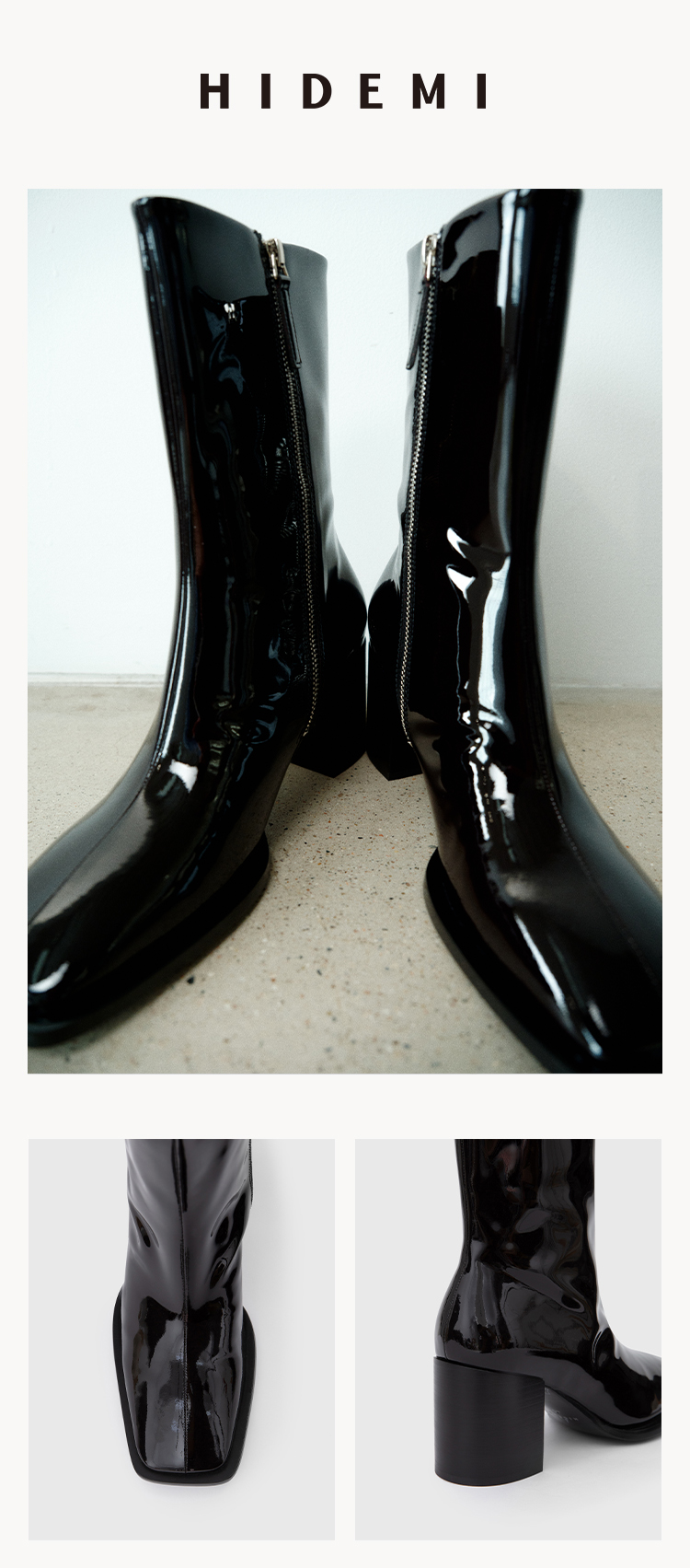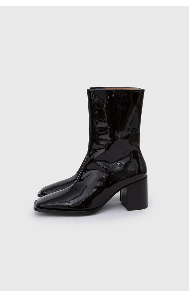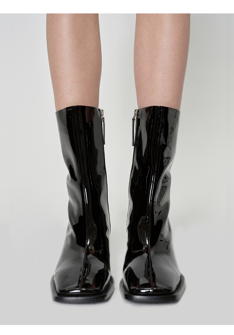 HIDEMI 超显瘦进口牛皮哑光亮皮方头粗跟方跟踝靴短靴 黑色/暗深酒红