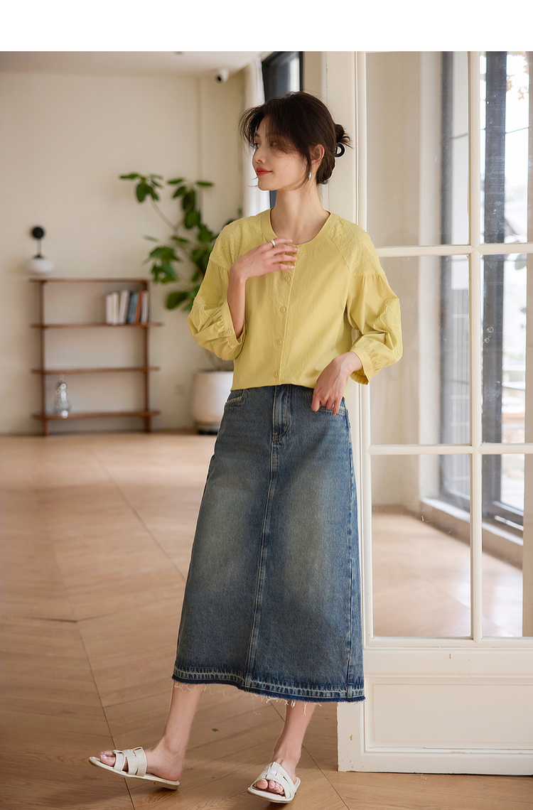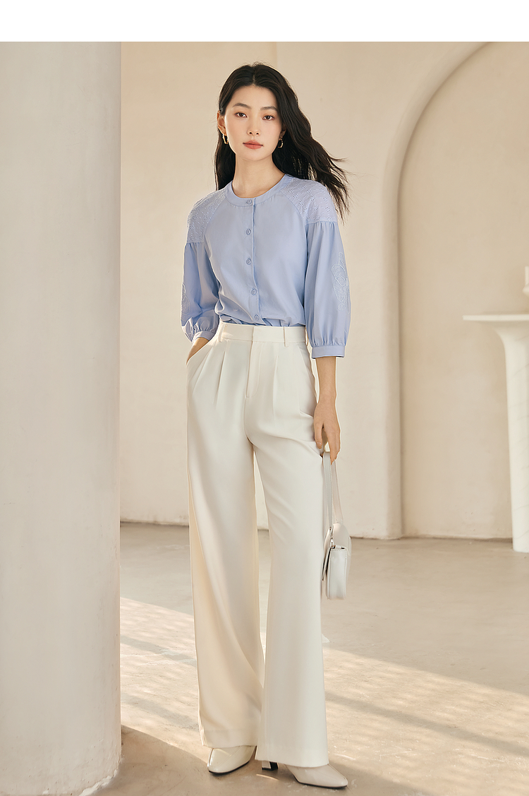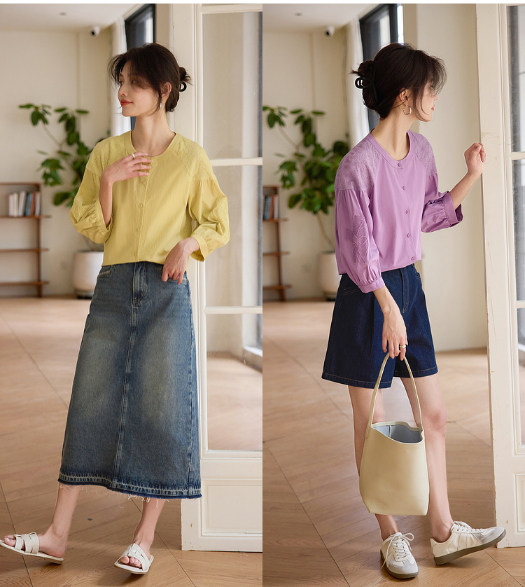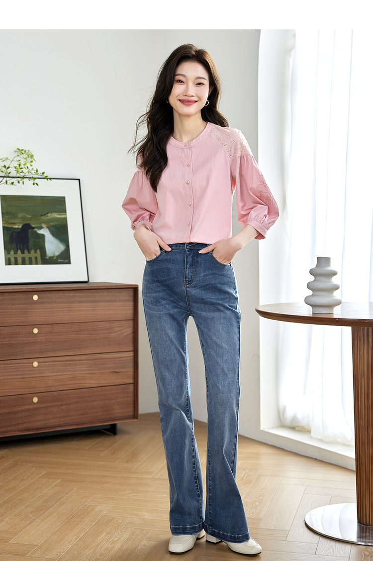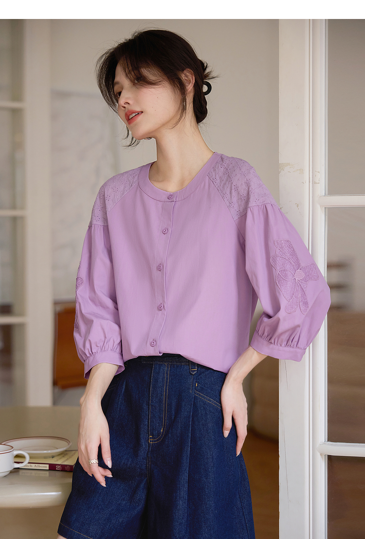【周四狂欢价】熙世界绣花七分袖天丝衬衫女高级感减龄洋气中袖上衣2025秋新款